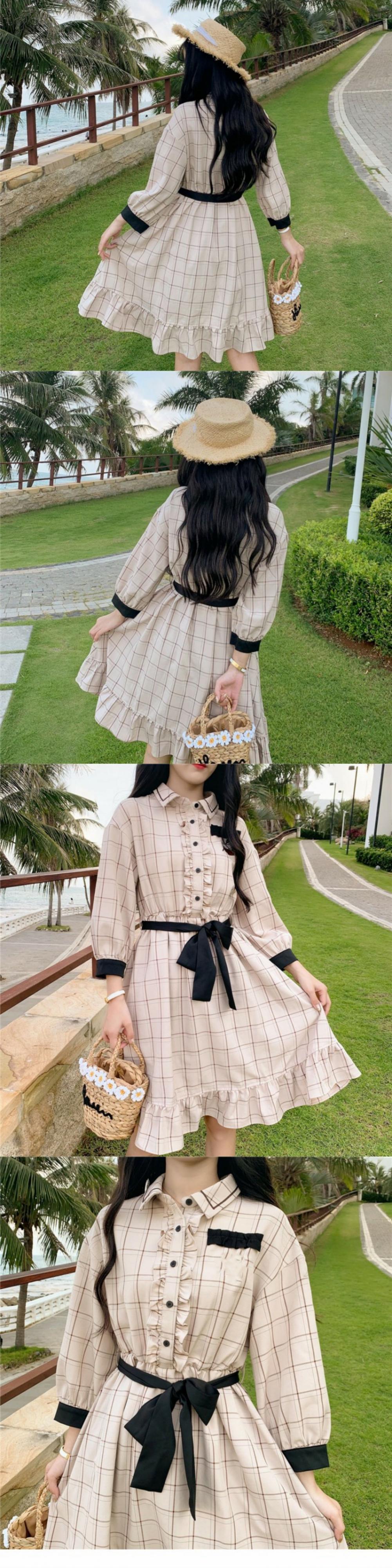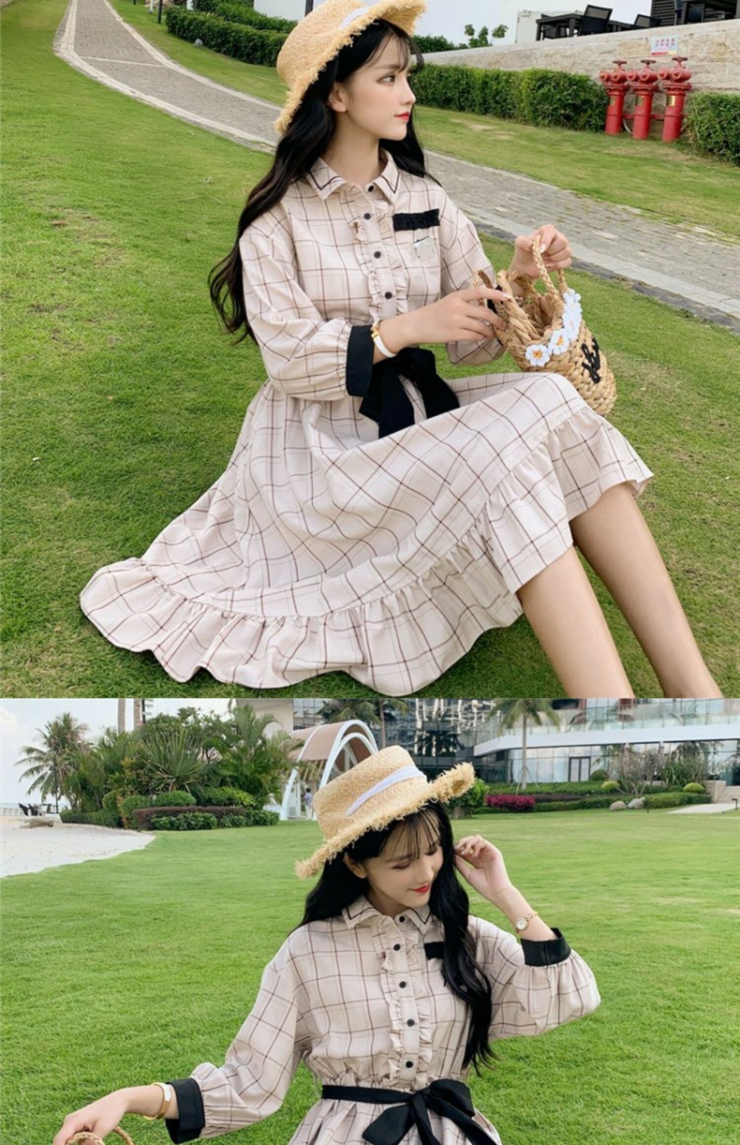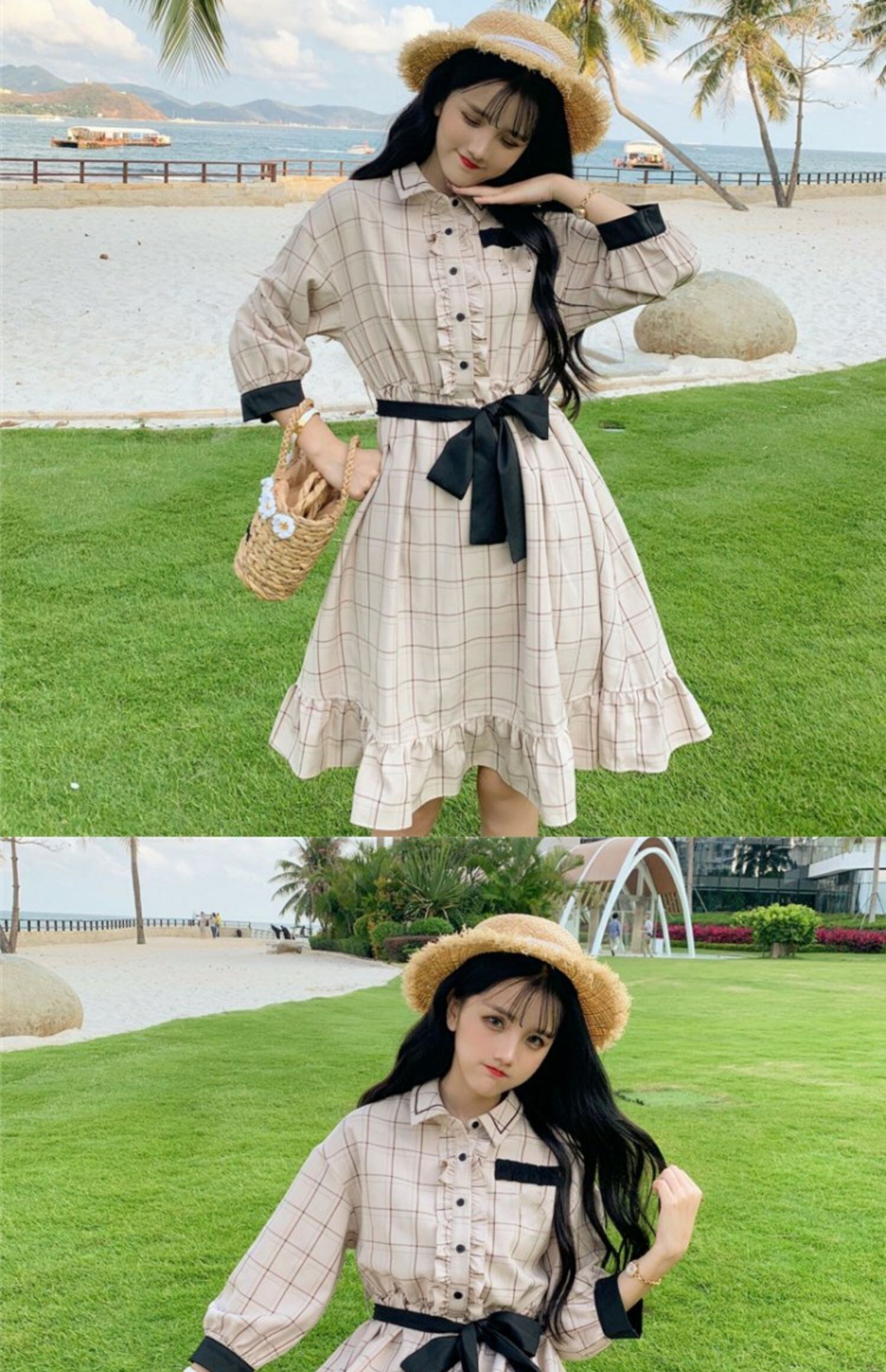 スカート スプリングオータムドレス 格子柄半袖スリーブスタンダード ショート レトロ ハーフスリーブ 春物 秋物 萌量不足80240087417