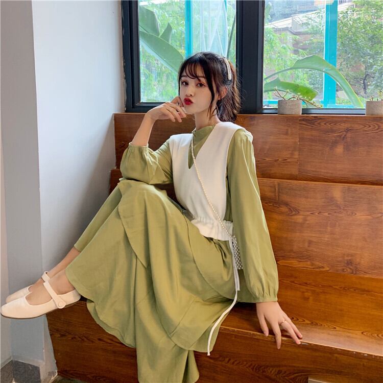 色:グリーンベスト,白いベスト,緑のドレス,アプリコットドレス