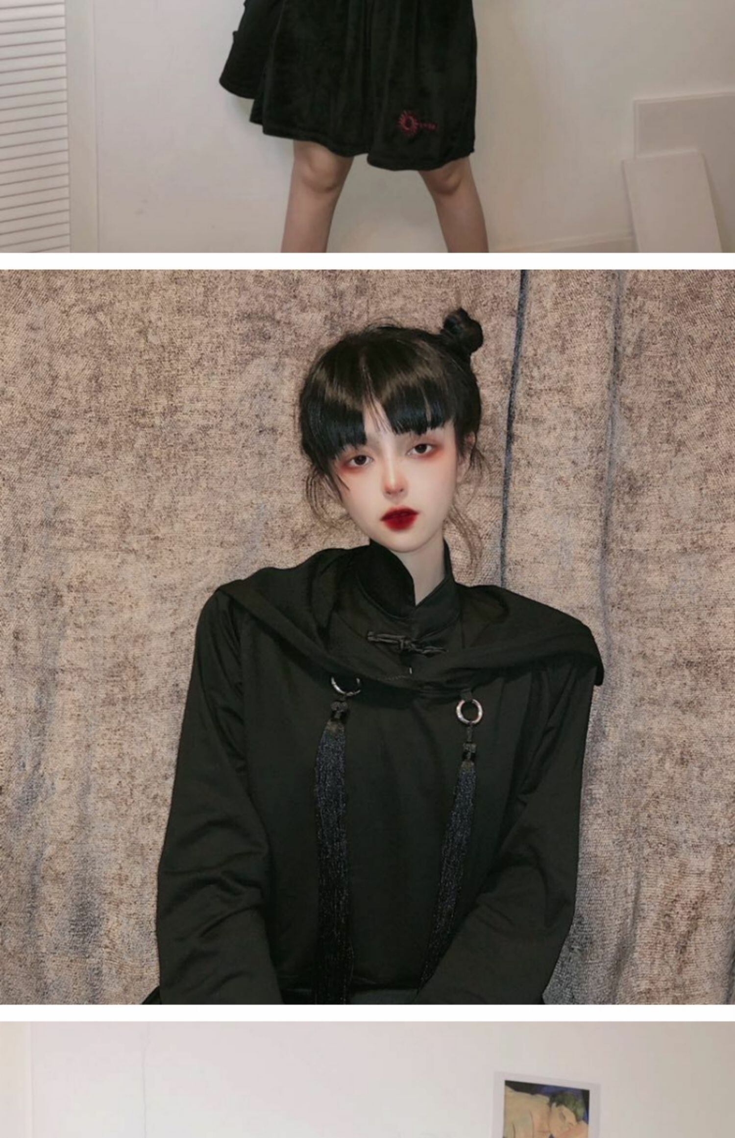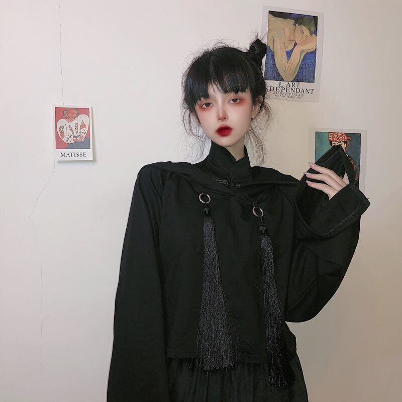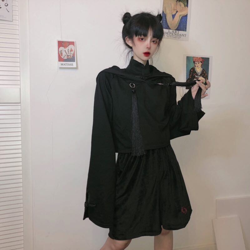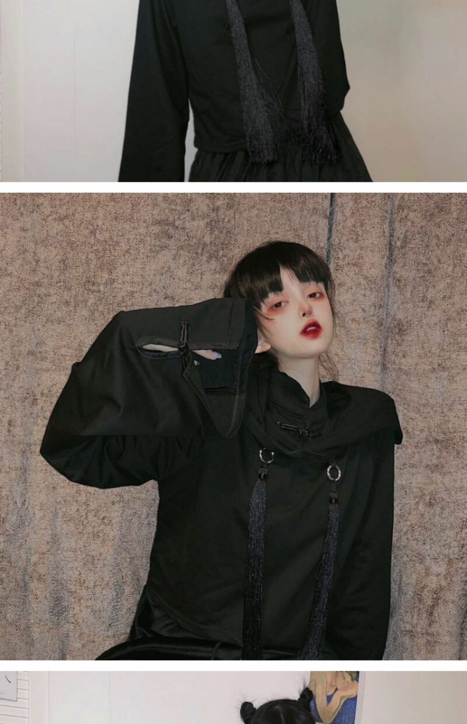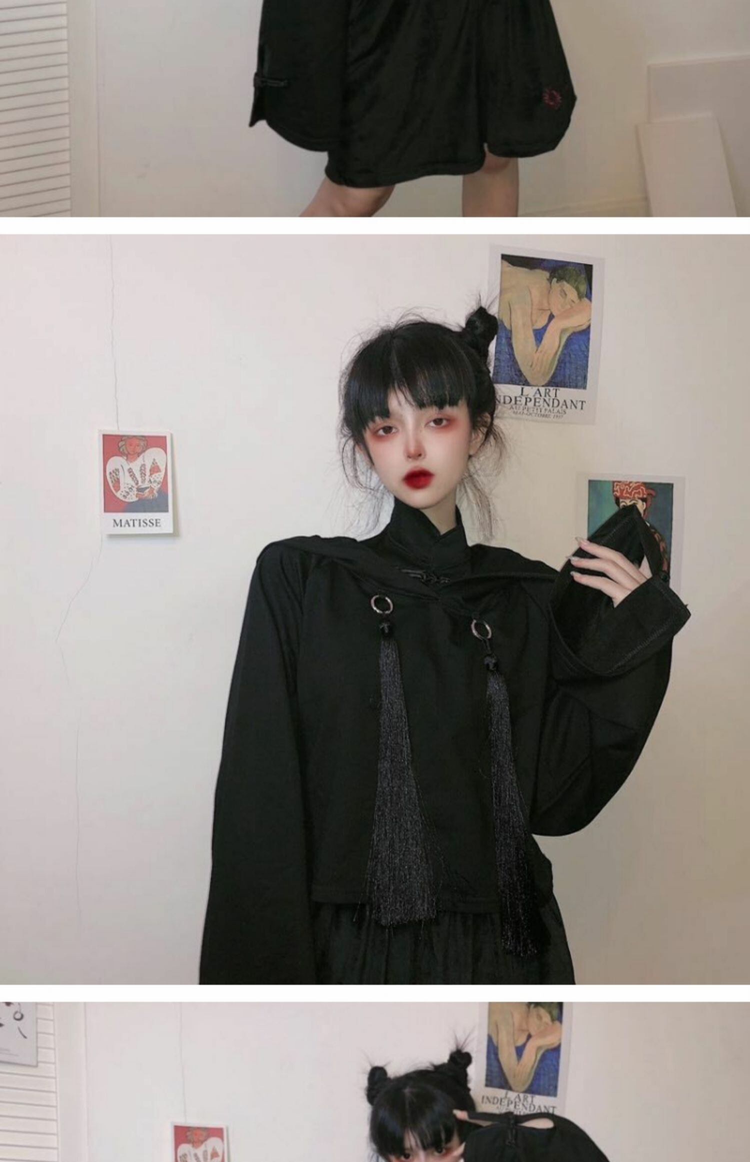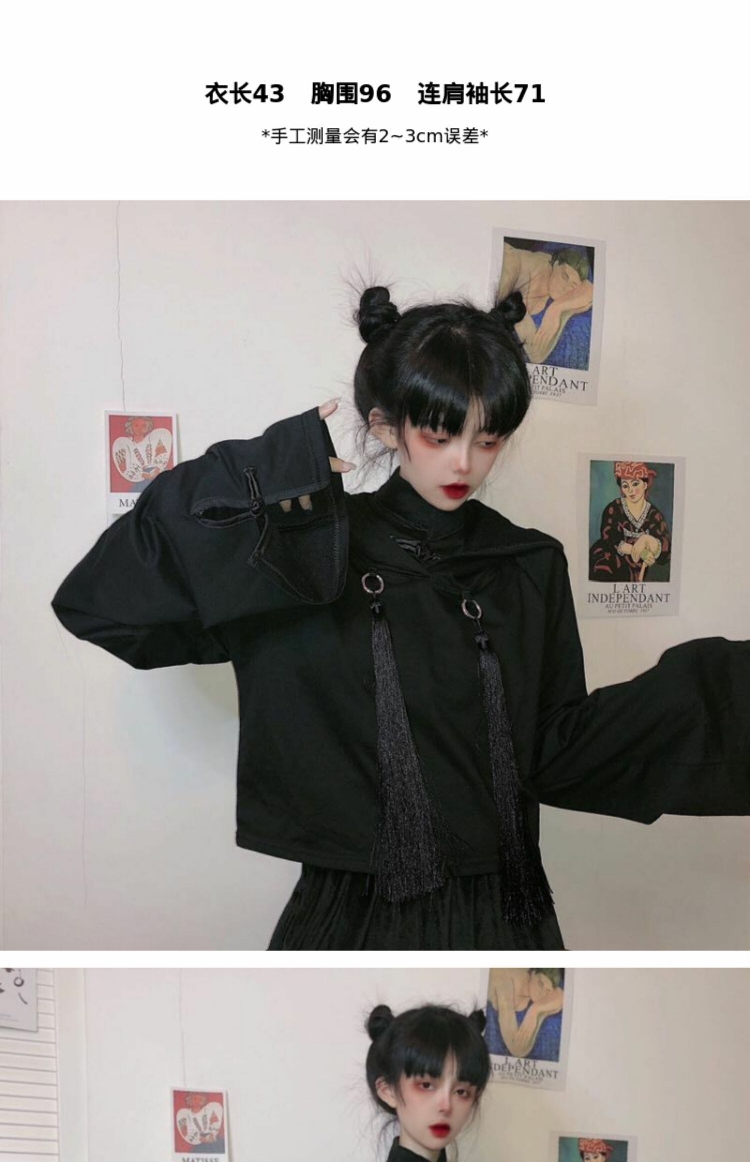 ダークブラックテルレトロディスクボタンルーズバージョンのセーター女性春と秋薄い短い刺繡フード付きトップインタイド 萌量不足39636781400