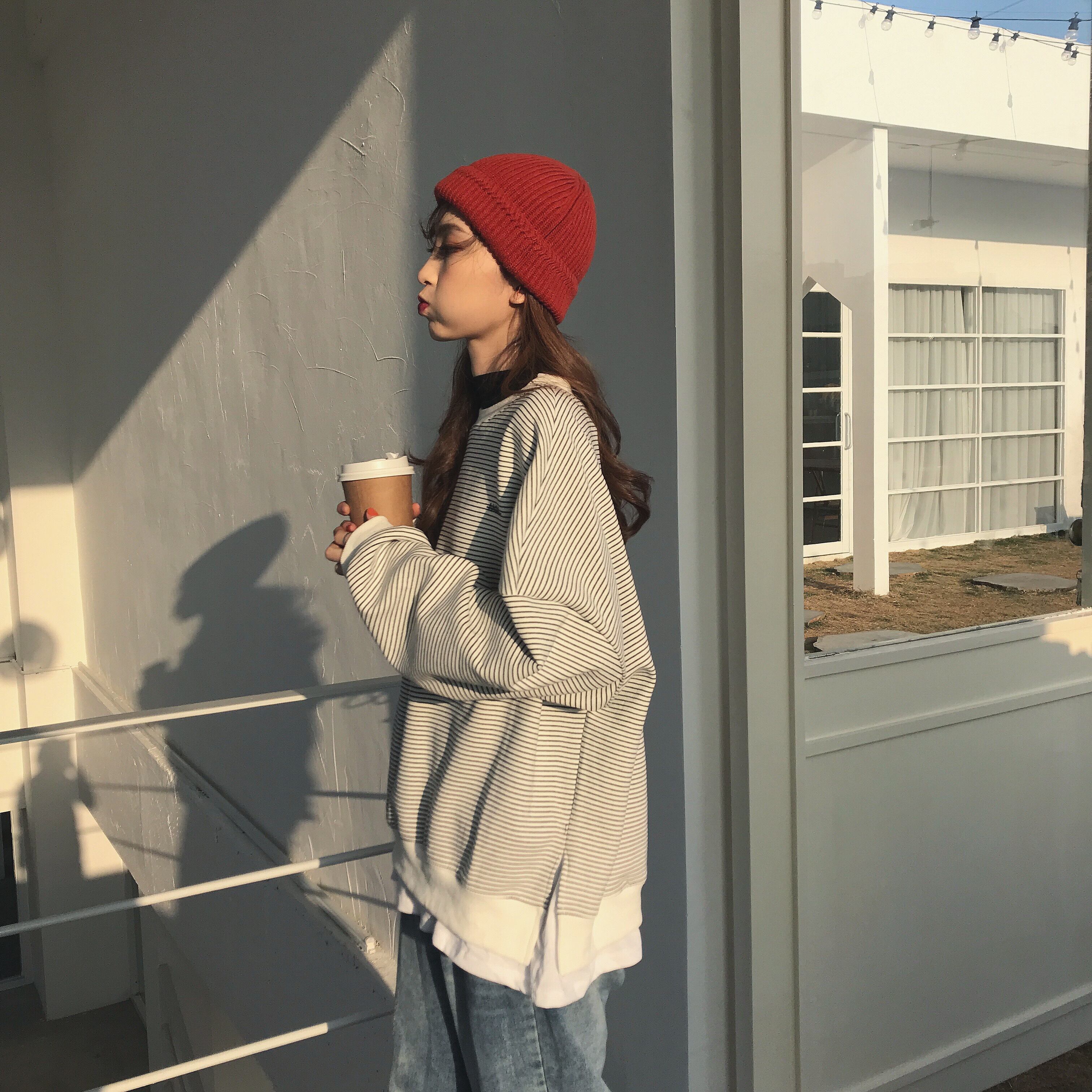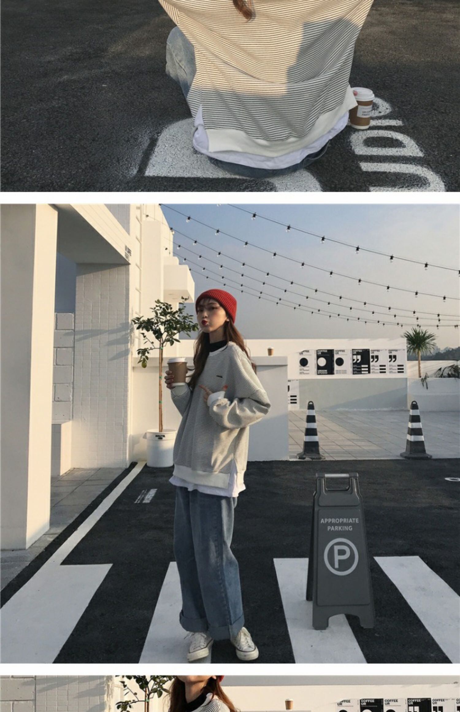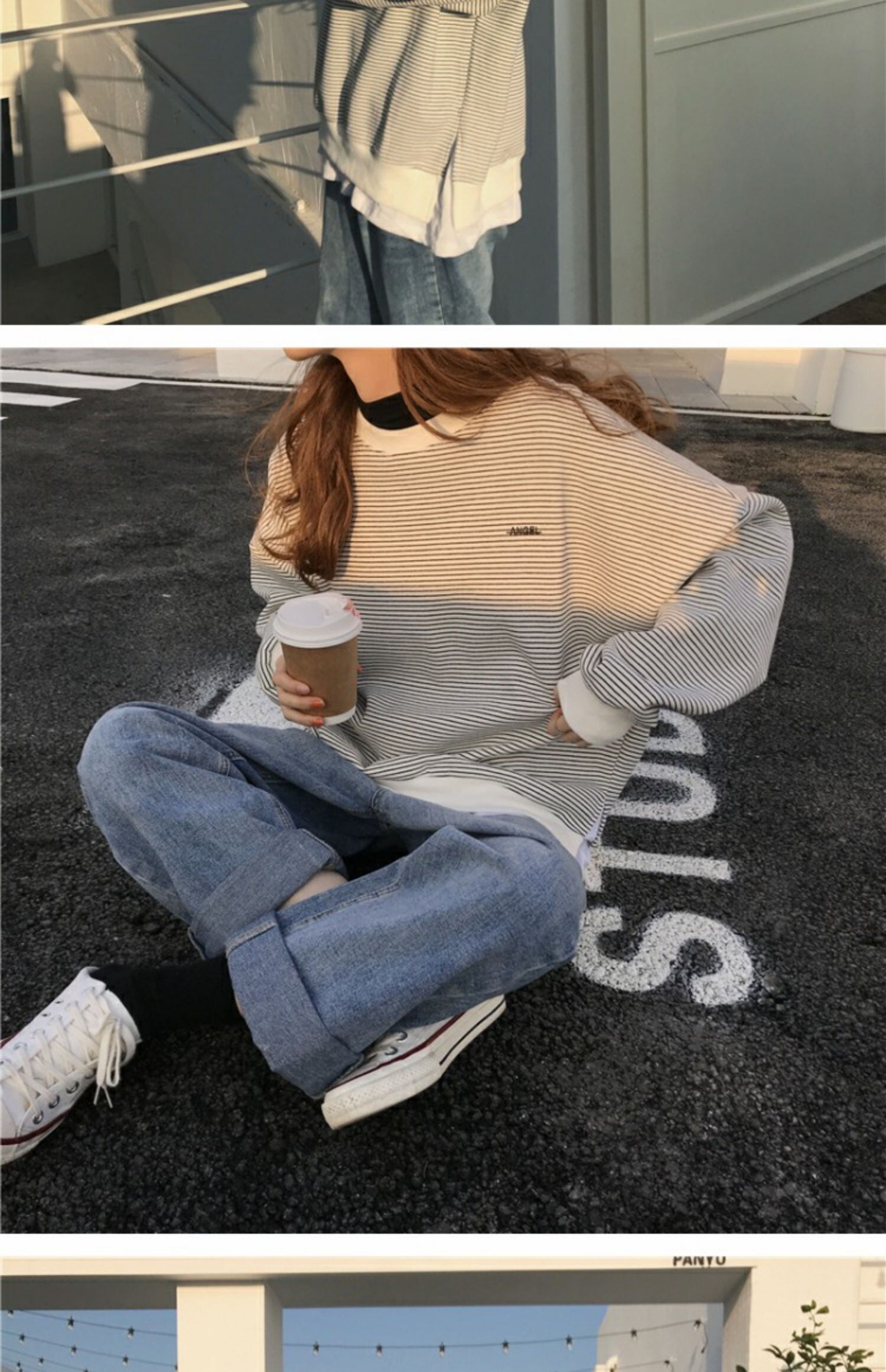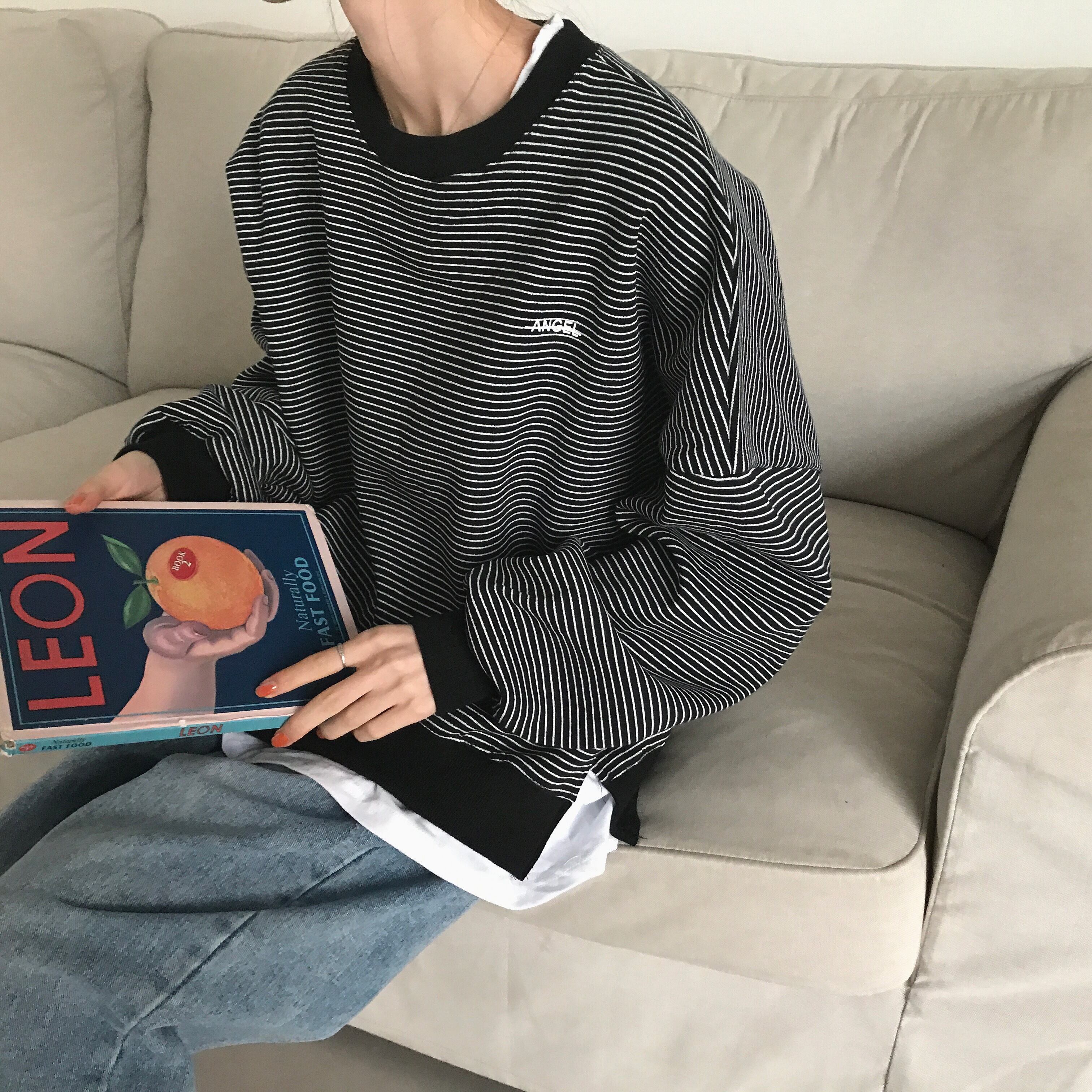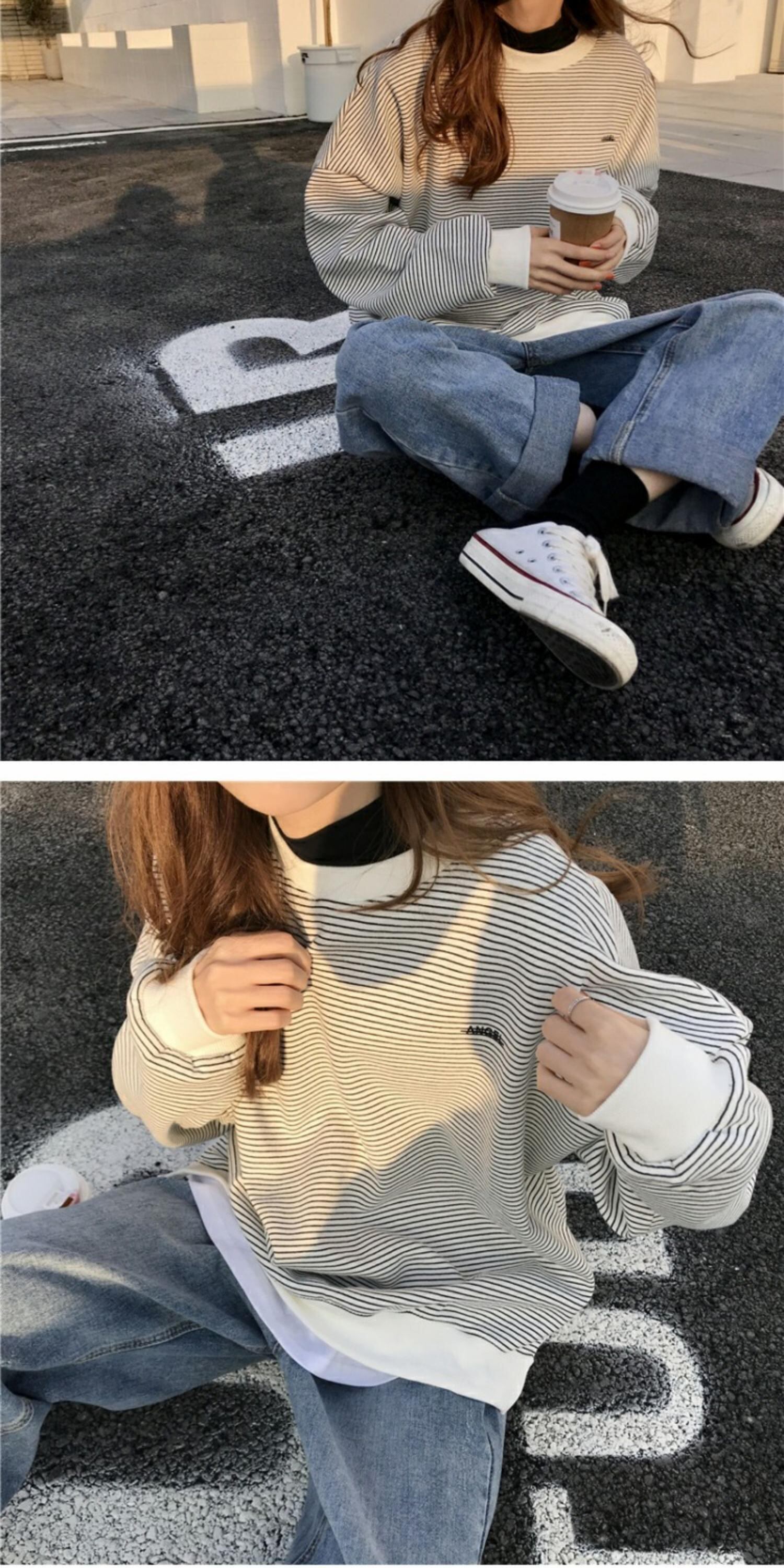 シックなセーターレディース2020年秋冬新作ステッチフェイクツーピースストライプ原宿スタイルルーズプルオーバートップトレンド 萌量不足6603916558