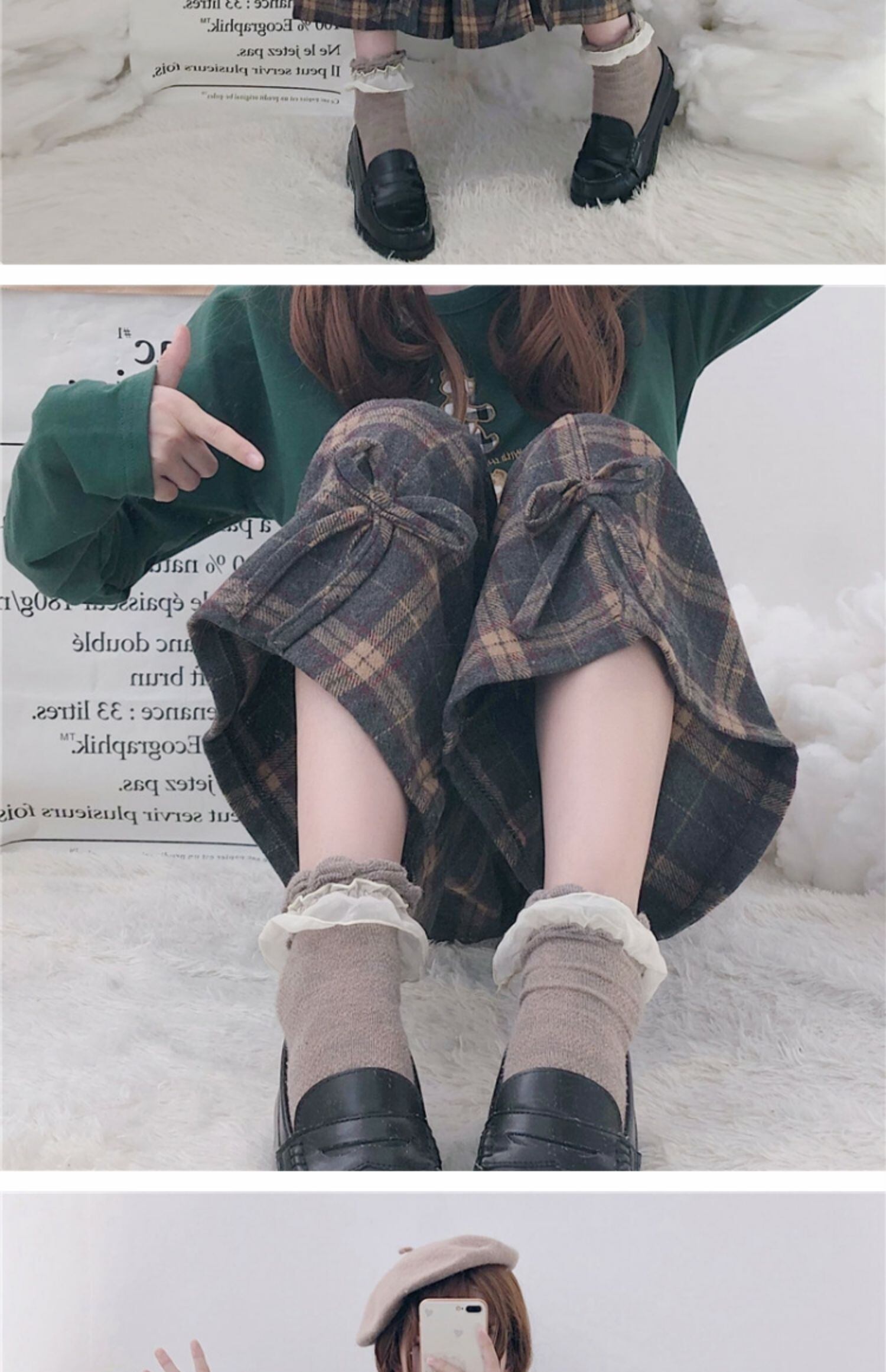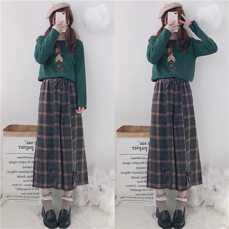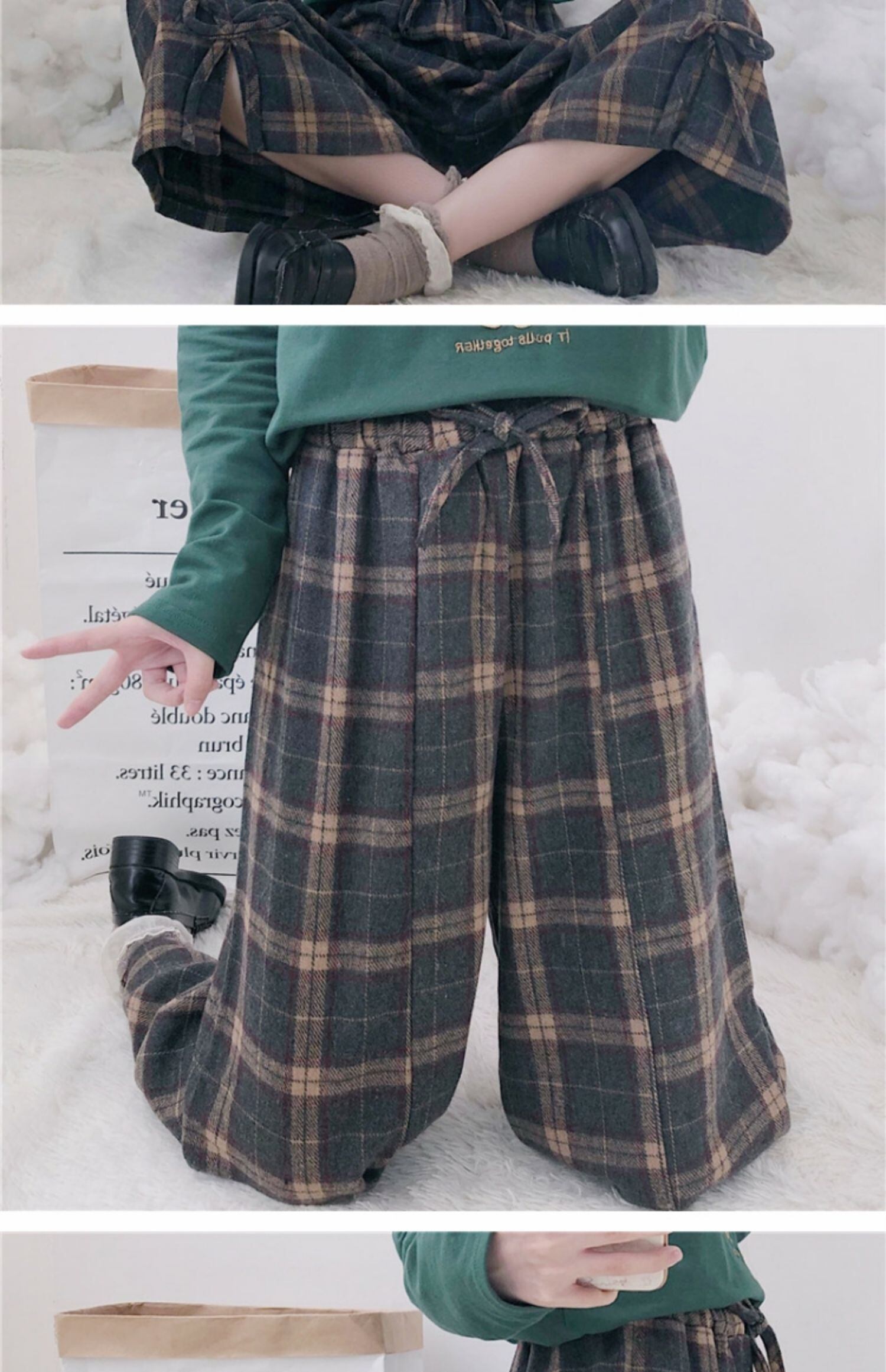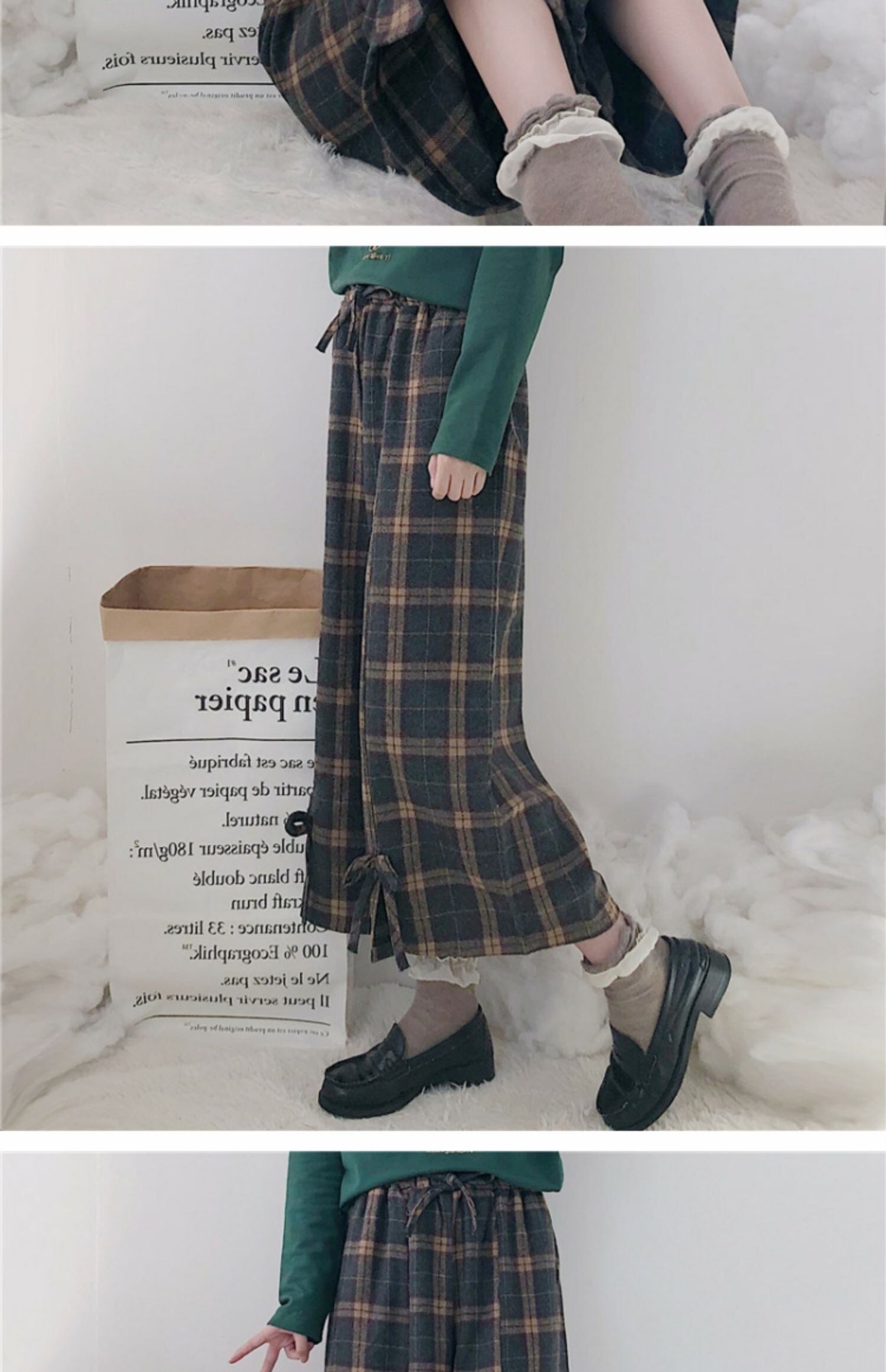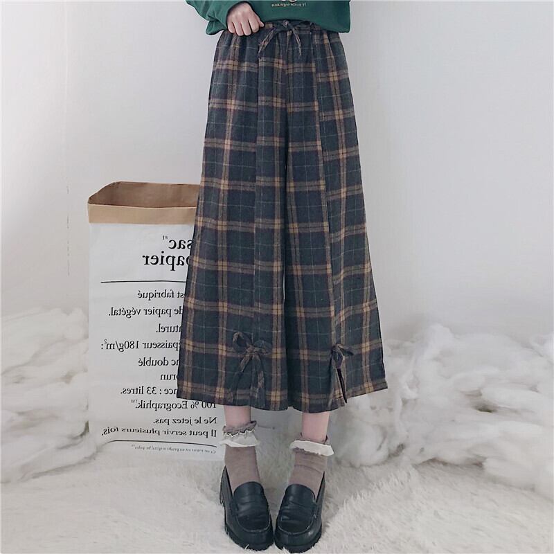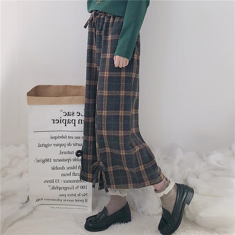 秋冬パンツレディース2020新しいチェック柄伸縮性ウエストスモールフレッシュボウタイハイウエストスモールワイドレッグパンツ 萌量不足48507458134