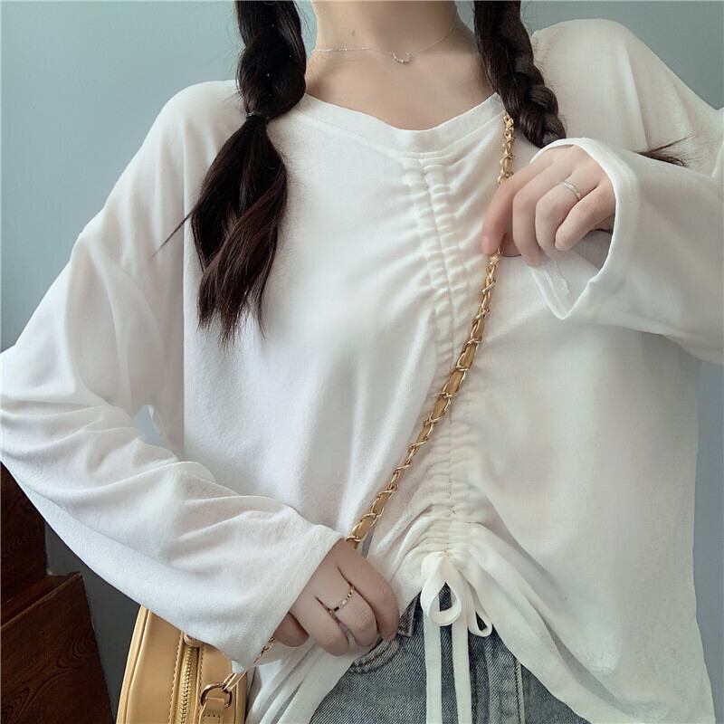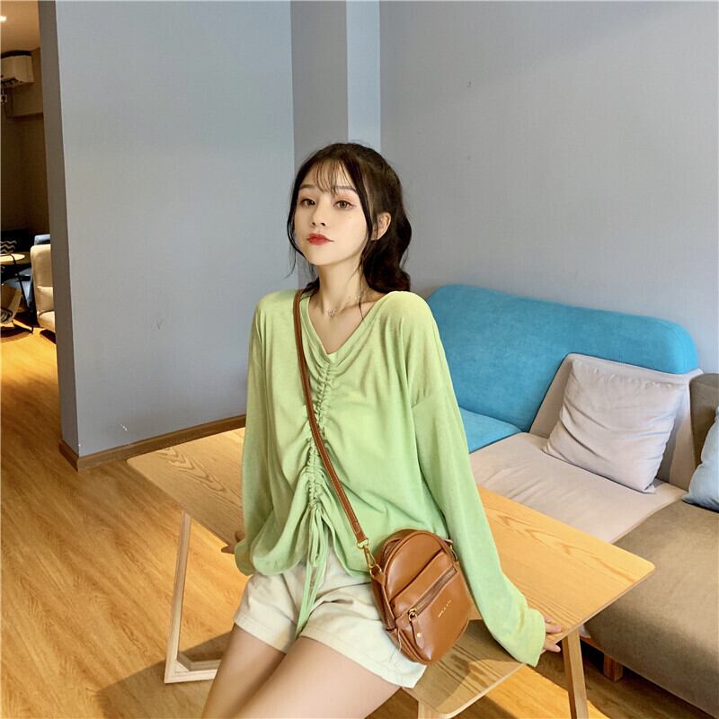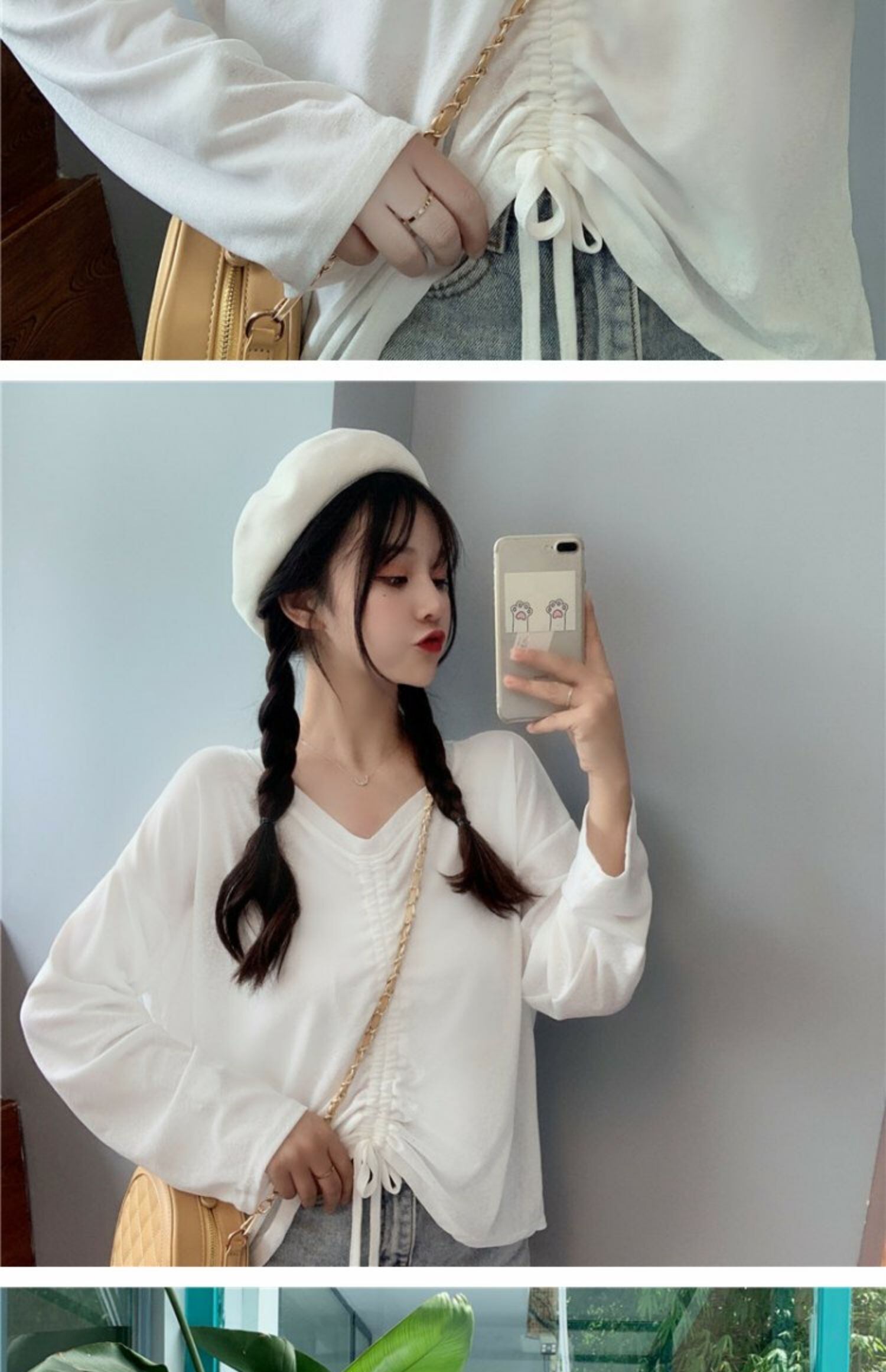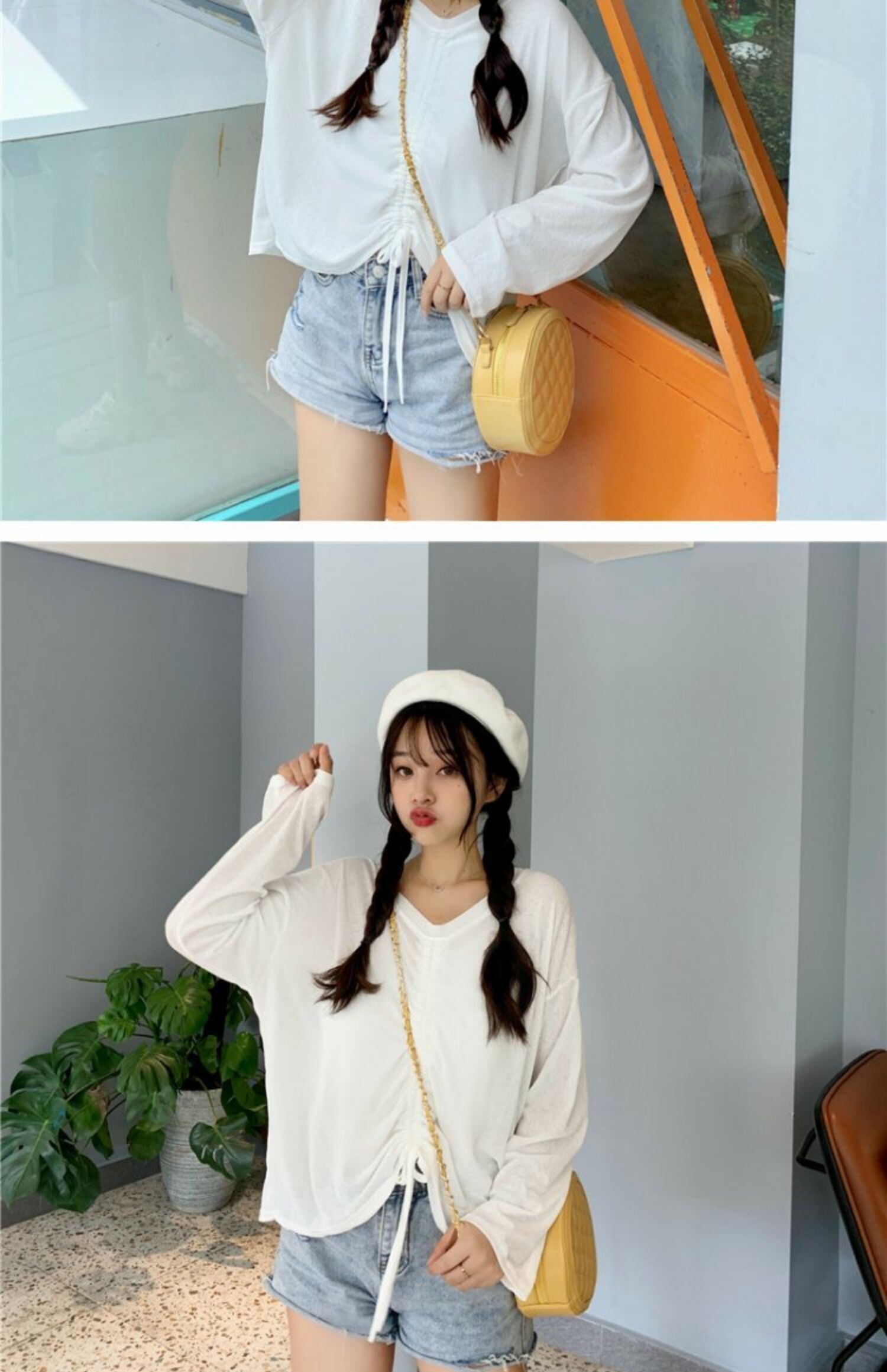 小さくてフレッシュでシンプルな巾着秋の服Vネックルーズトップ春秋スーパーフェアリー長袖Tシャツレディース2020新トレンド 萌量不足2791375872