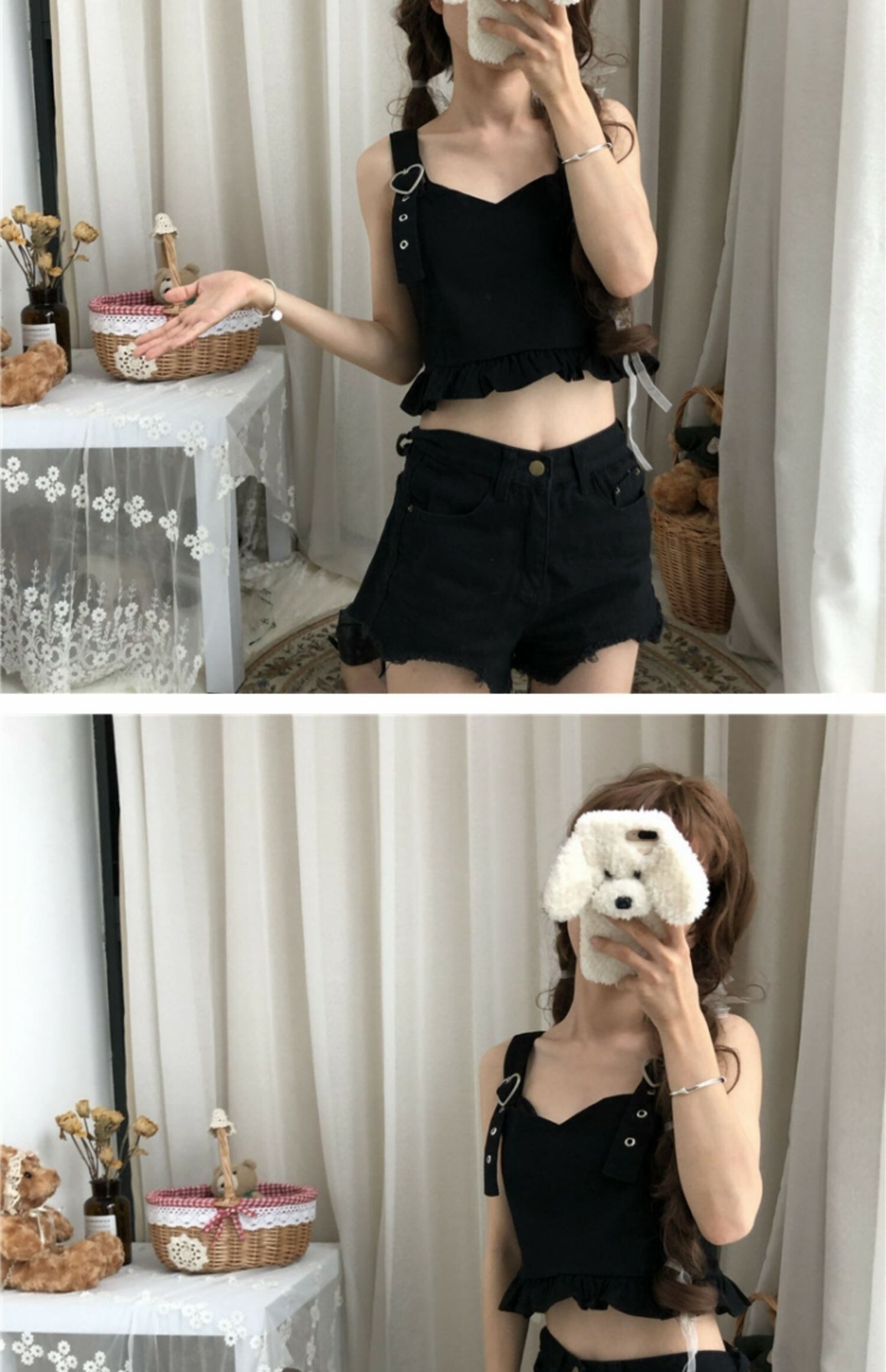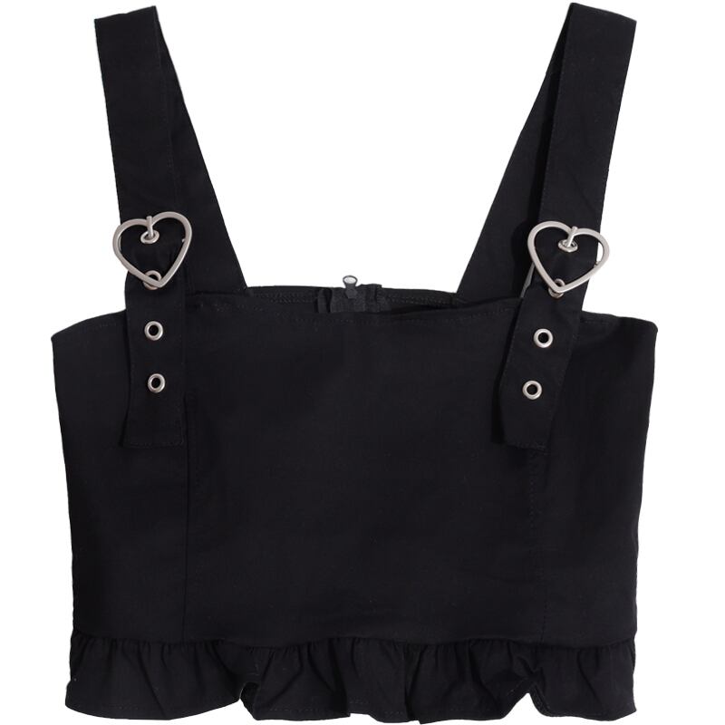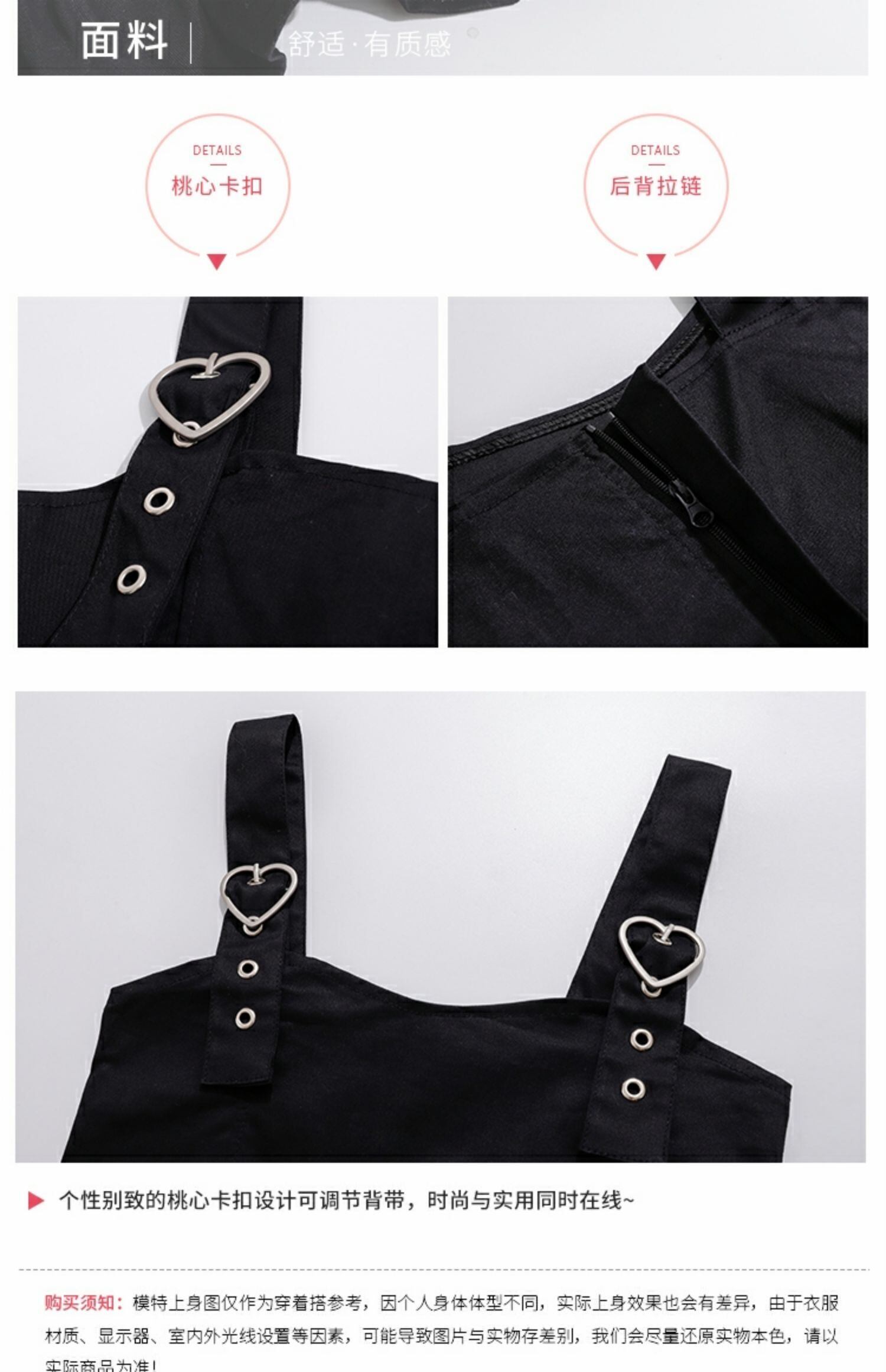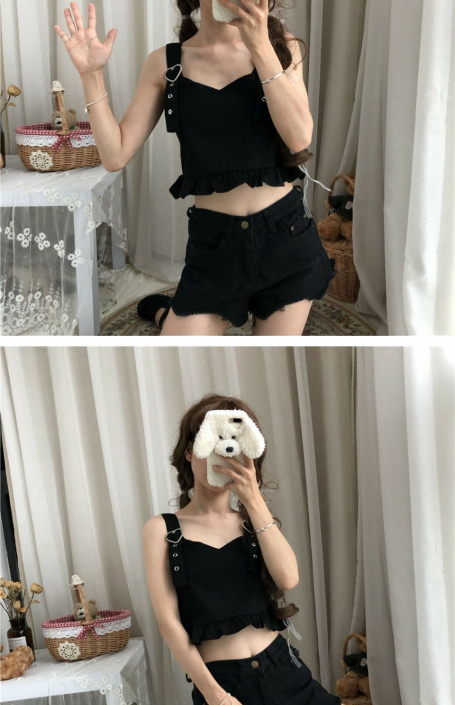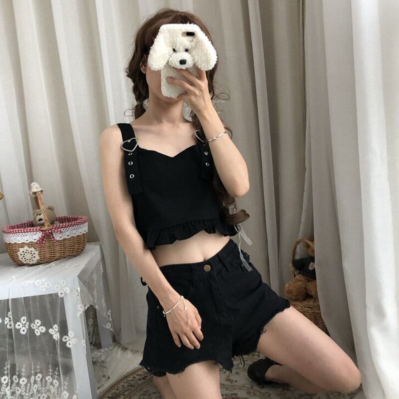 2020年新夏スモールフレッシュピーチハートバックルVネックブラックノースリーブキャミソールレディースアウターボトミングトップトレンド 萌量不足44810893590