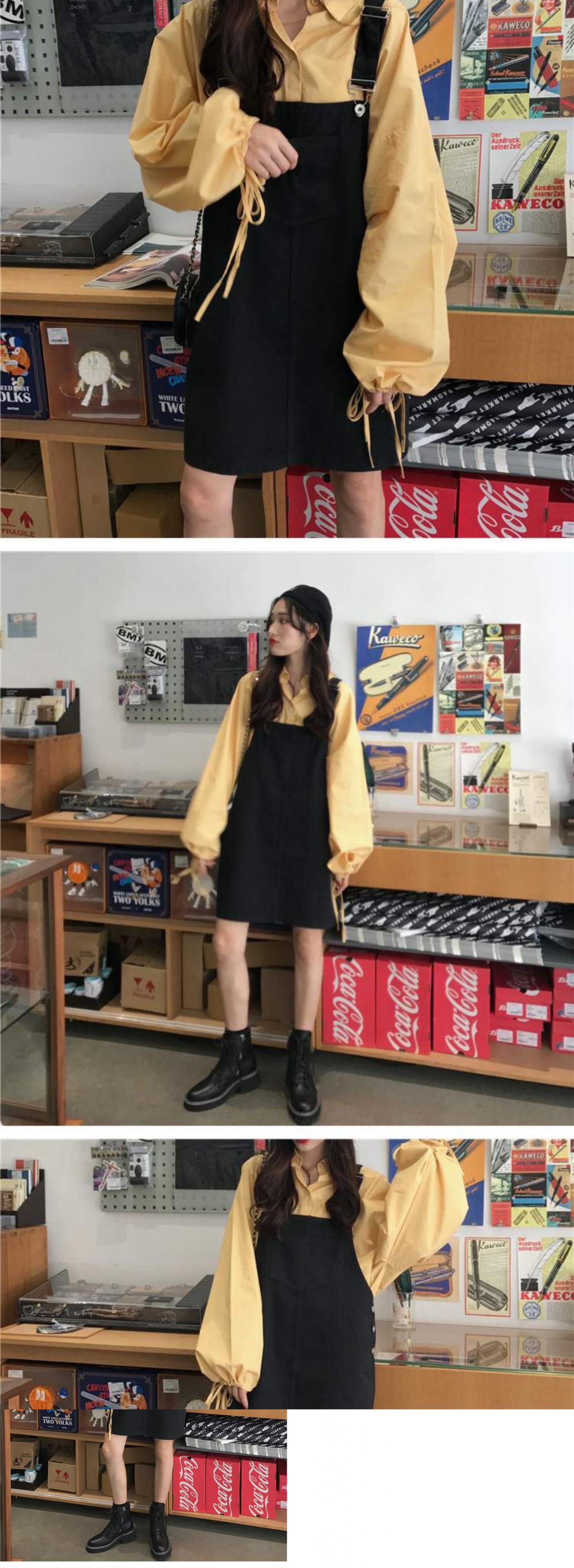 色:黄色のシャツ,白のシャツ,ブラックストラップドレス,カードカラーストラップドレス
