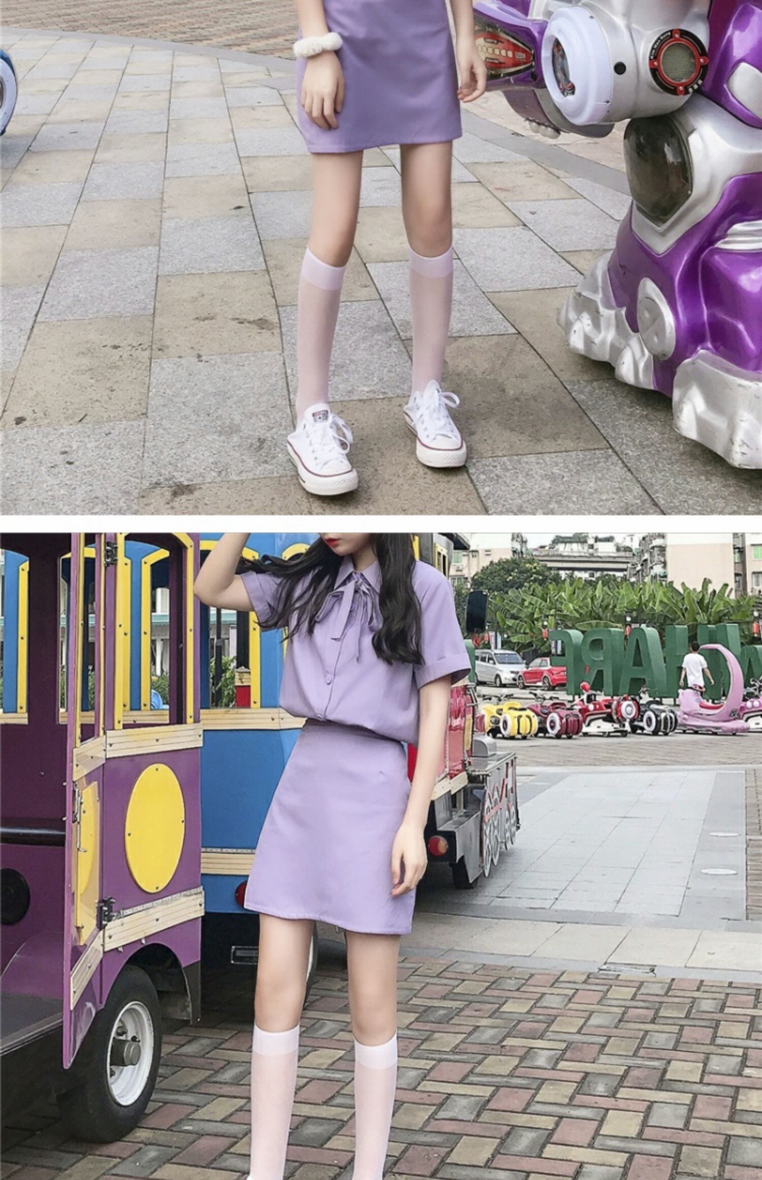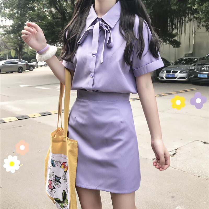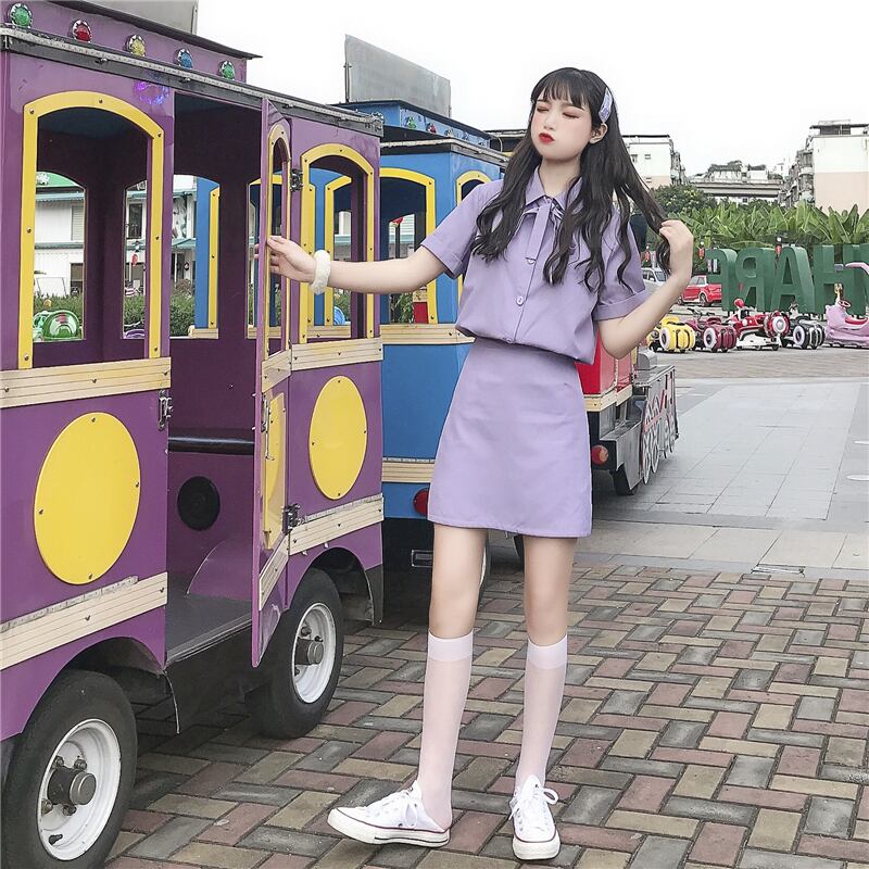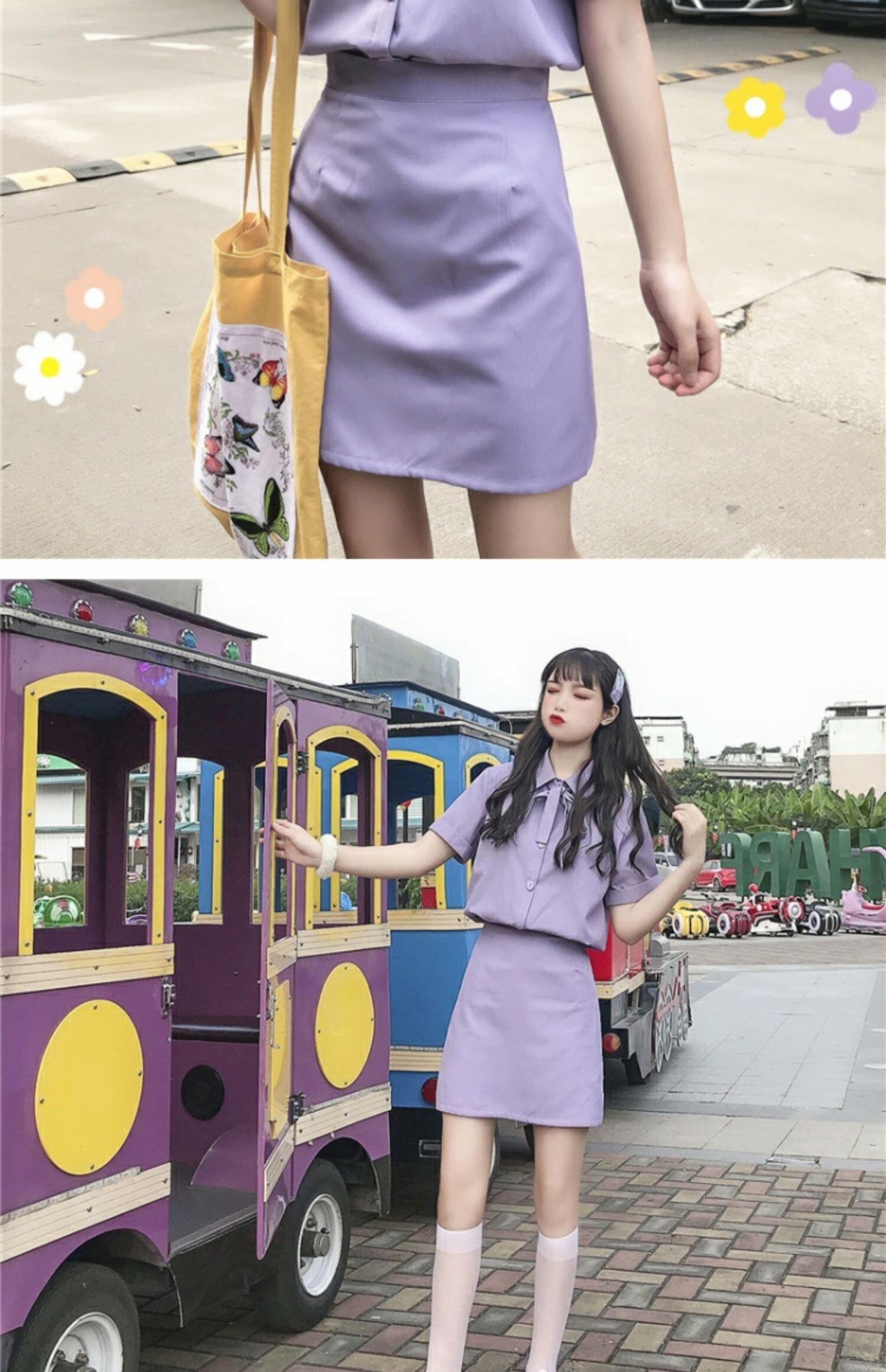 サマースーツ女性2019新しいese小さな新鮮な半袖シャツ+ Aラインスカートツーピースタイドタイ 萌量不足48946814398
