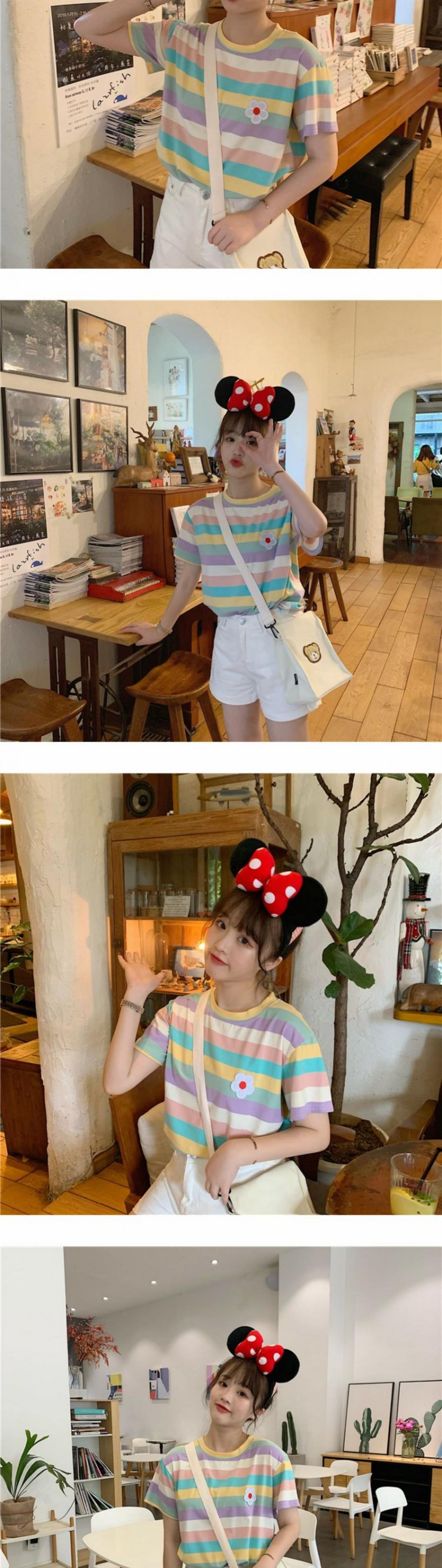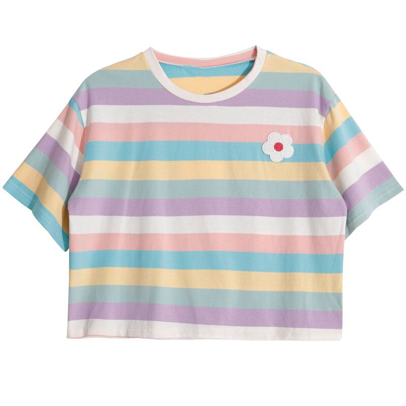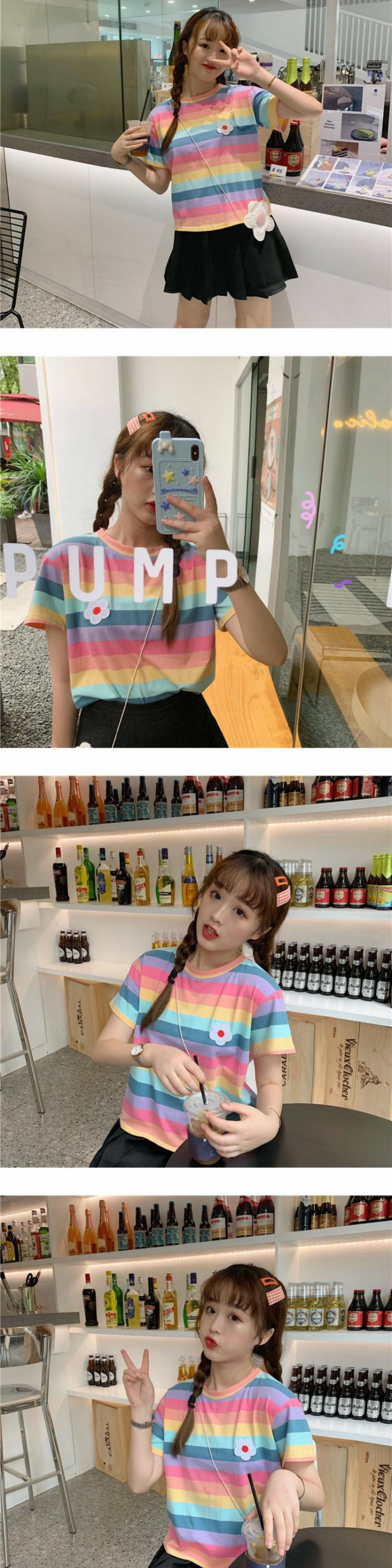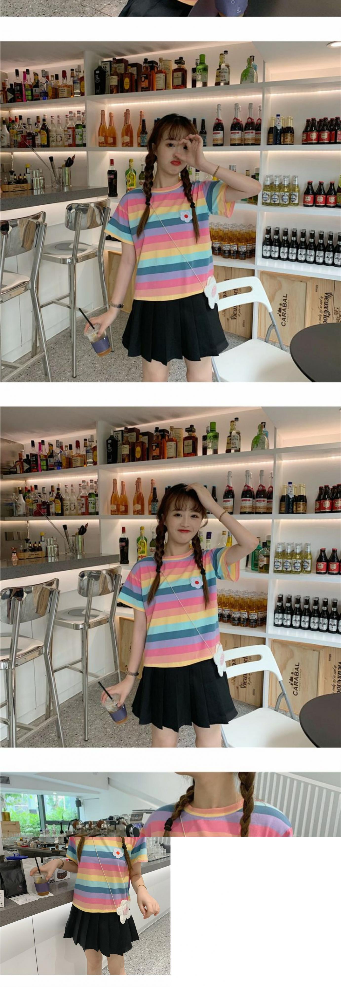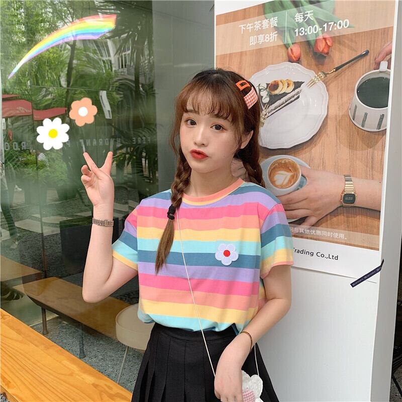 夏のヒョナスタイルのレインボーストライプスウィートワイルドスチューデントスモールフレッシュトップTシャツ半袖女性2020新トレンド 萌量不足30044078820