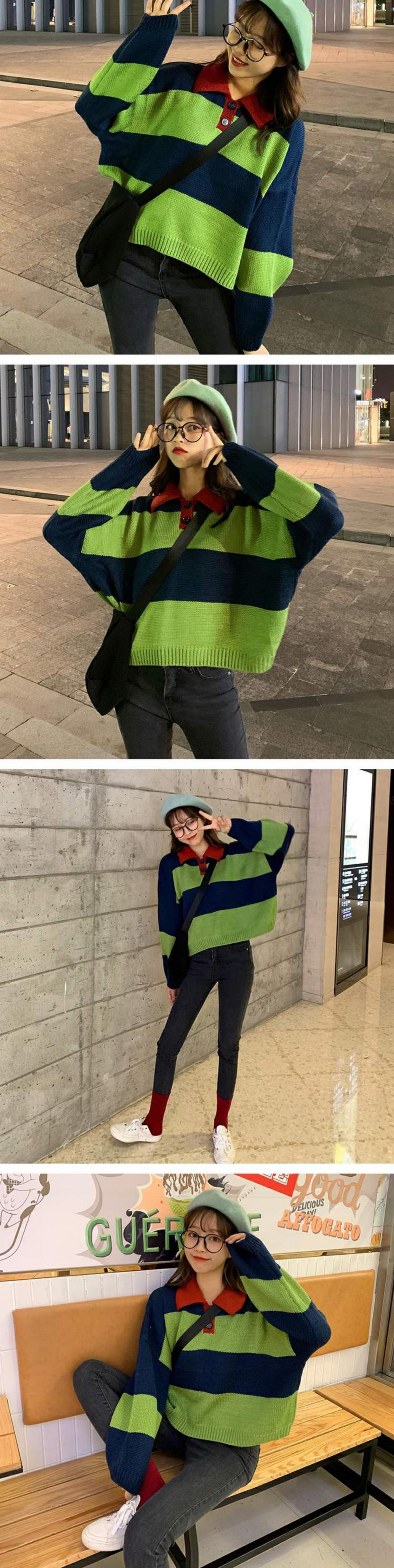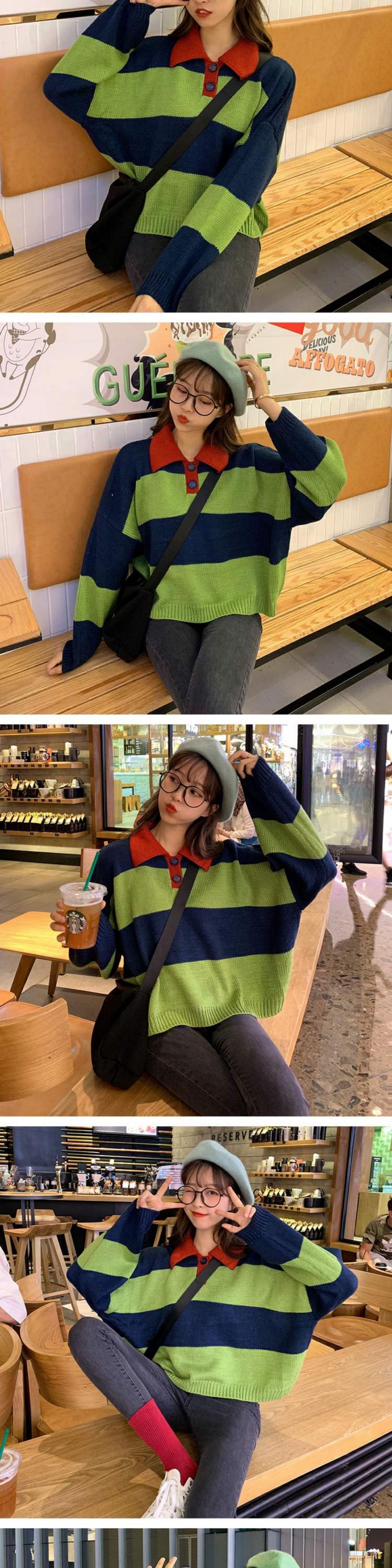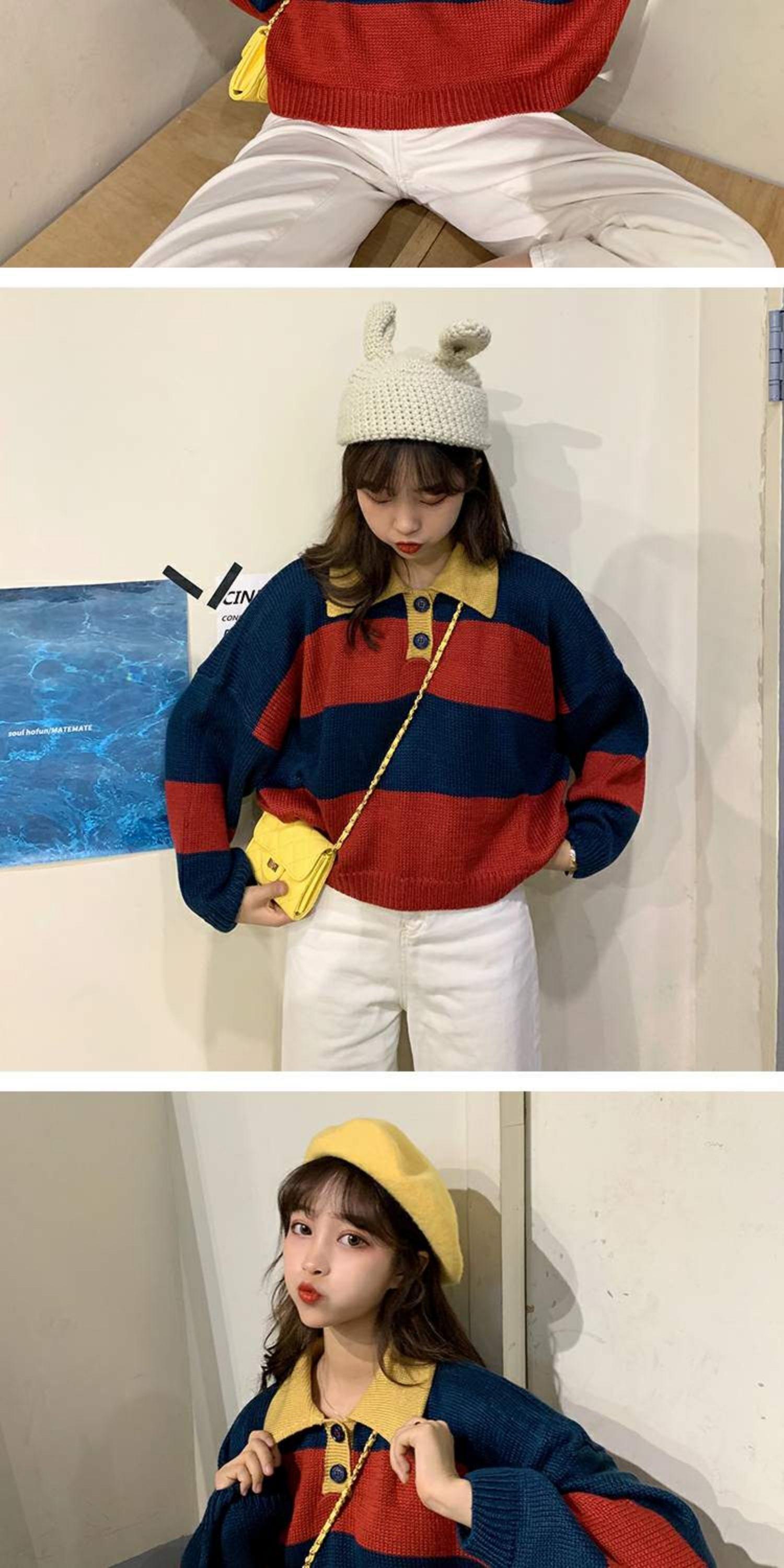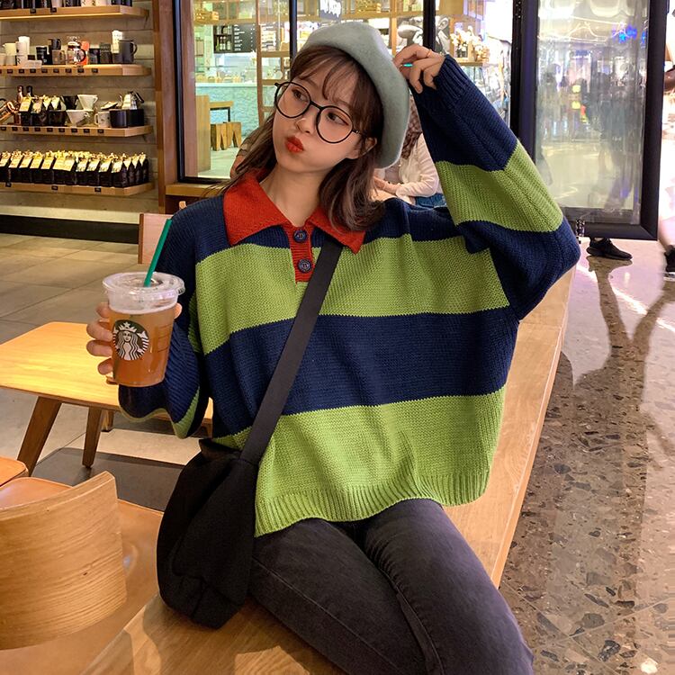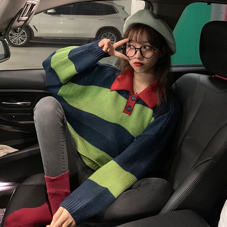 オールマッチの薄い春秋ルーズセーターレディース秋着アウターカラーマッチングストライププルオーバーPOLO襟長袖セータータイド 萌量不足87784782672