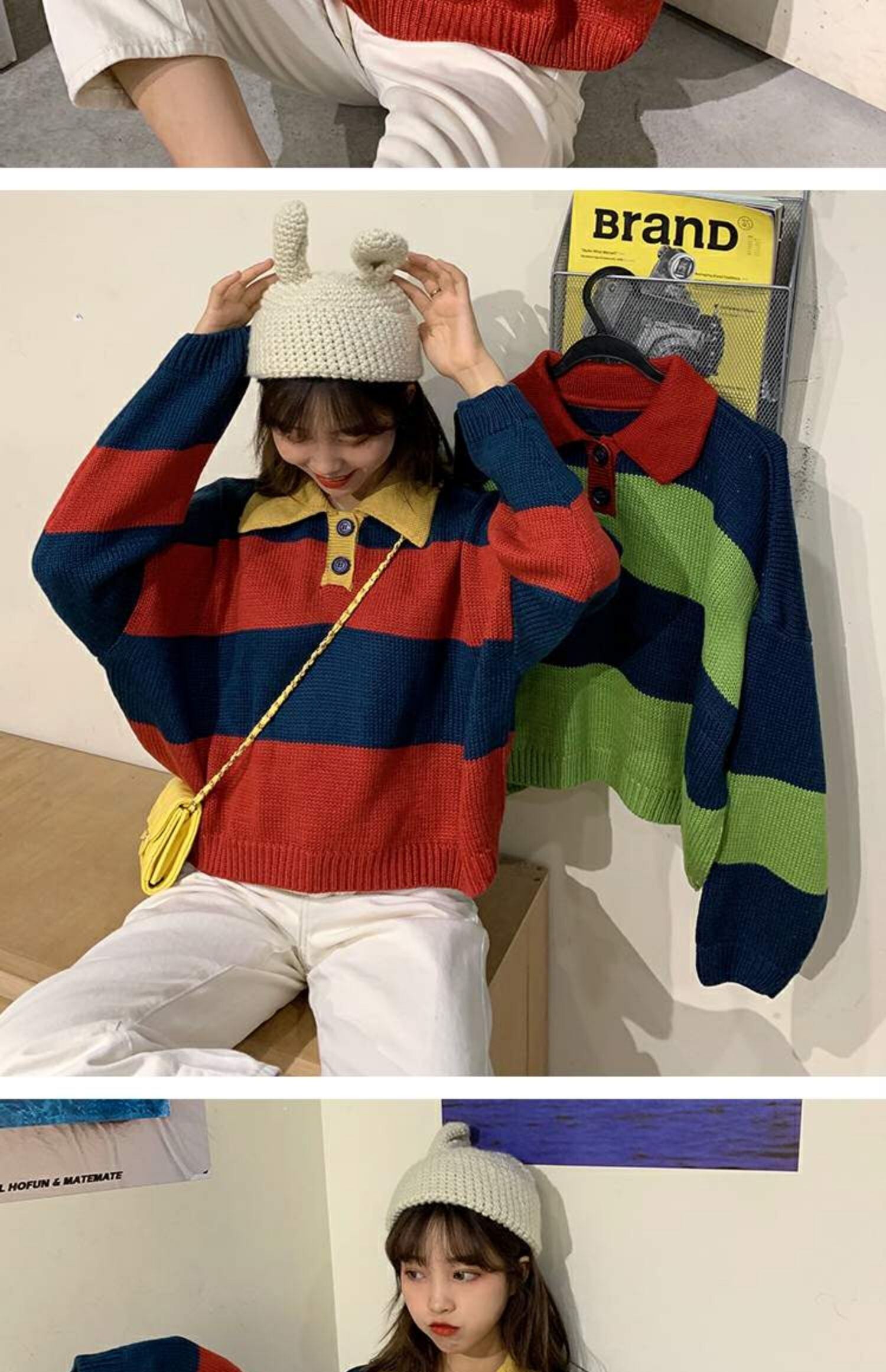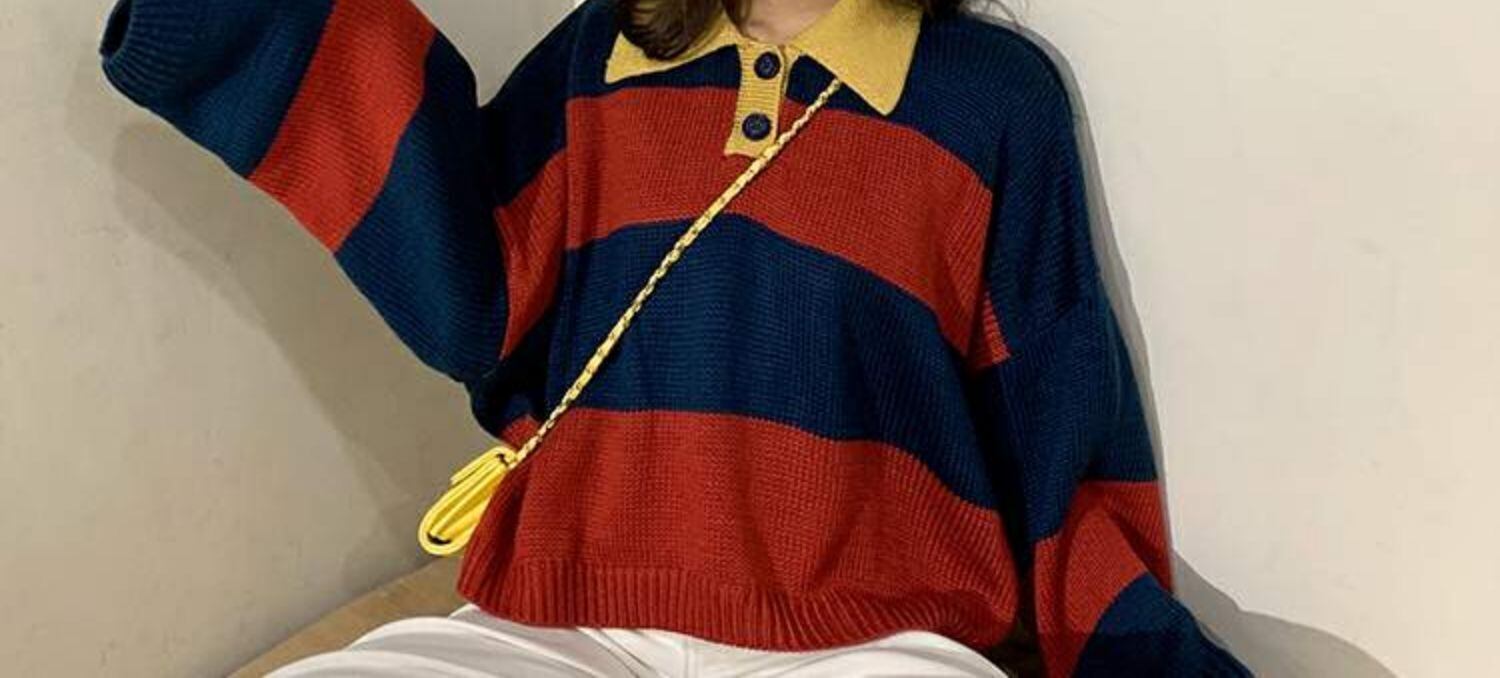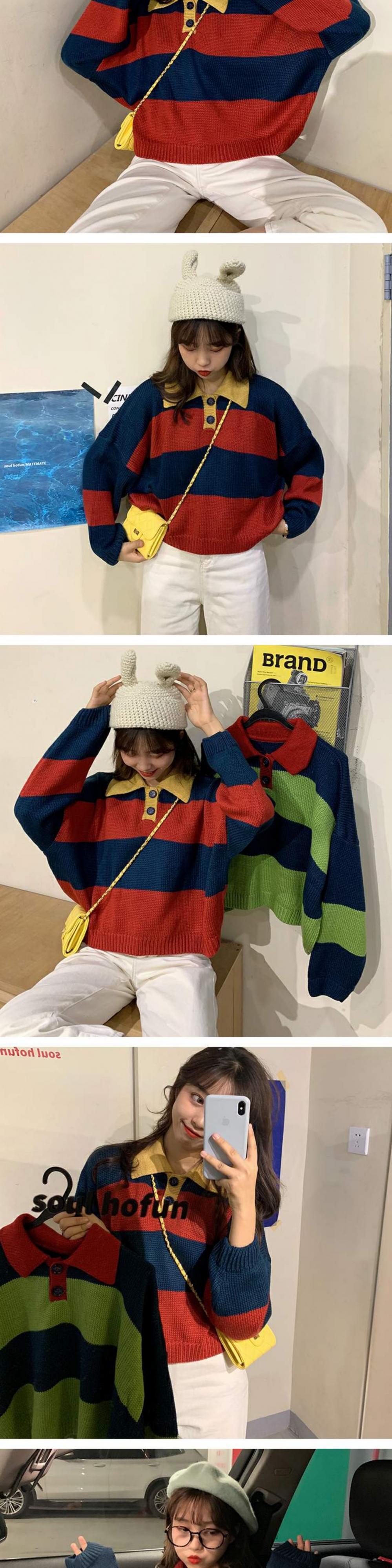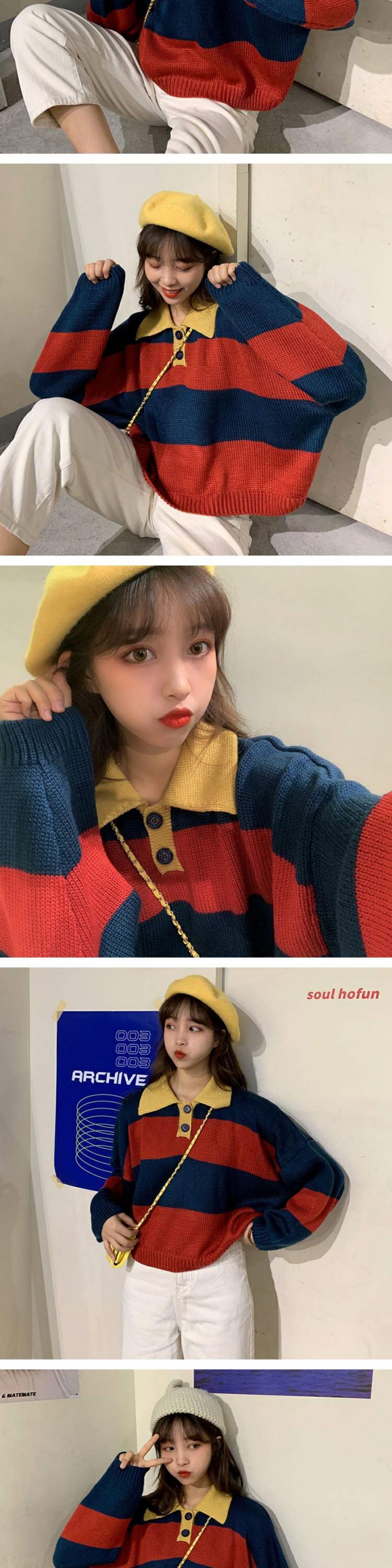 オールマッチの薄い春秋ルーズセーターレディース秋着アウターカラーマッチングストライププルオーバーPOLO襟長袖セータータイド 萌量不足87784782672