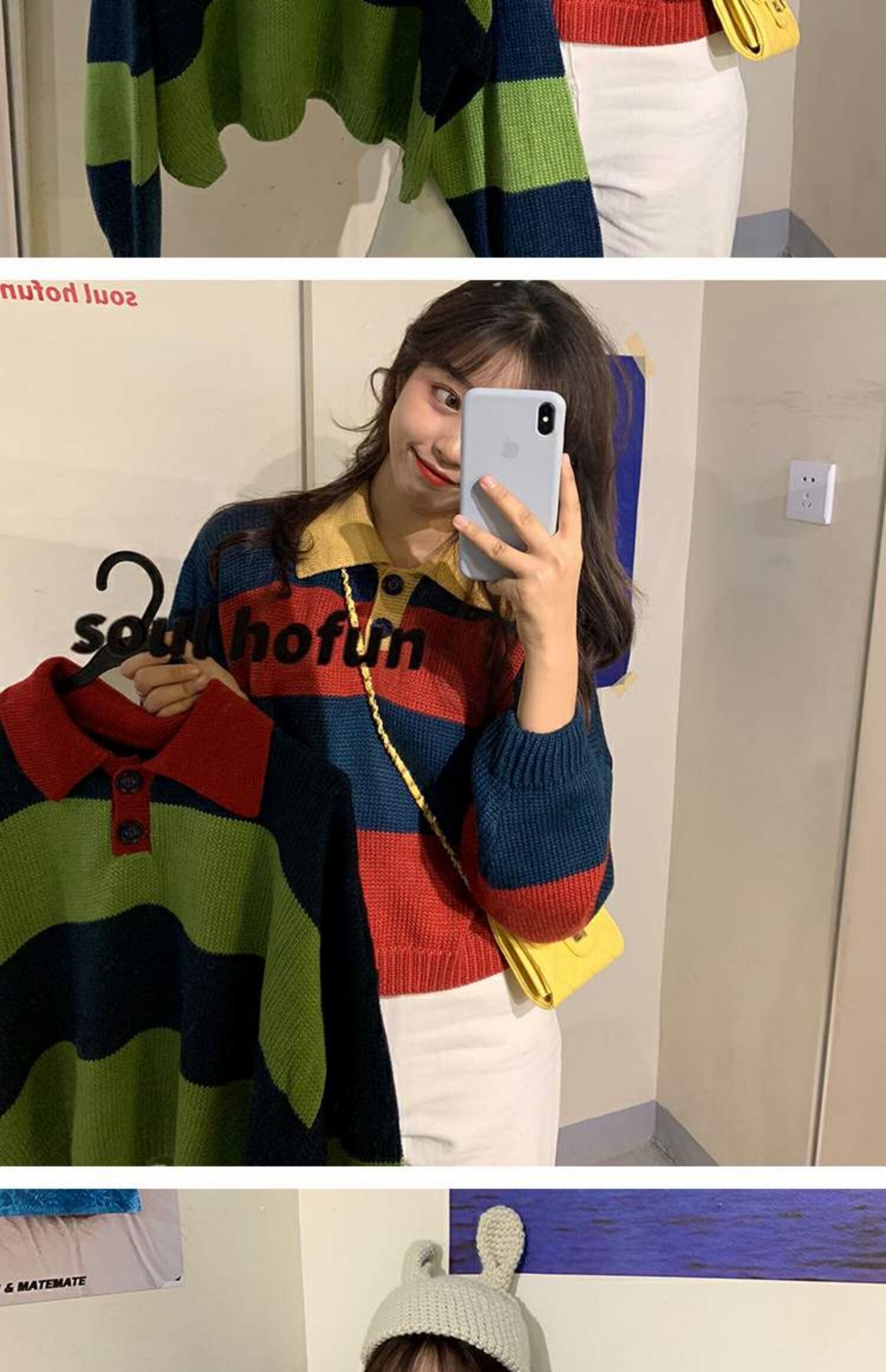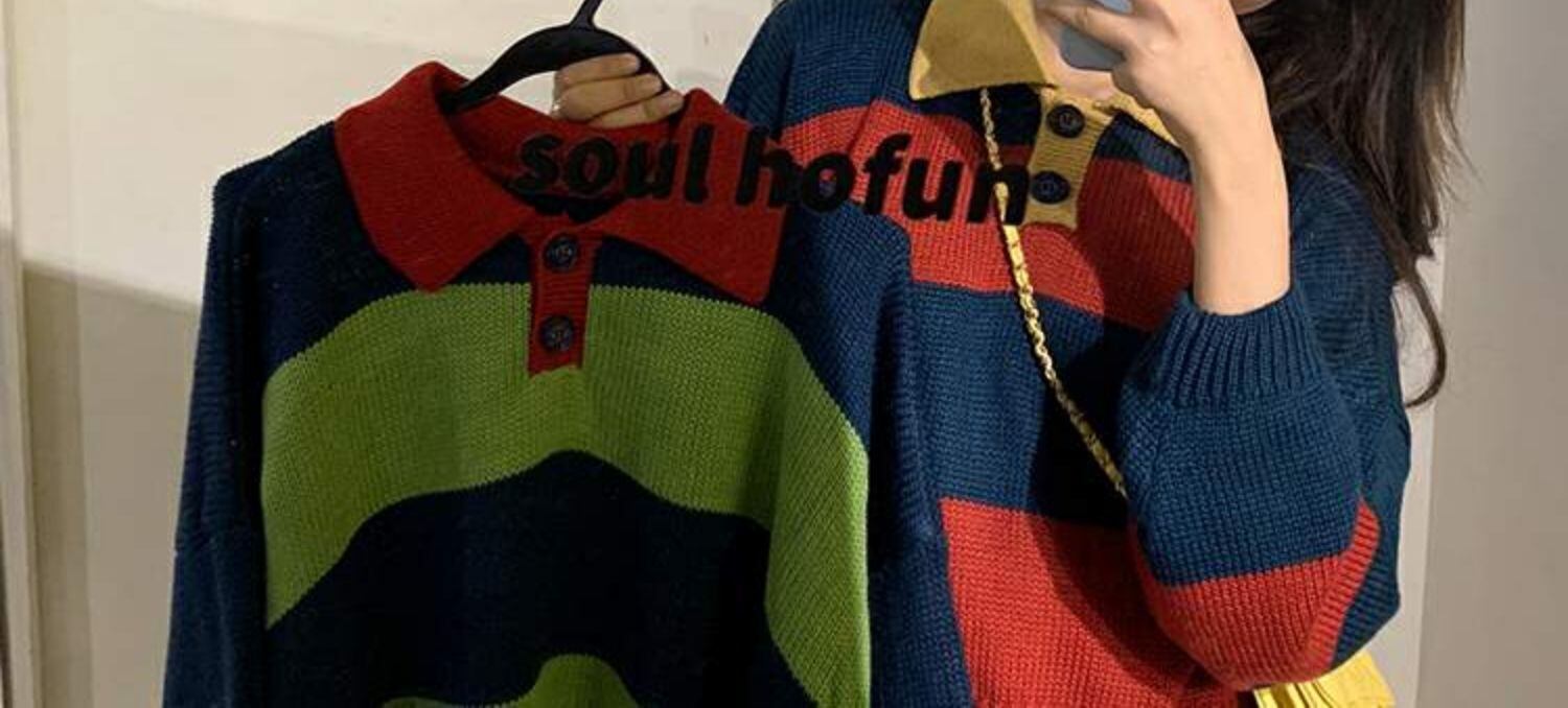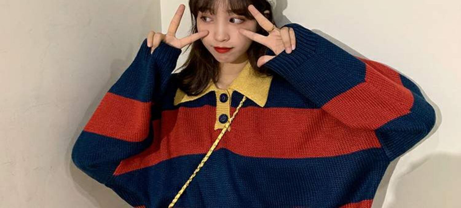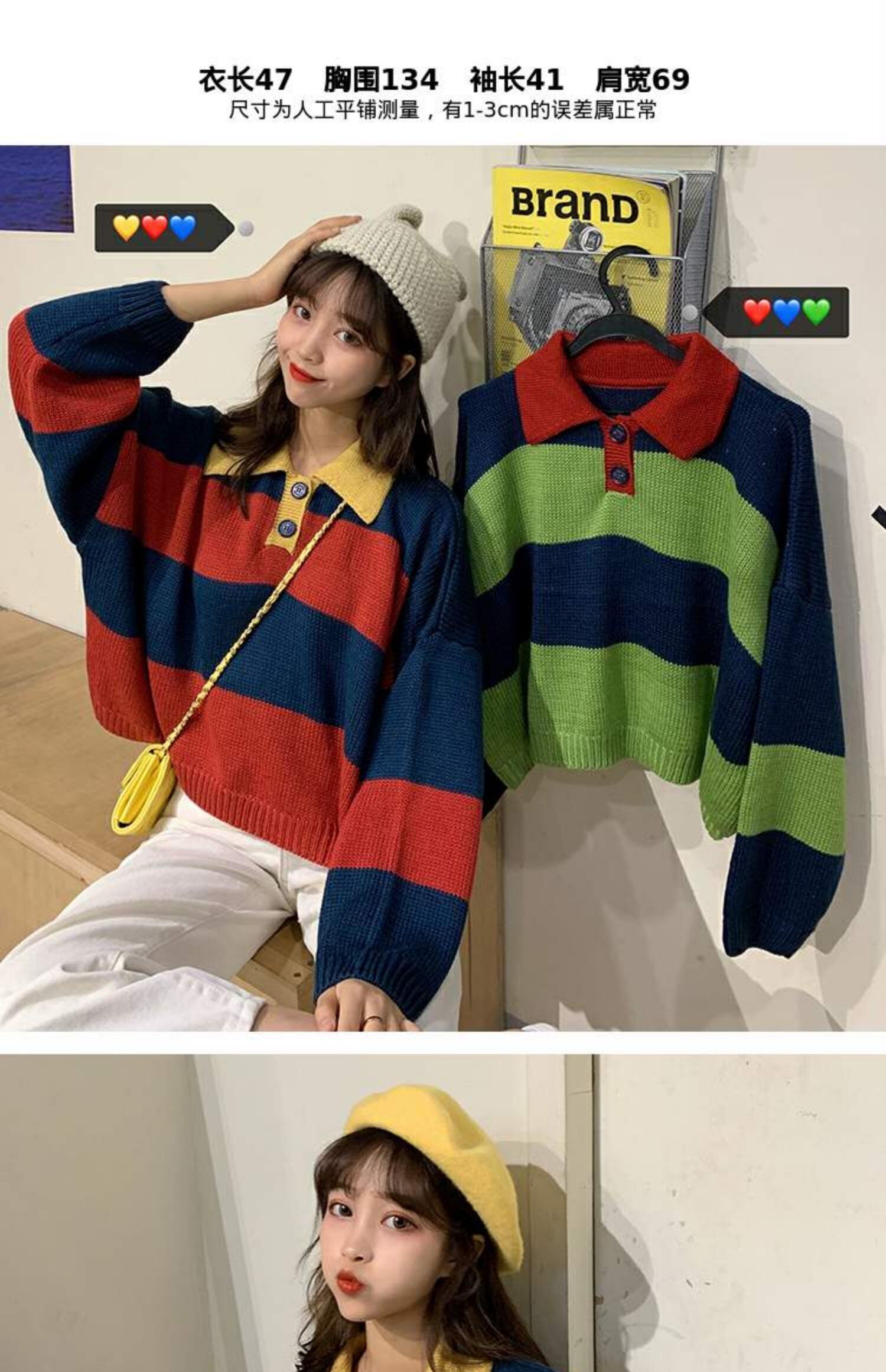 オールマッチの薄い春秋ルーズセーターレディース秋着アウターカラーマッチングストライププルオーバーPOLO襟長袖セータータイド 萌量不足87784782672