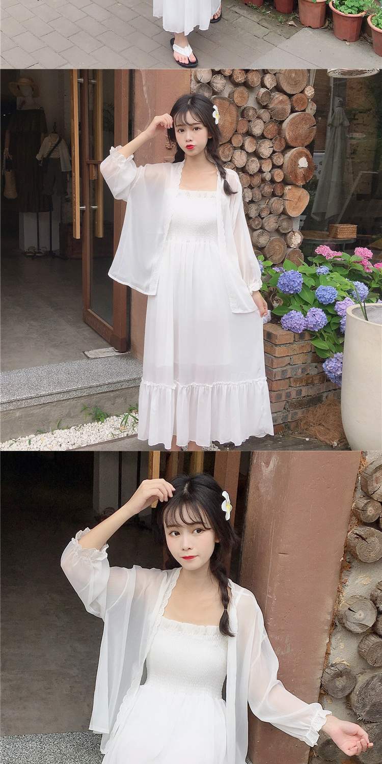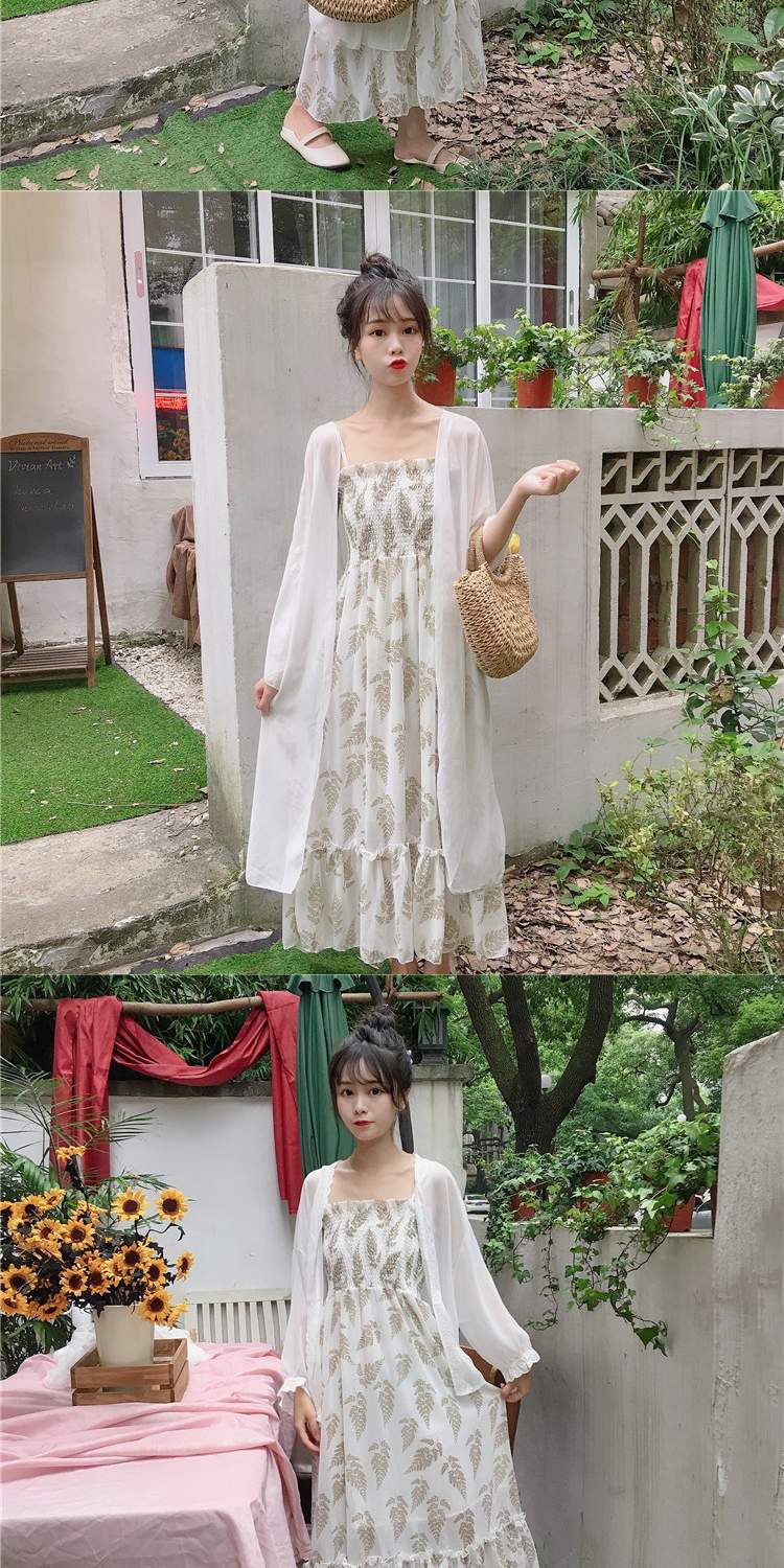 色:白いドレス,葉の花のドレス,ショートカーディガン,ビッグホーンカーディガン