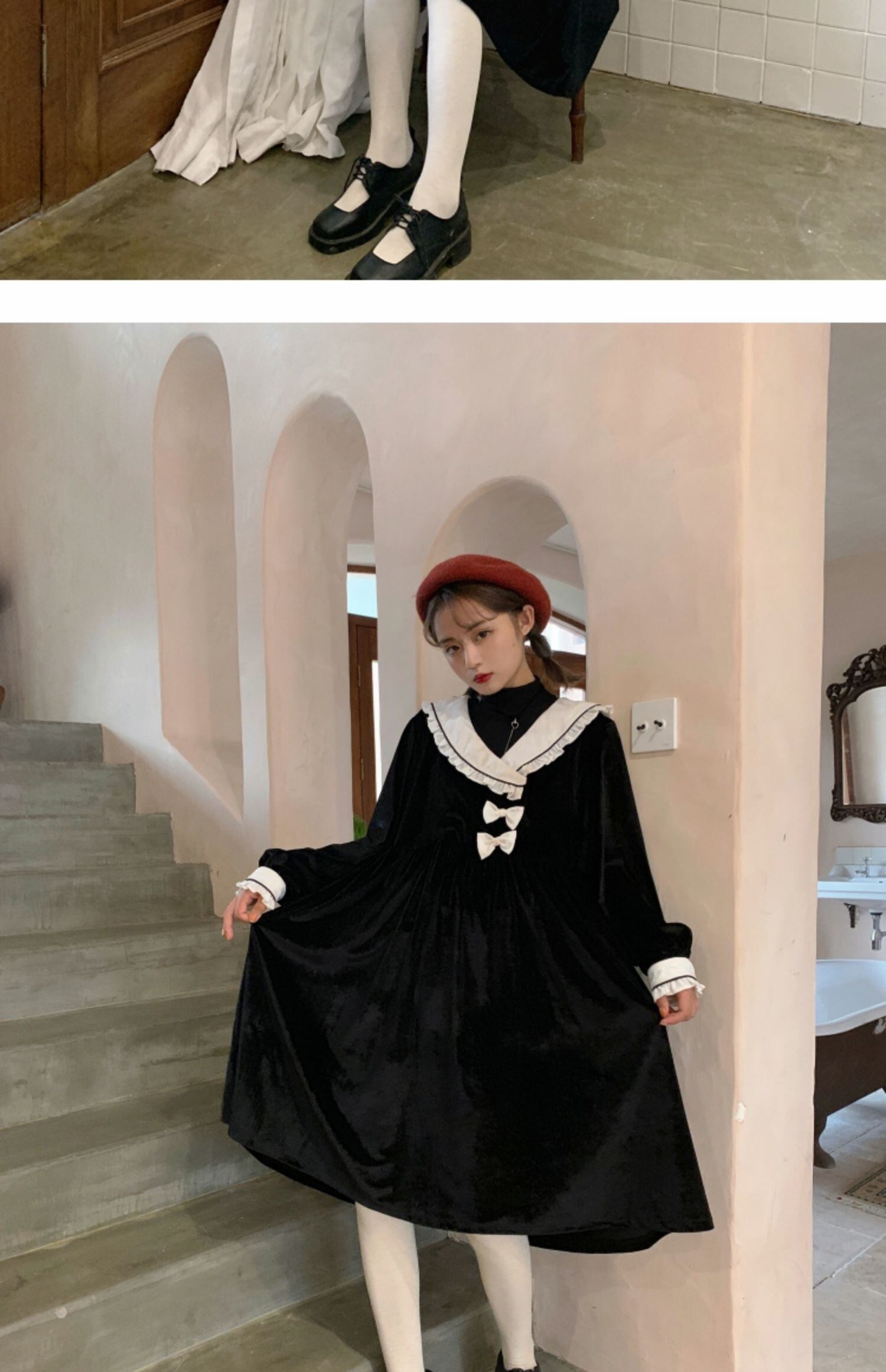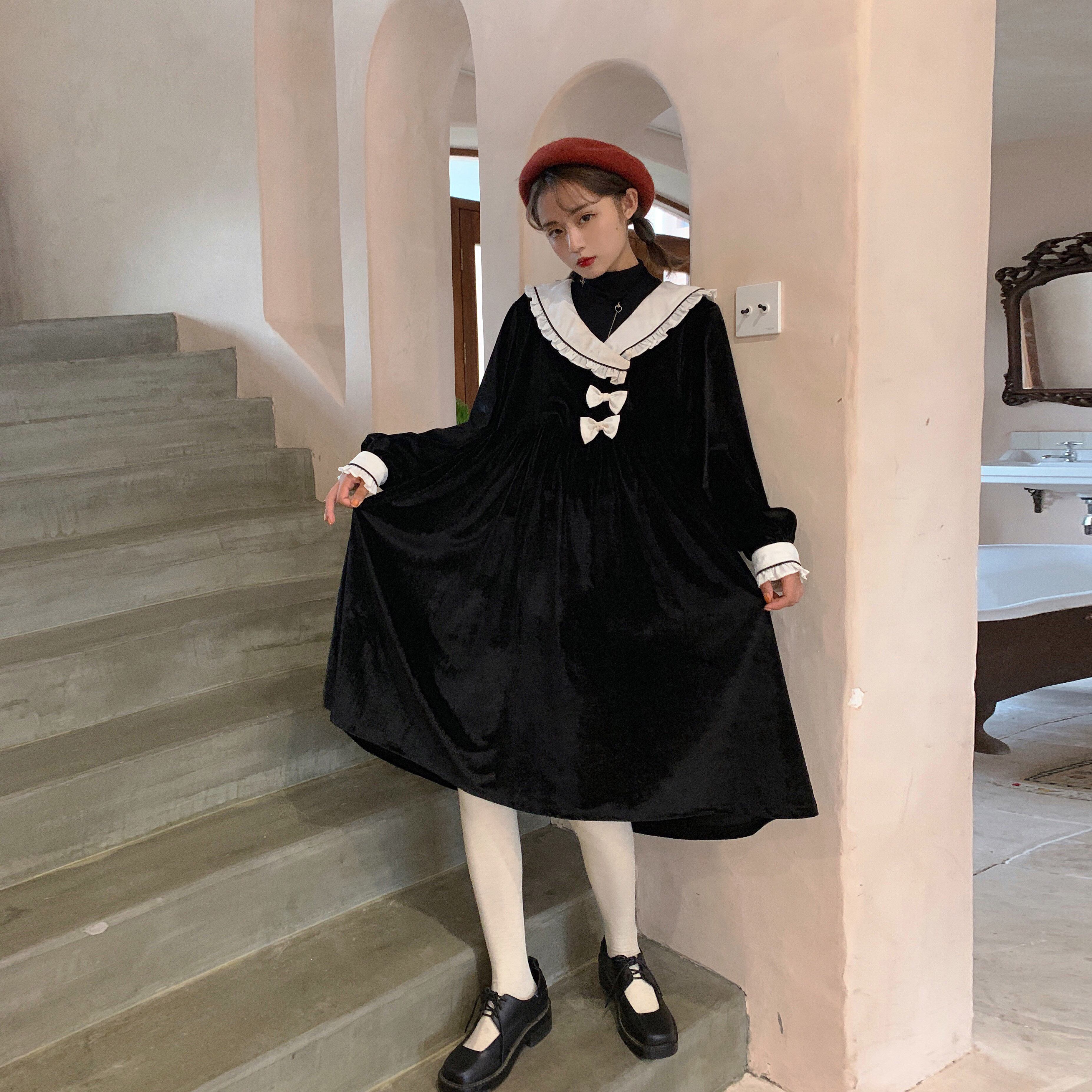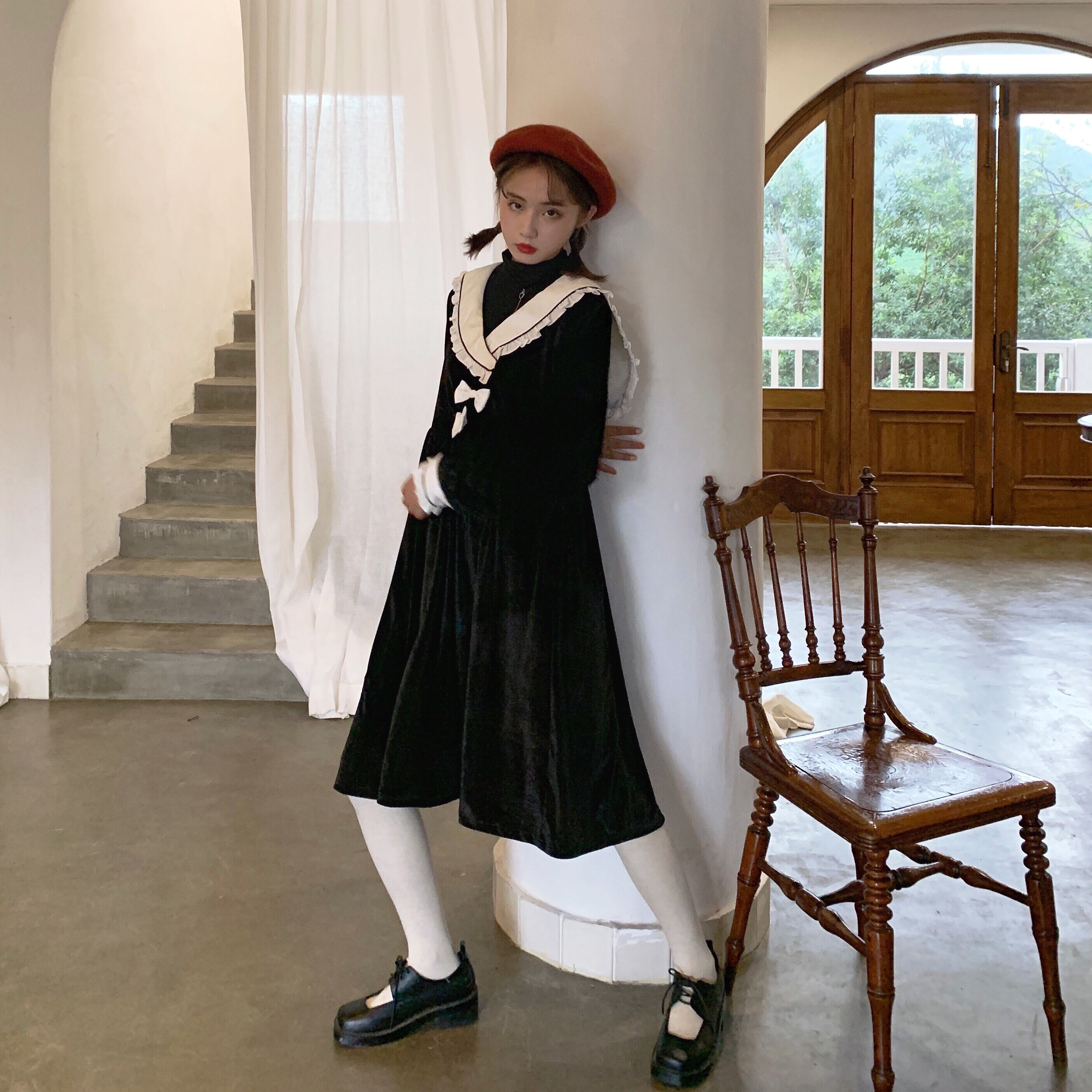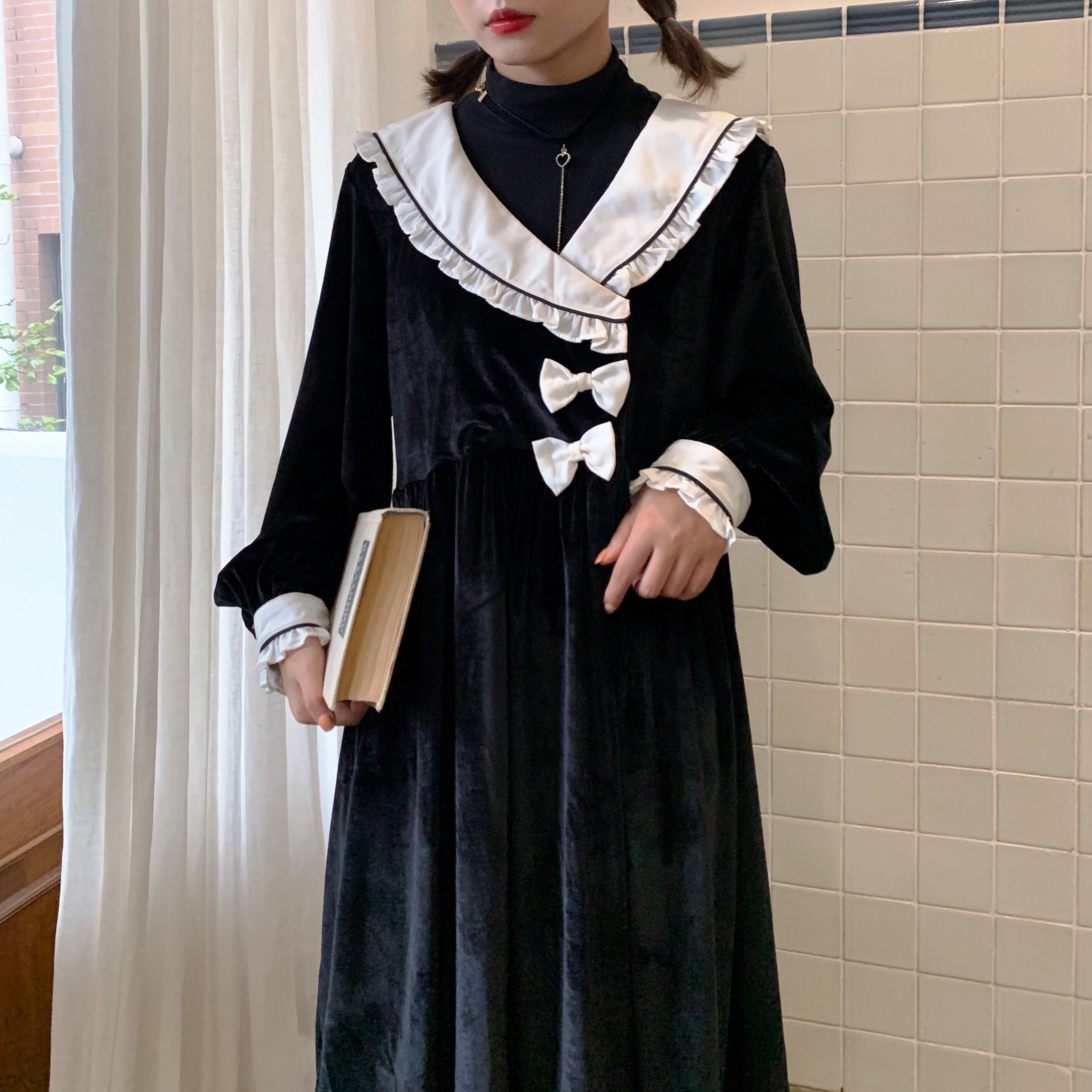2020年春秋新作レディースダークフューネラルハイウエストスカートボウカレッジスタイルロングドレストレンド 萌量不足91270604096