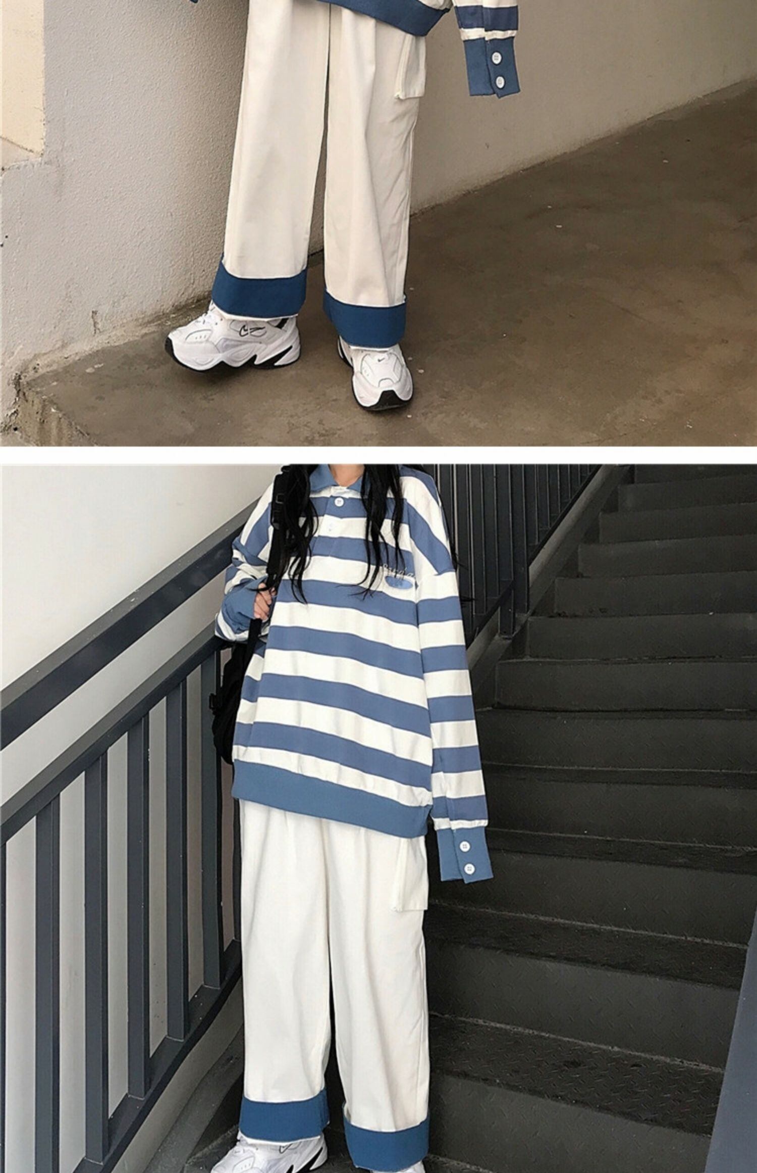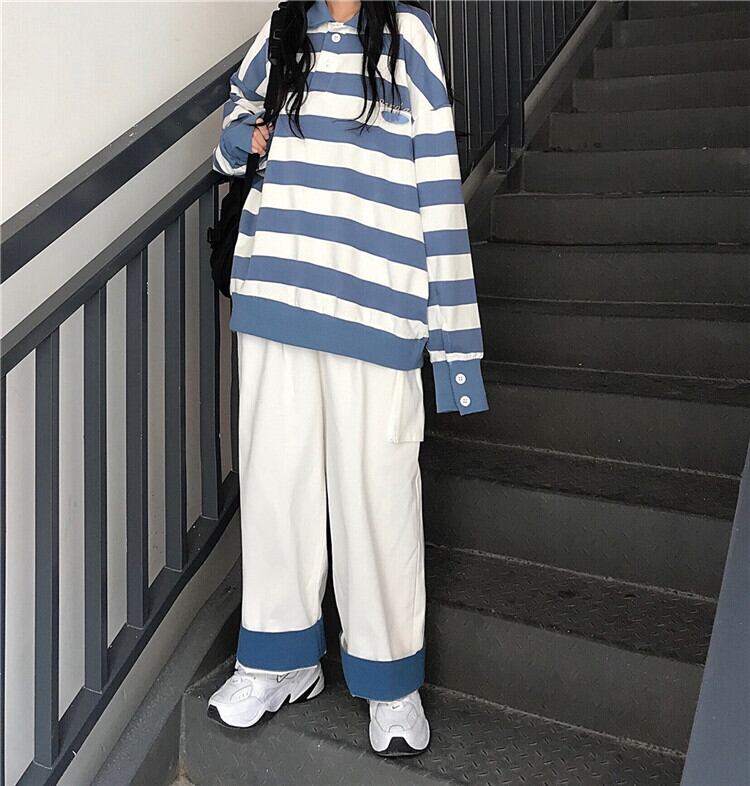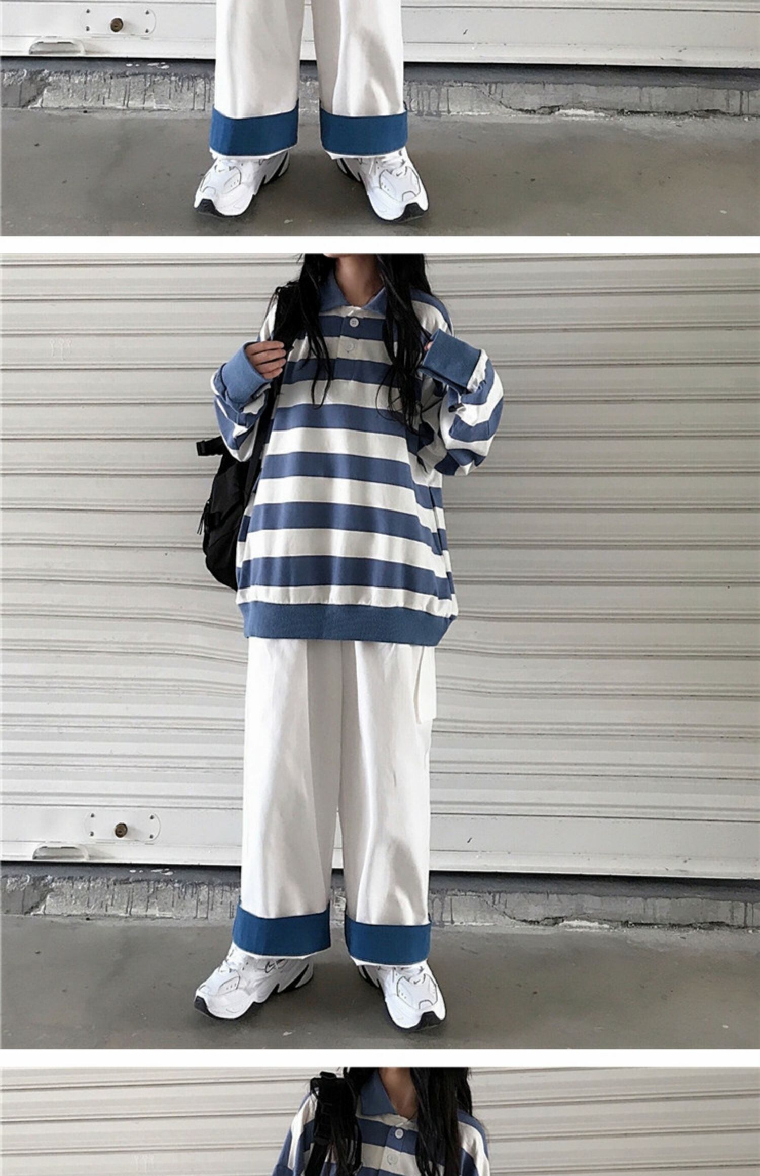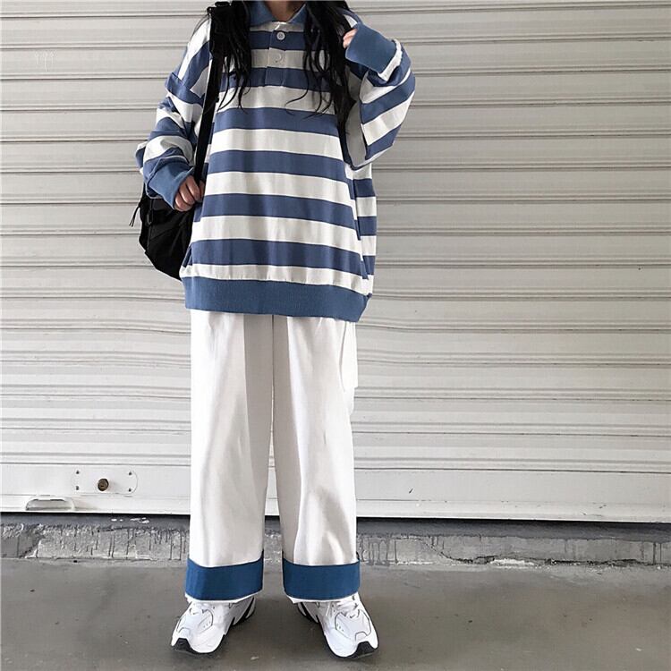 色:青と白のストライプトップ,カラーブロックワイドレッグパンツ