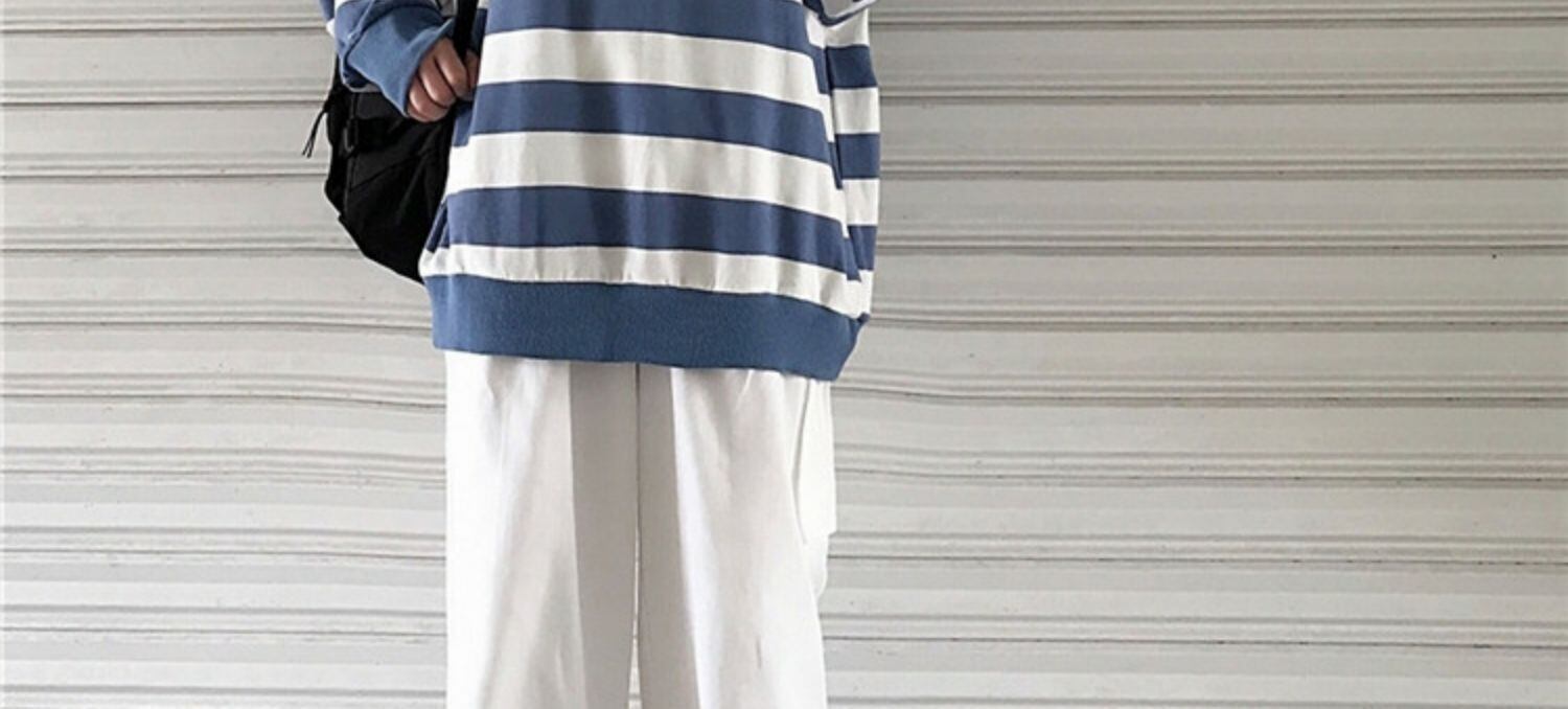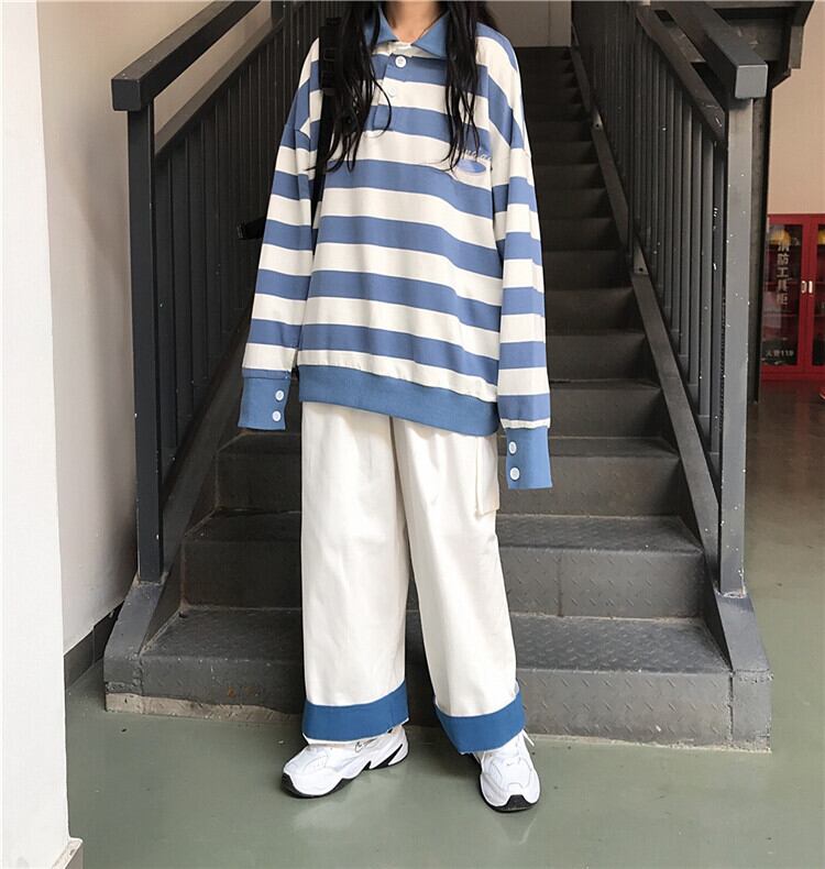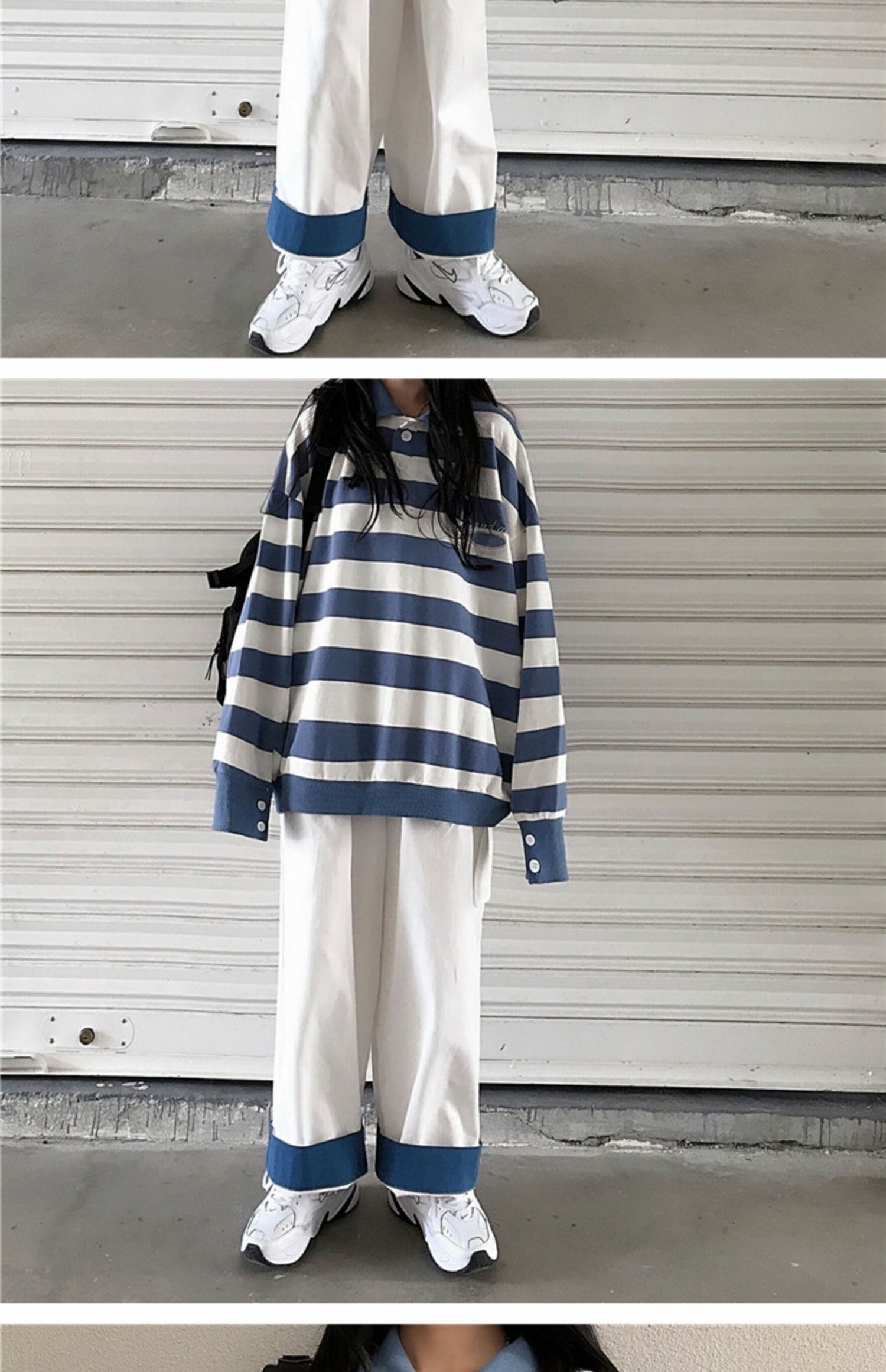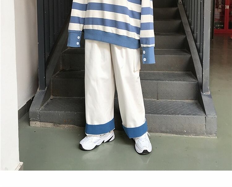 色:青と白のストライプトップ,カラーブロックワイドレッグパンツ