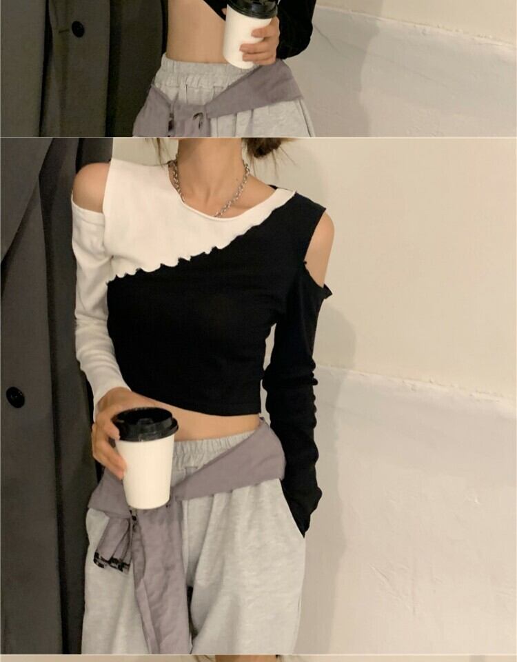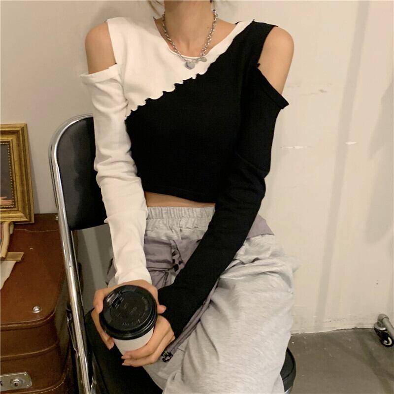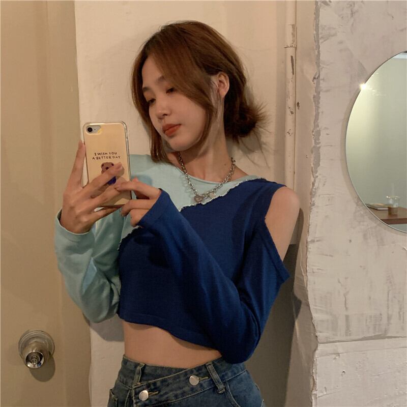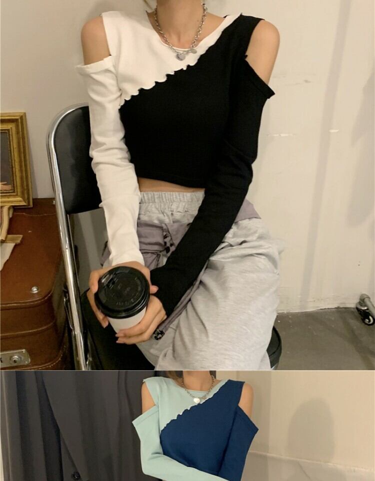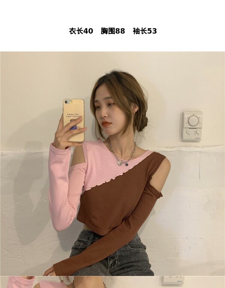 カラーTシャツ シャツ スプリングスリムトップス ロング 春物 オフショルダー ステッチ 萌量不足68547418731