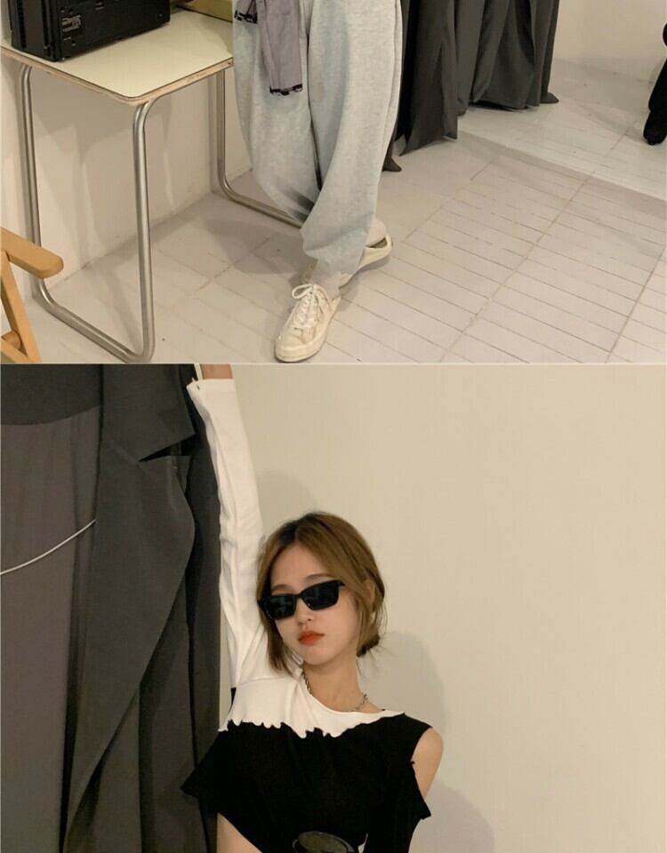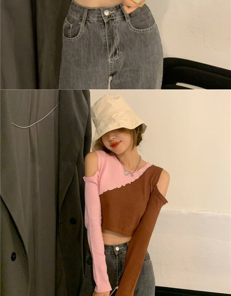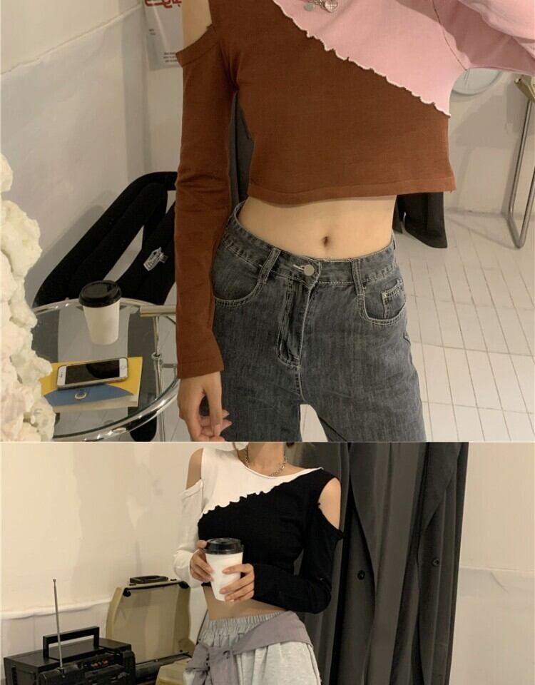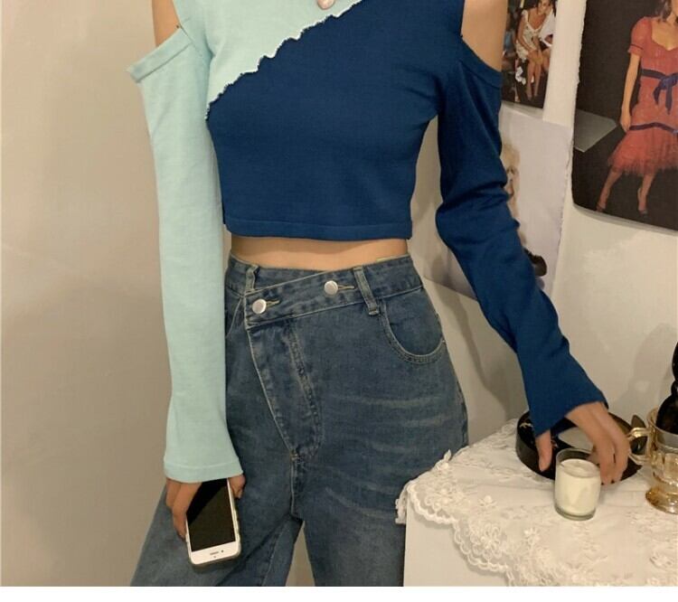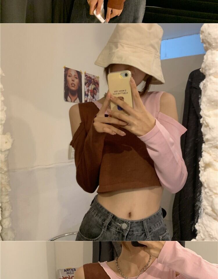 カラーTシャツ シャツ スプリングスリムトップス ロング 春物 オフショルダー ステッチ 萌量不足68547418731