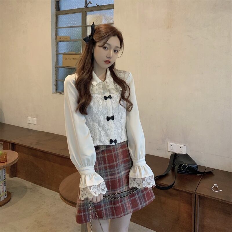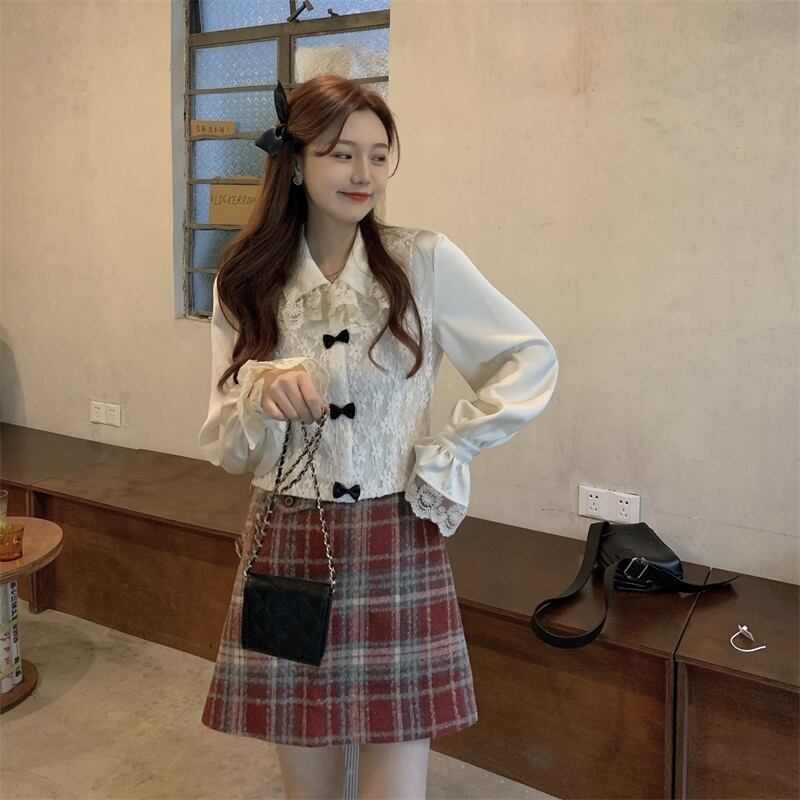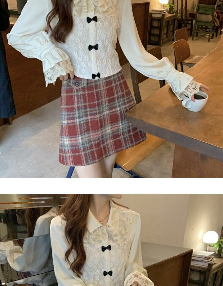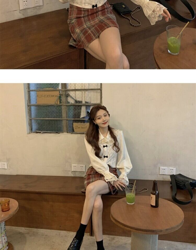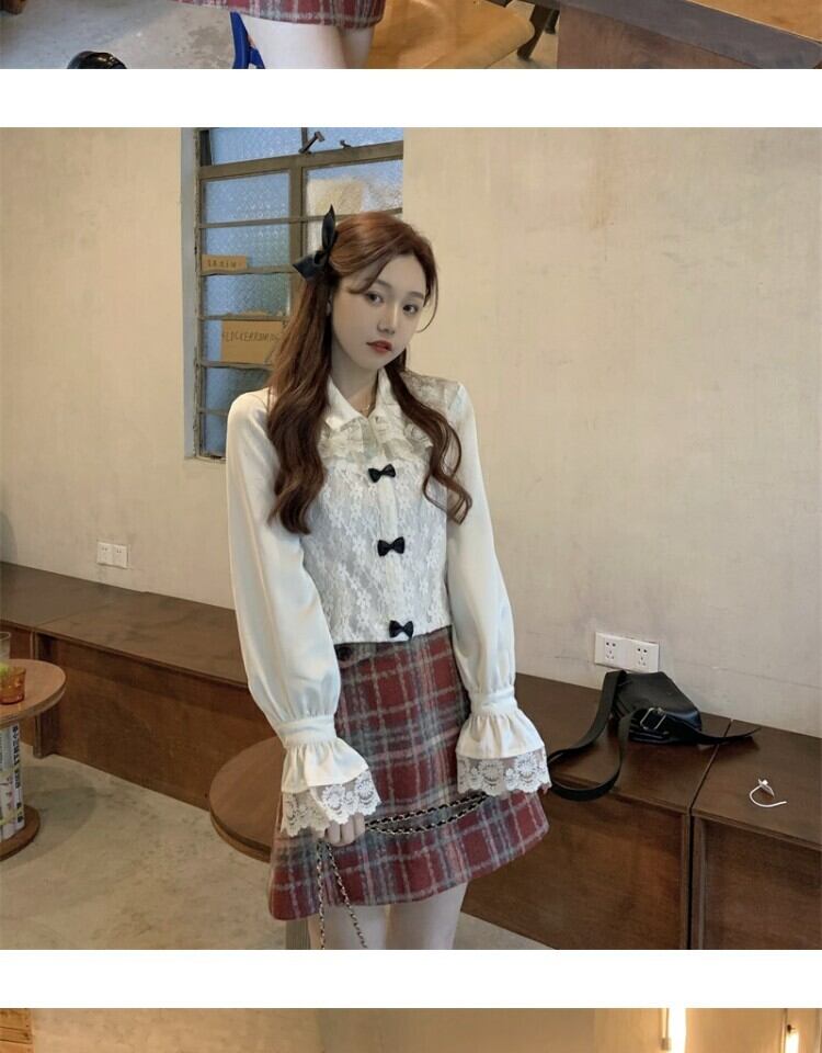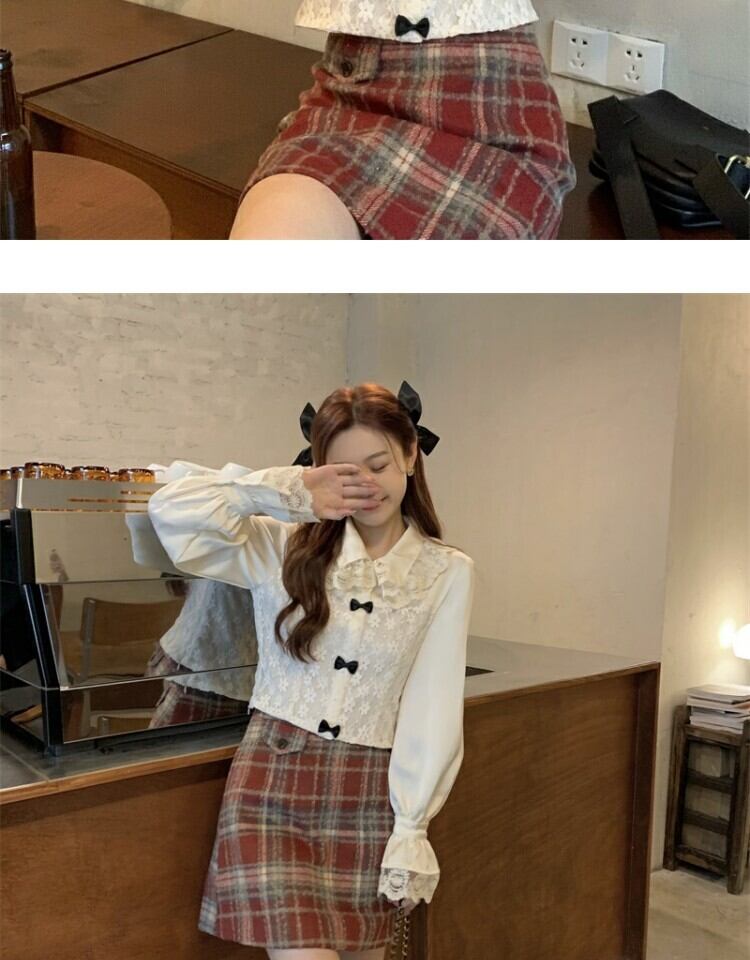 スプリングレースシャツ 格子柄スカート ストリート 大人ガーリー スウィート キュート カジュアル 春物 ステッチ 萌量不足84949647308