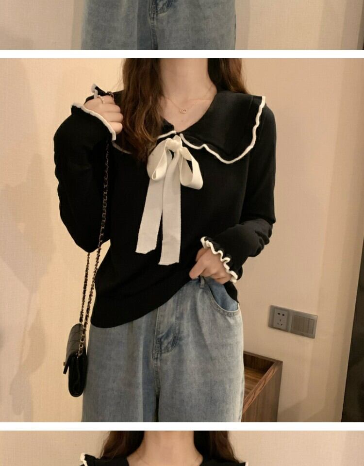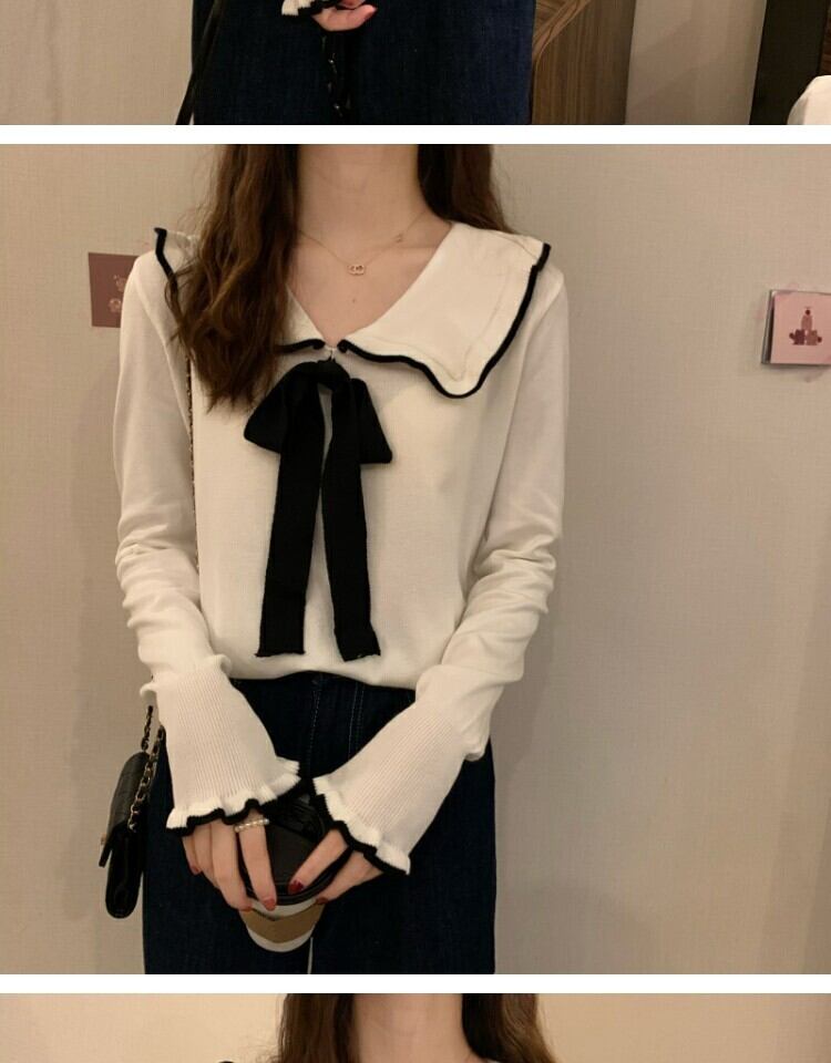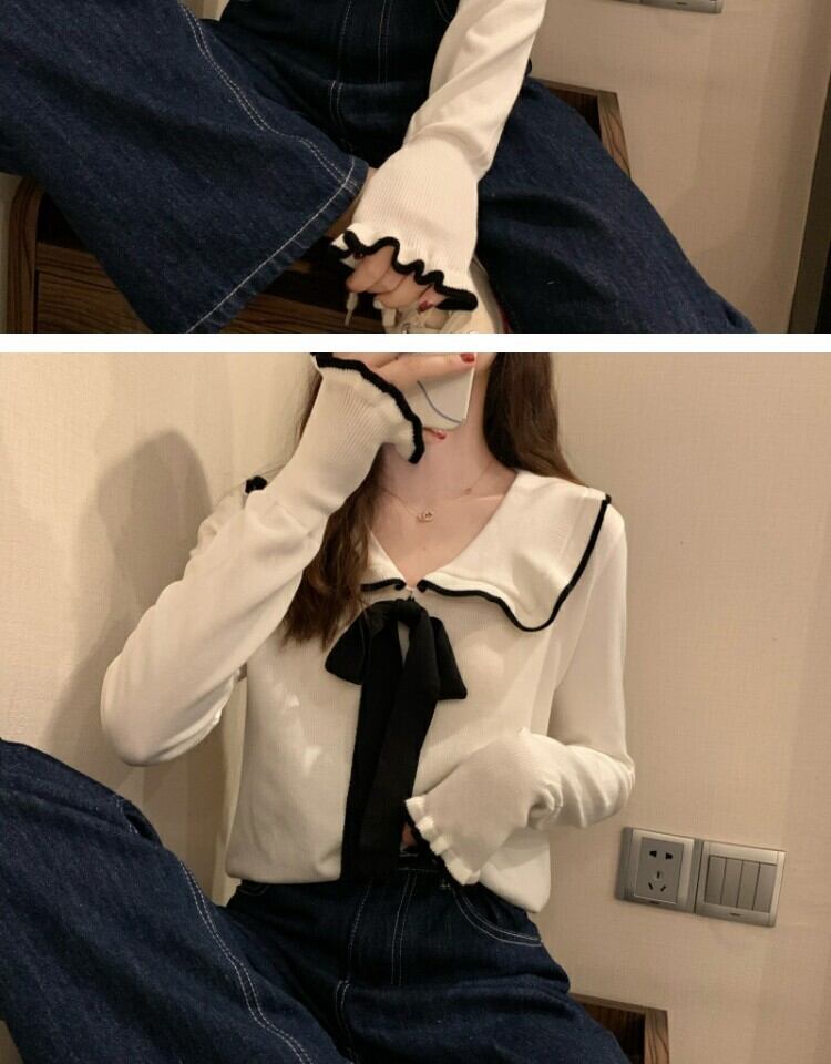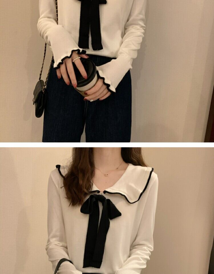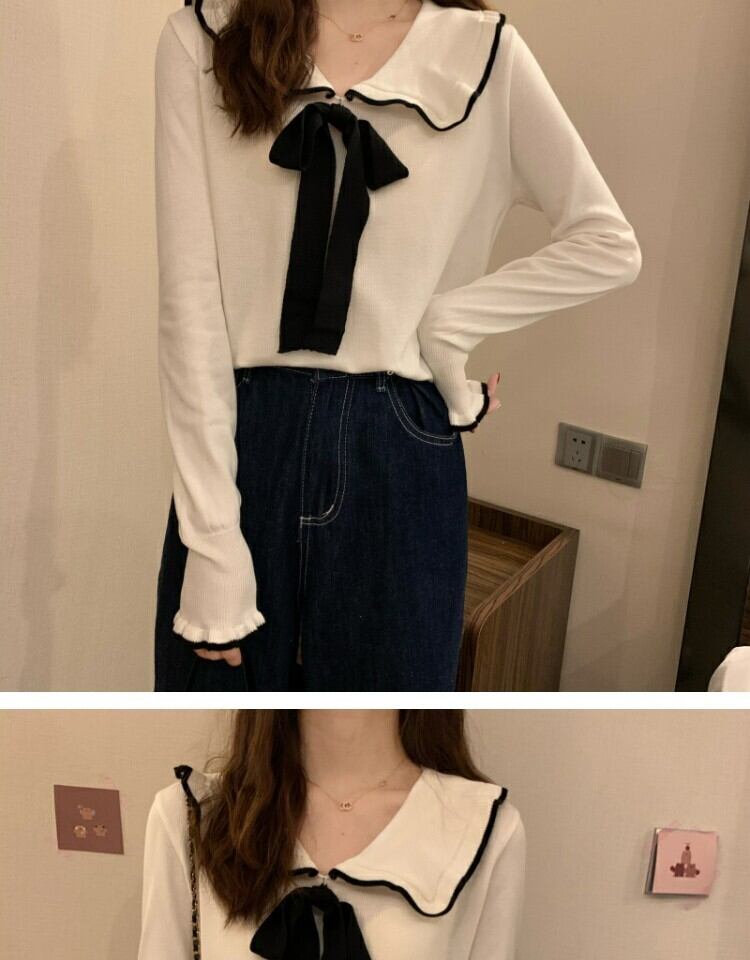 ホワイトシャツ レディーススプリングレースニットTシャツ トップス ロング リボン 春物 レースアップ 萌量不足6223313831