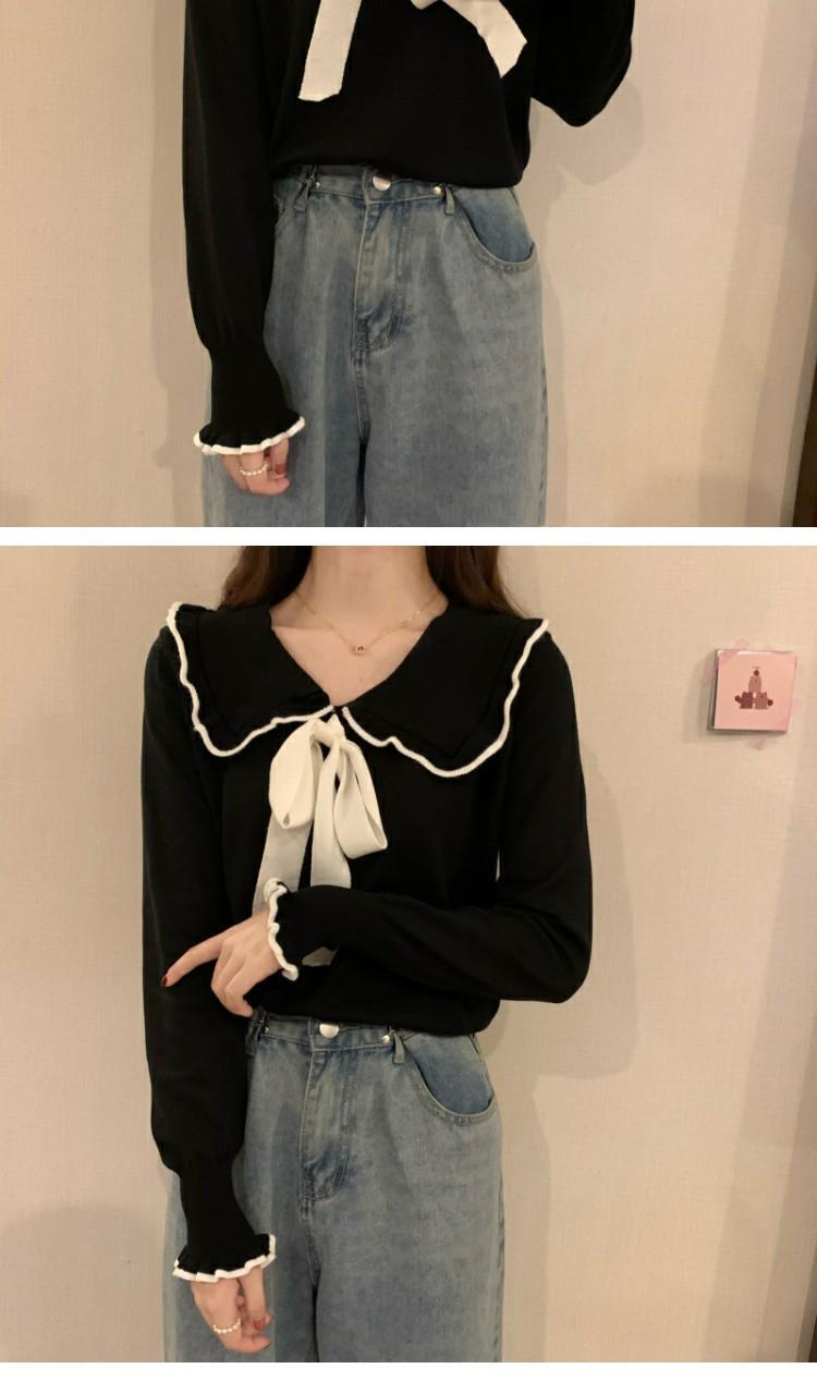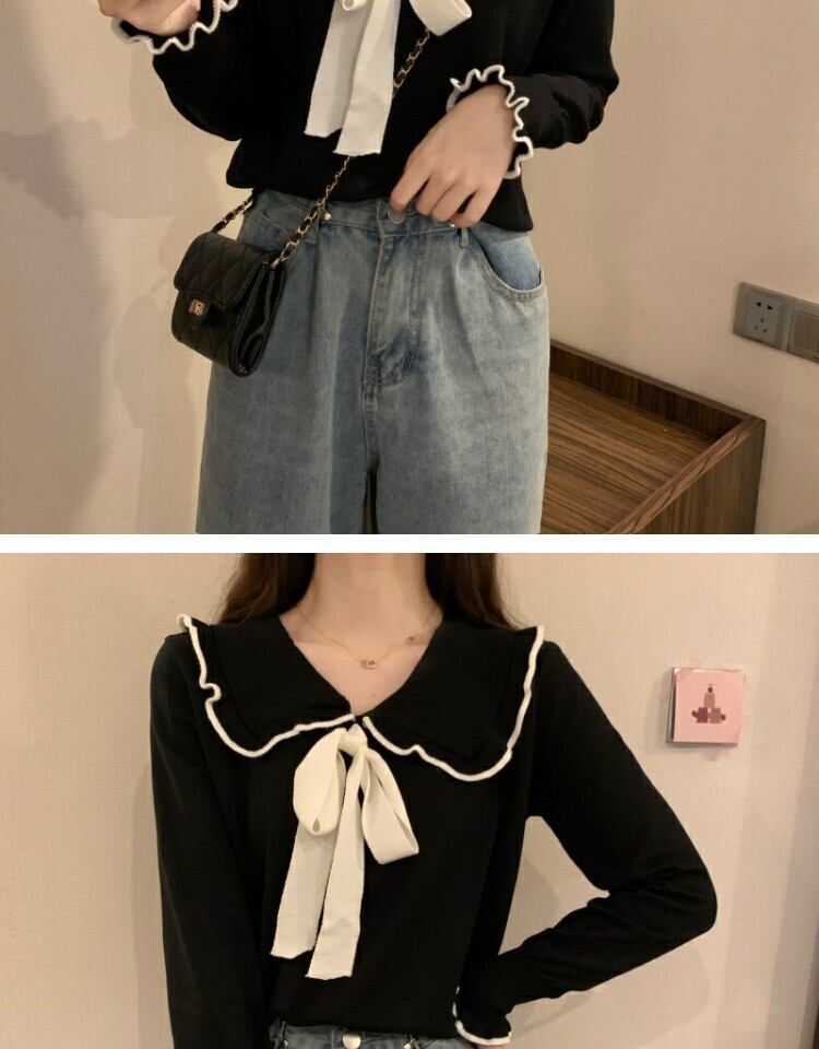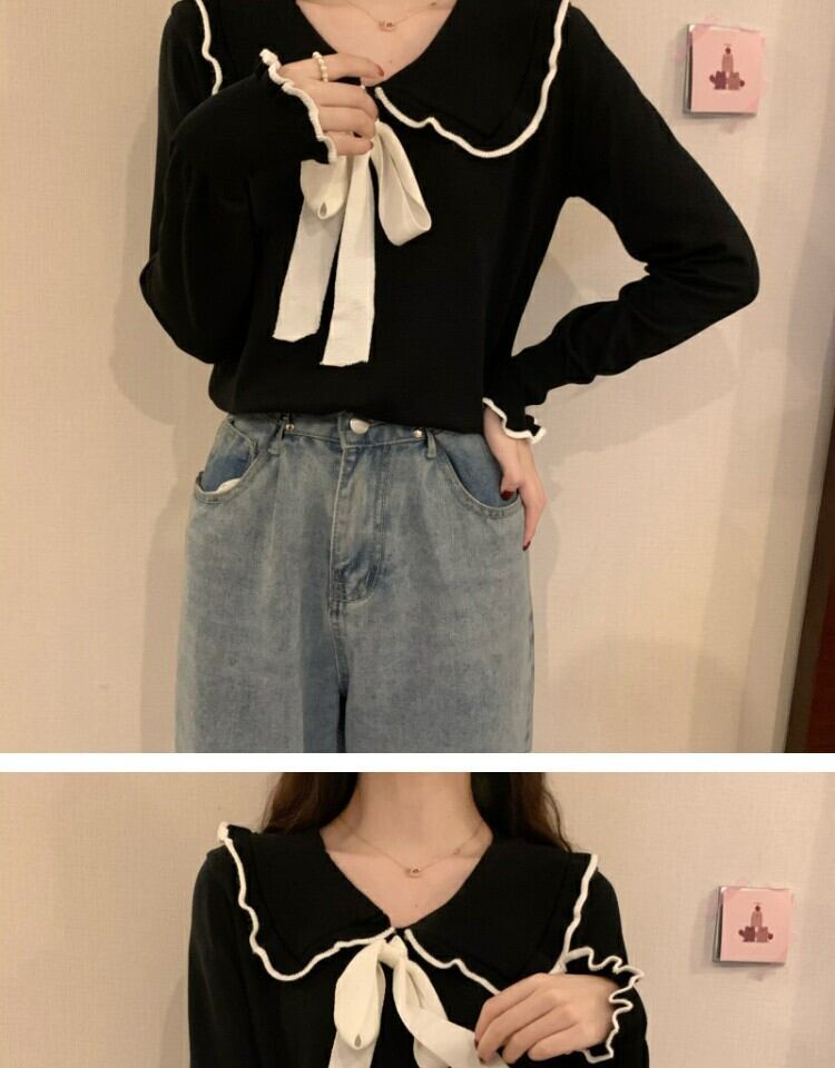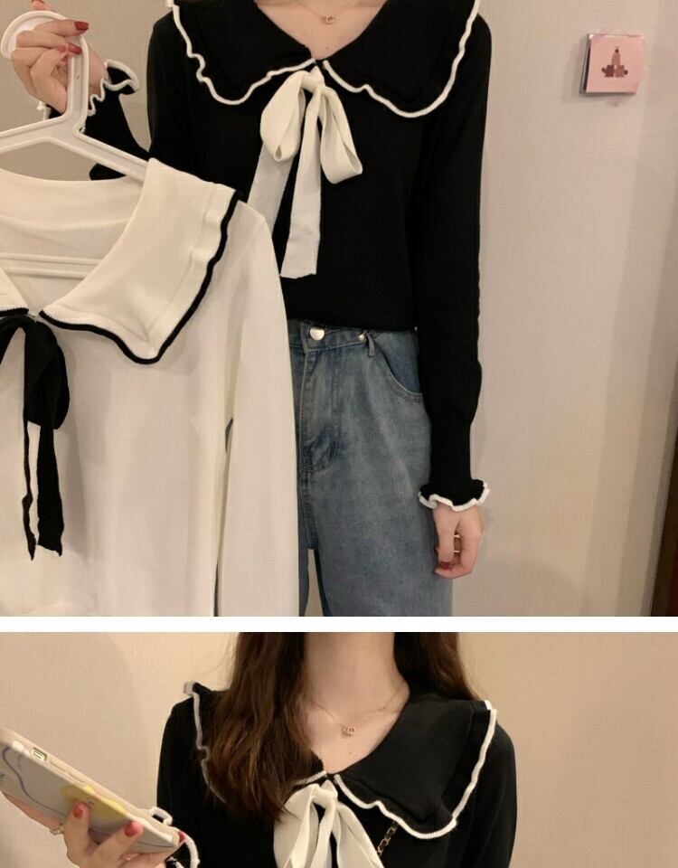 ホワイトシャツ レディーススプリングレースニットTシャツ トップス ロング リボン 春物 レースアップ 萌量不足6223313831