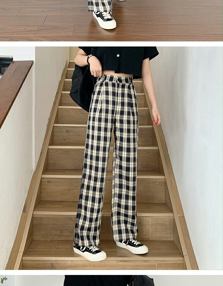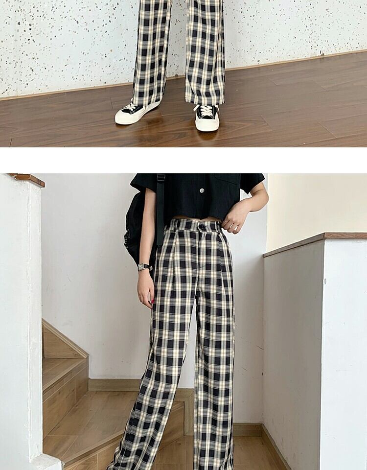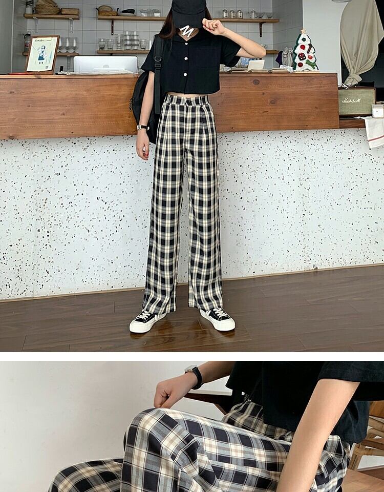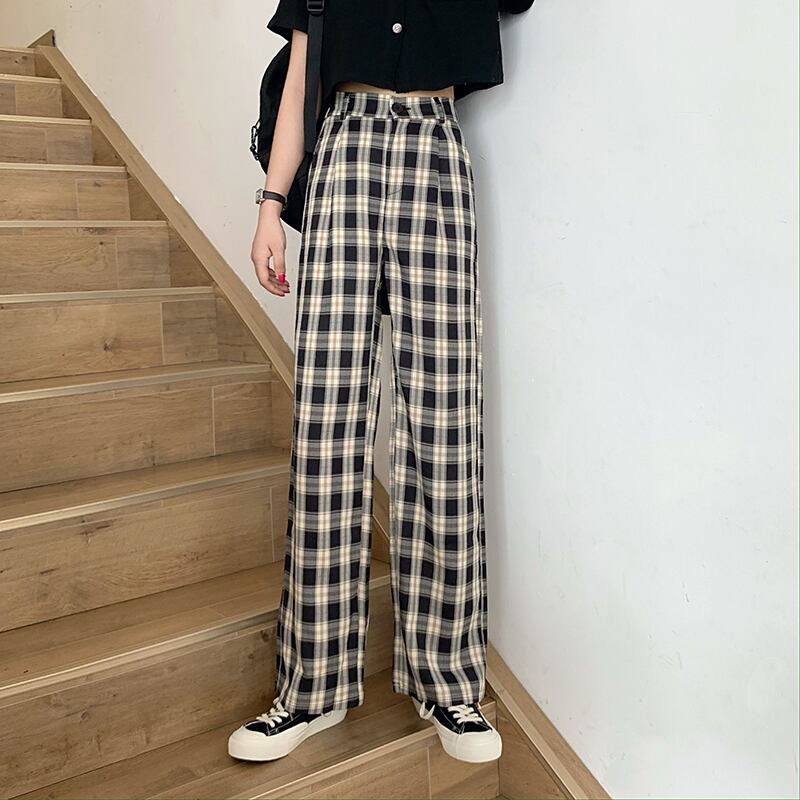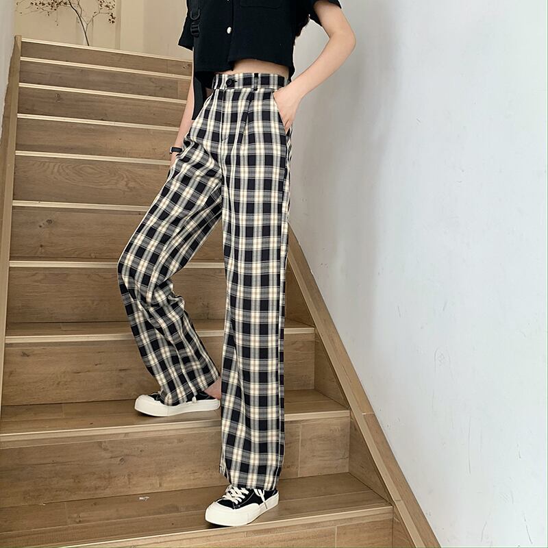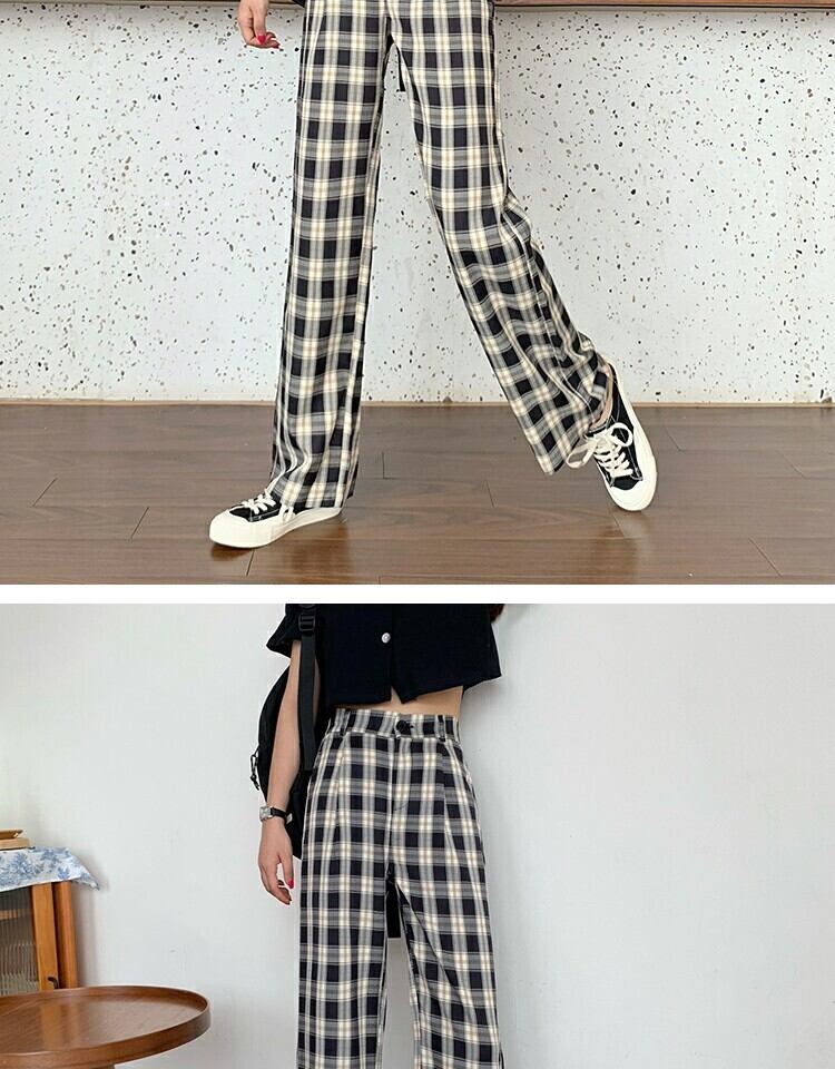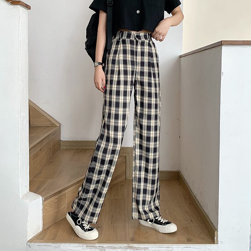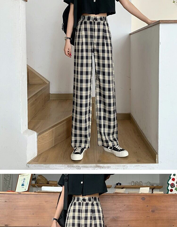 パンツ カジュアルハイウェストウェストワイドレッグサマー格子柄 夏物 ワイドパンツ 萌量不足68539282962