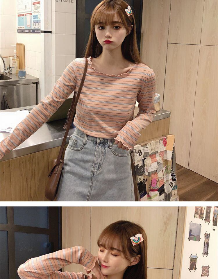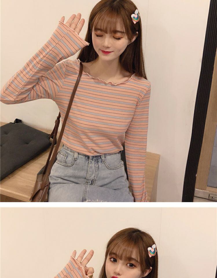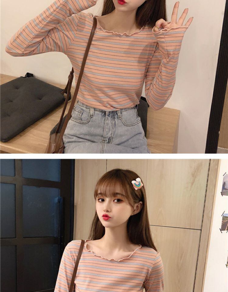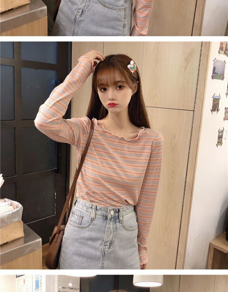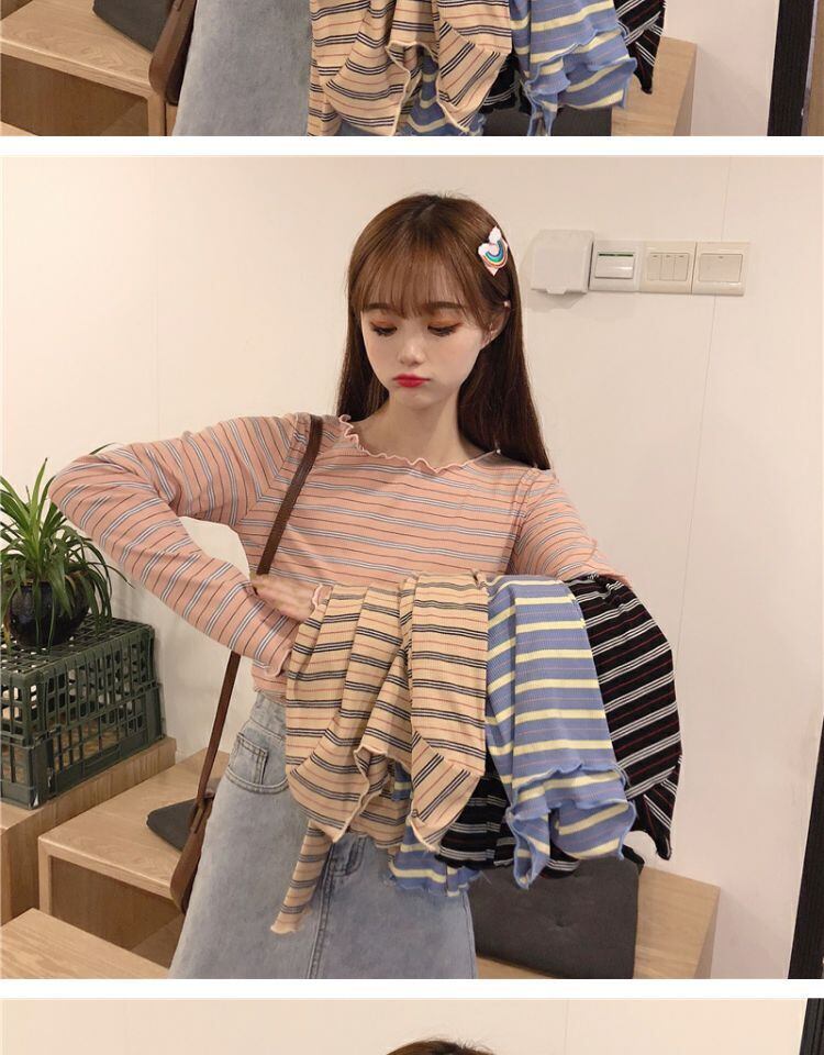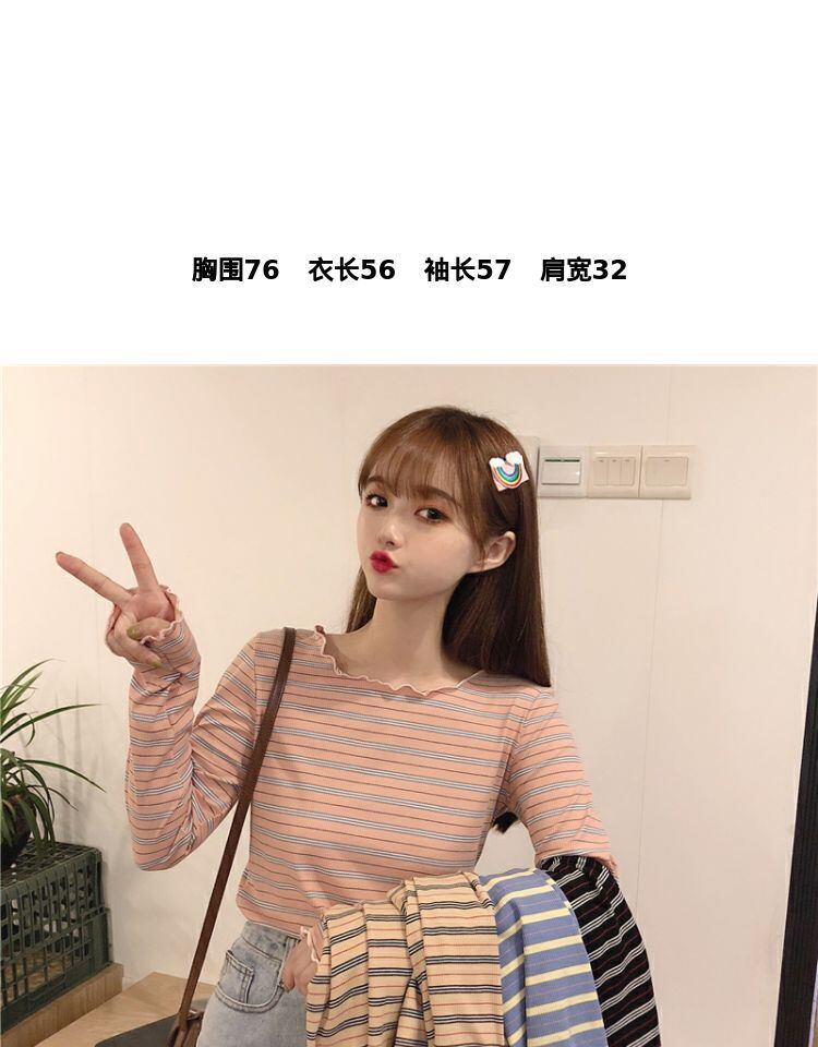 ラウンドネックショートトップス スプリングスリムフィットストライプTシャツ シャツ ロング 春物 Oネック 萌量不足57051459365