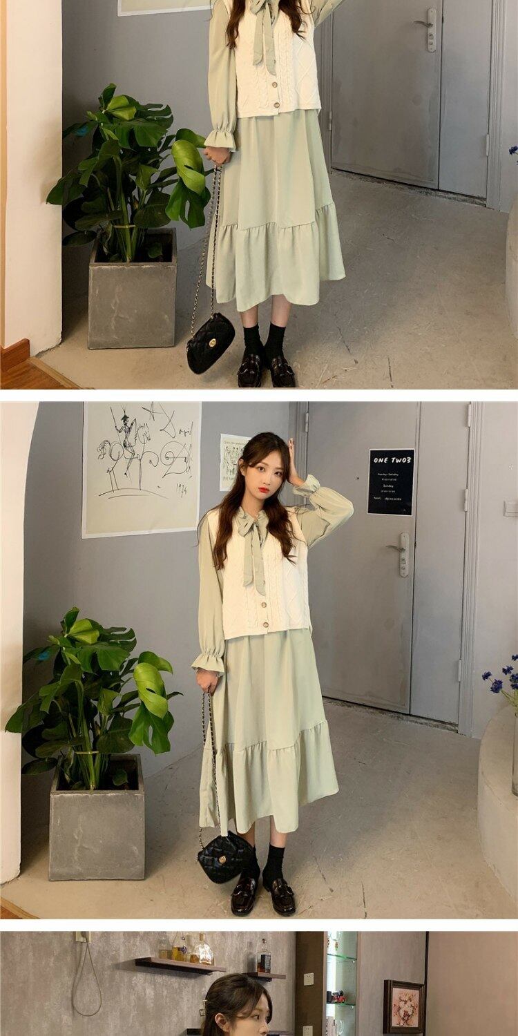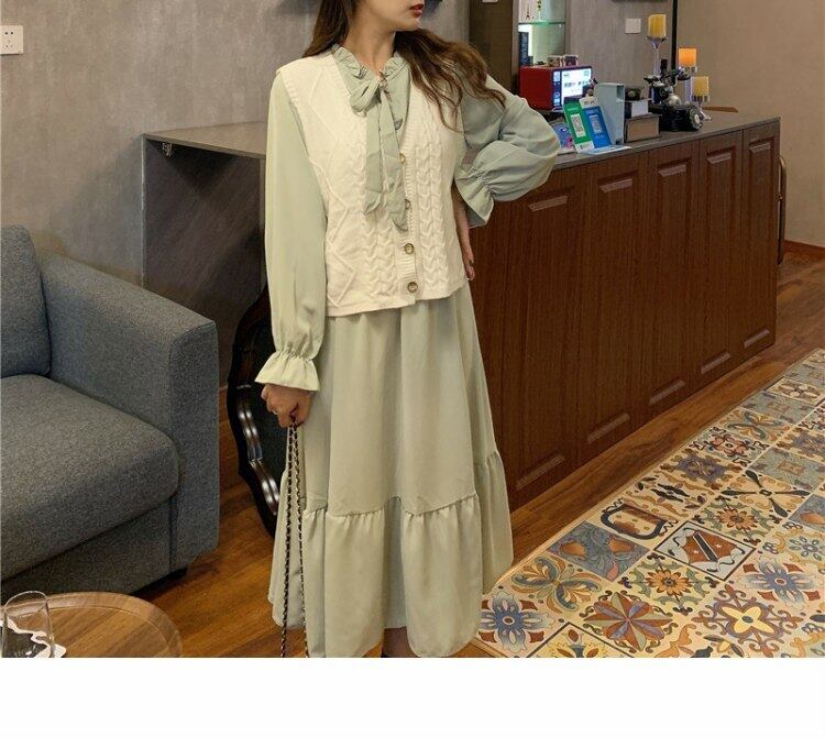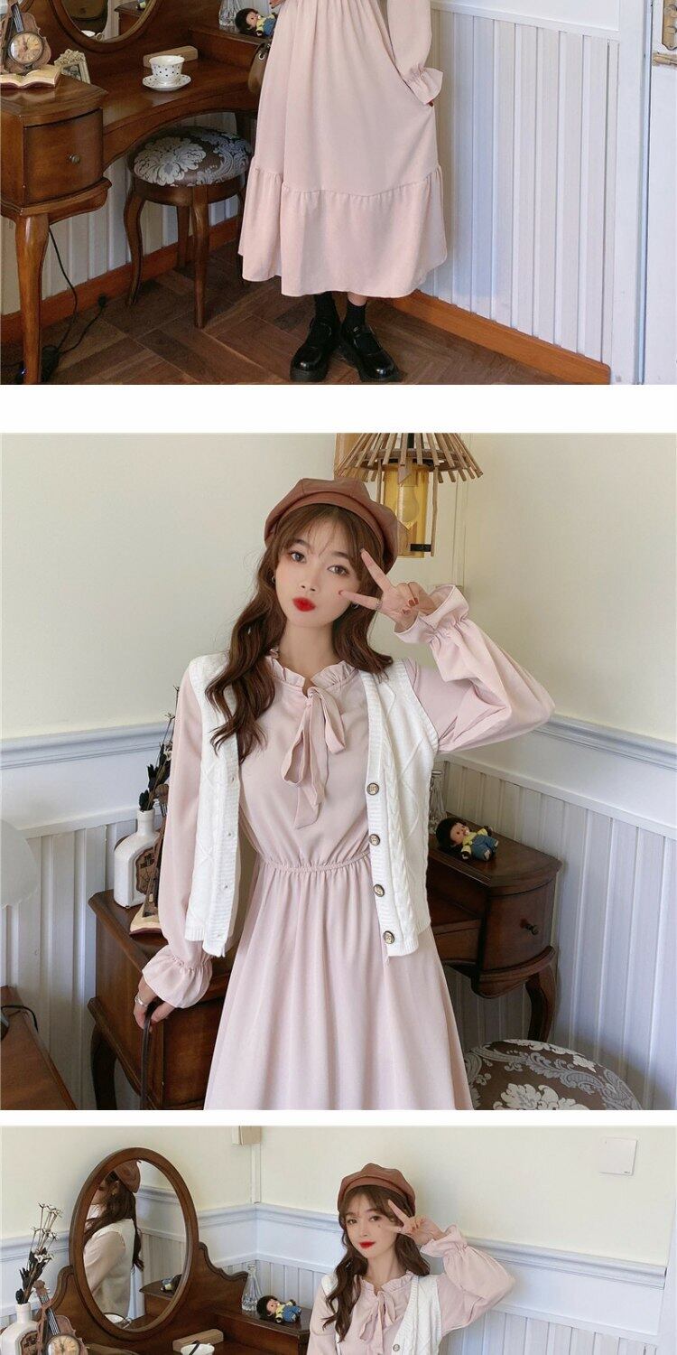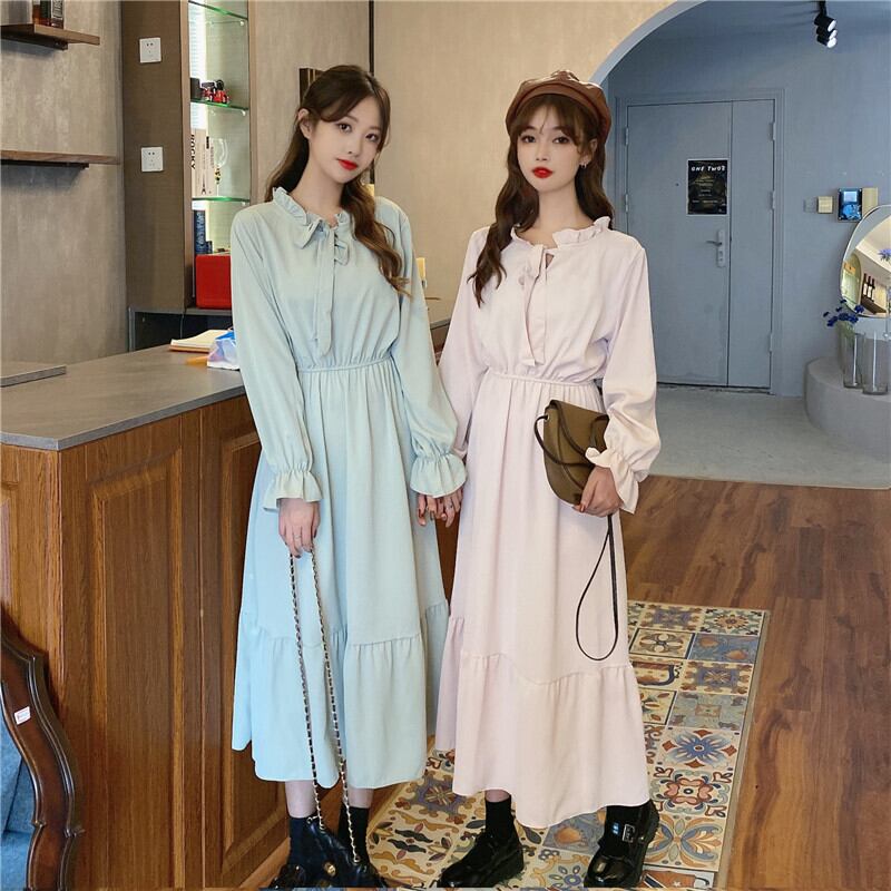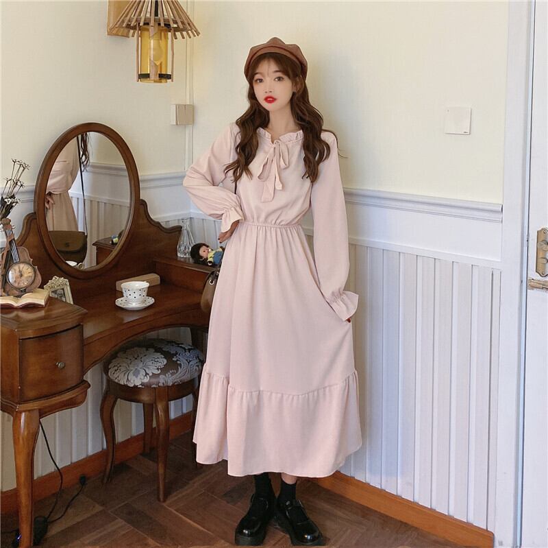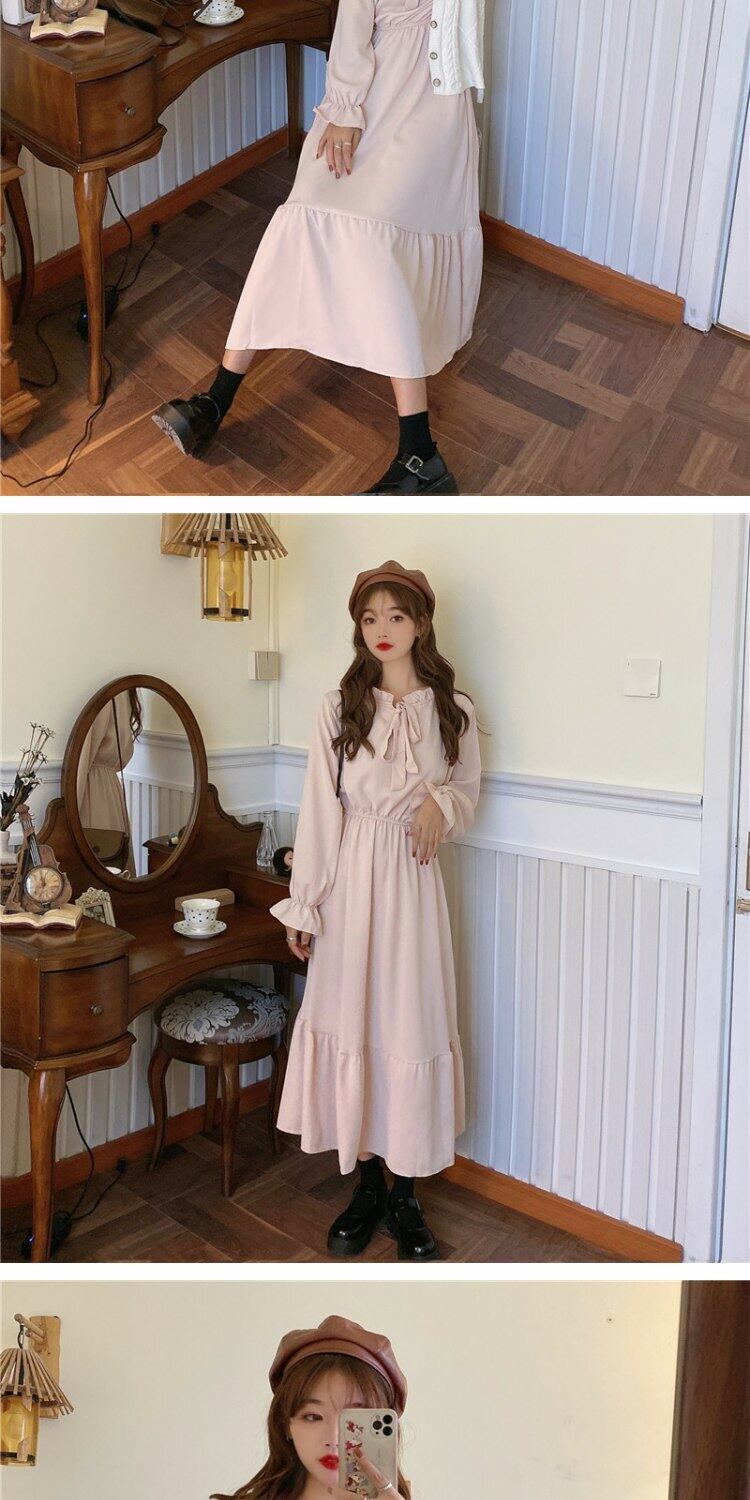 ドレス ソリッド カラーレースリボンレディーススプリングスカート ロング 春物 ソリッドカラー 萌量不足41064300587