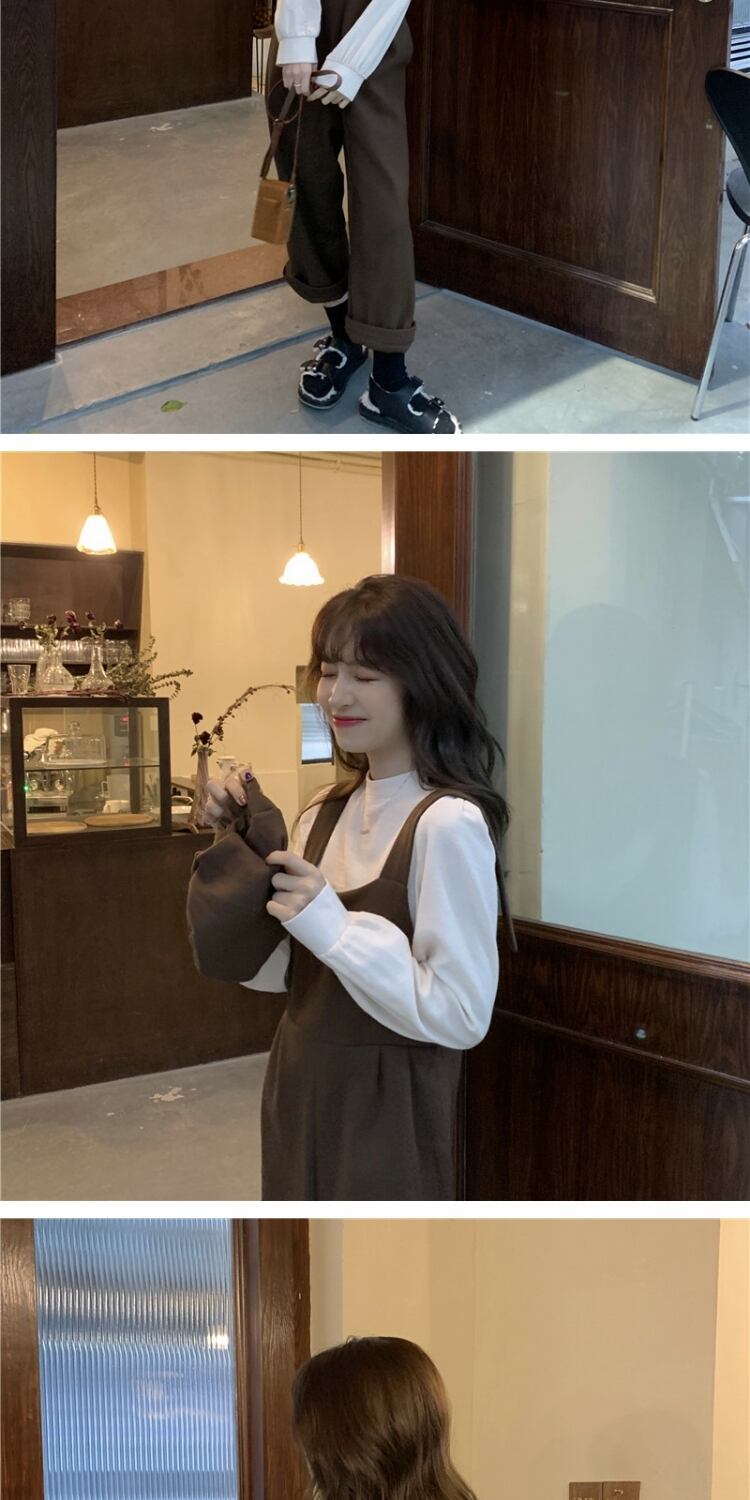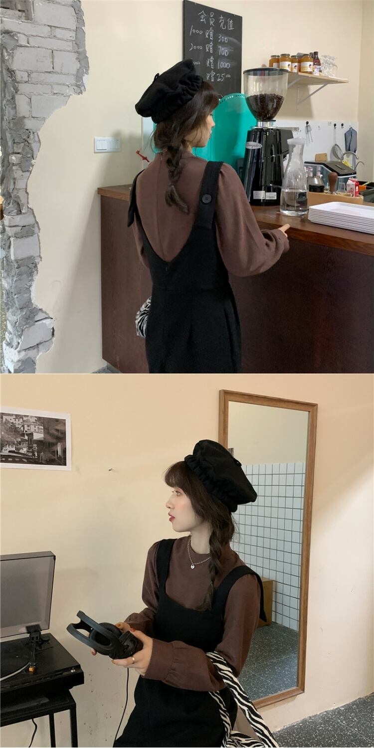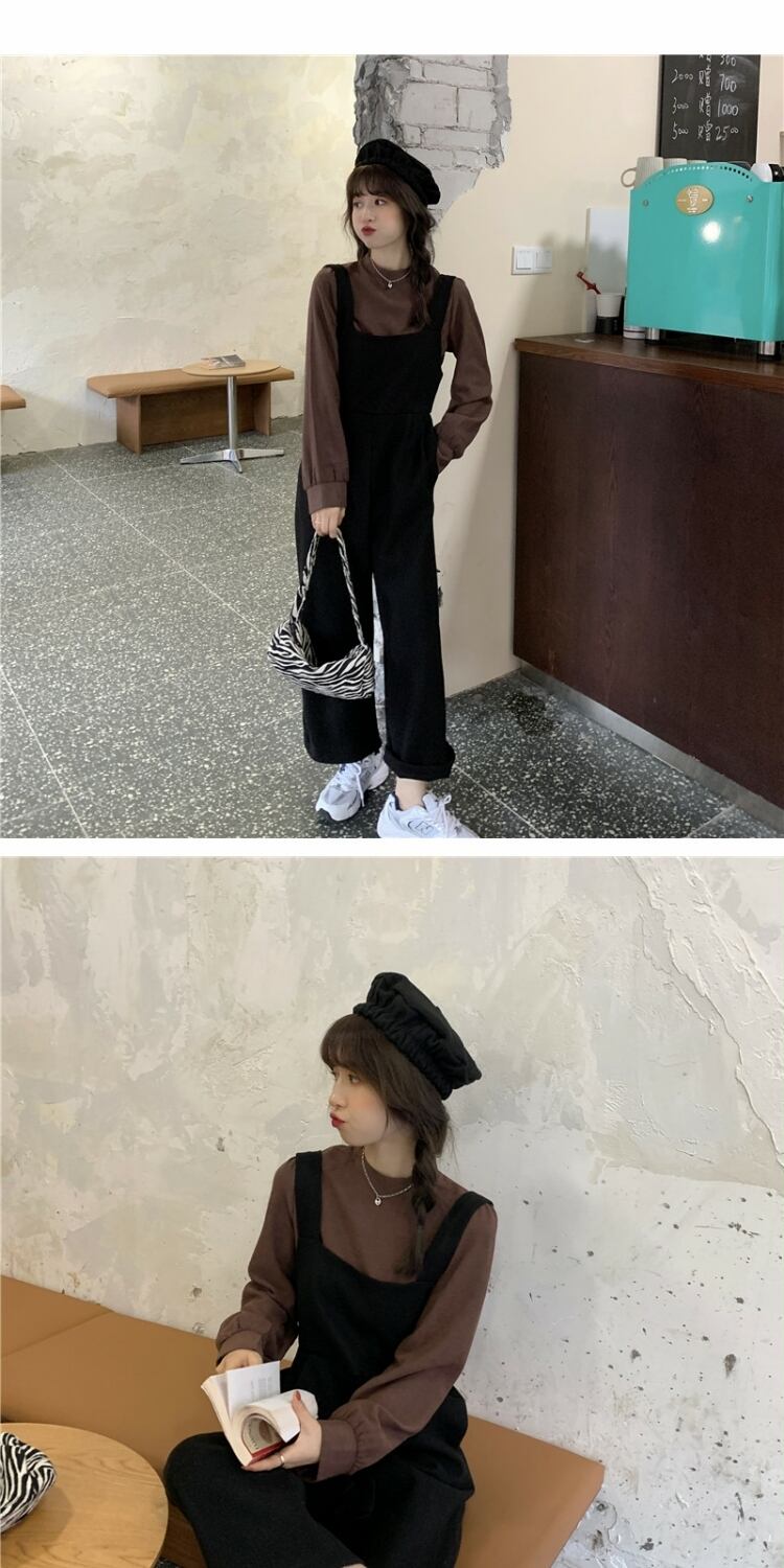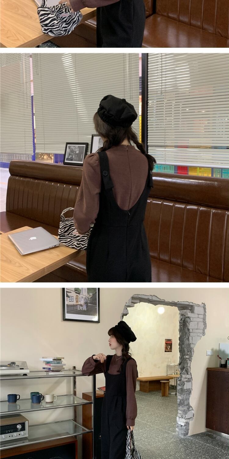 色:ワンピースアプリコットトップ,単色ブラウス,黒よだれかけシングルピース,茶色のオーバーオール1枚