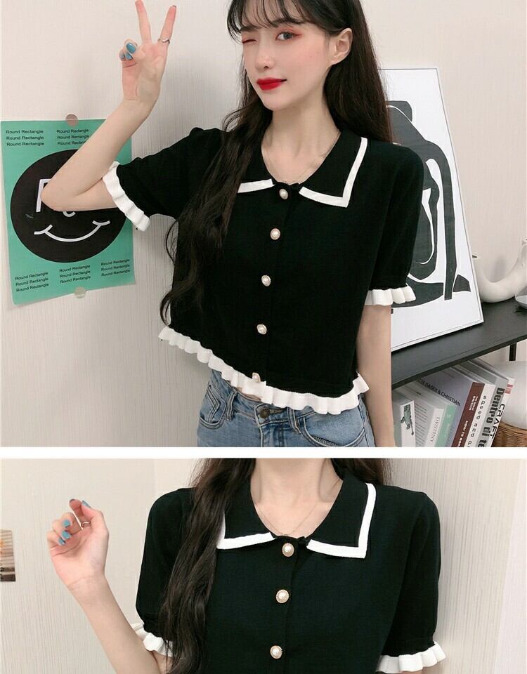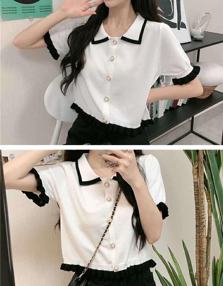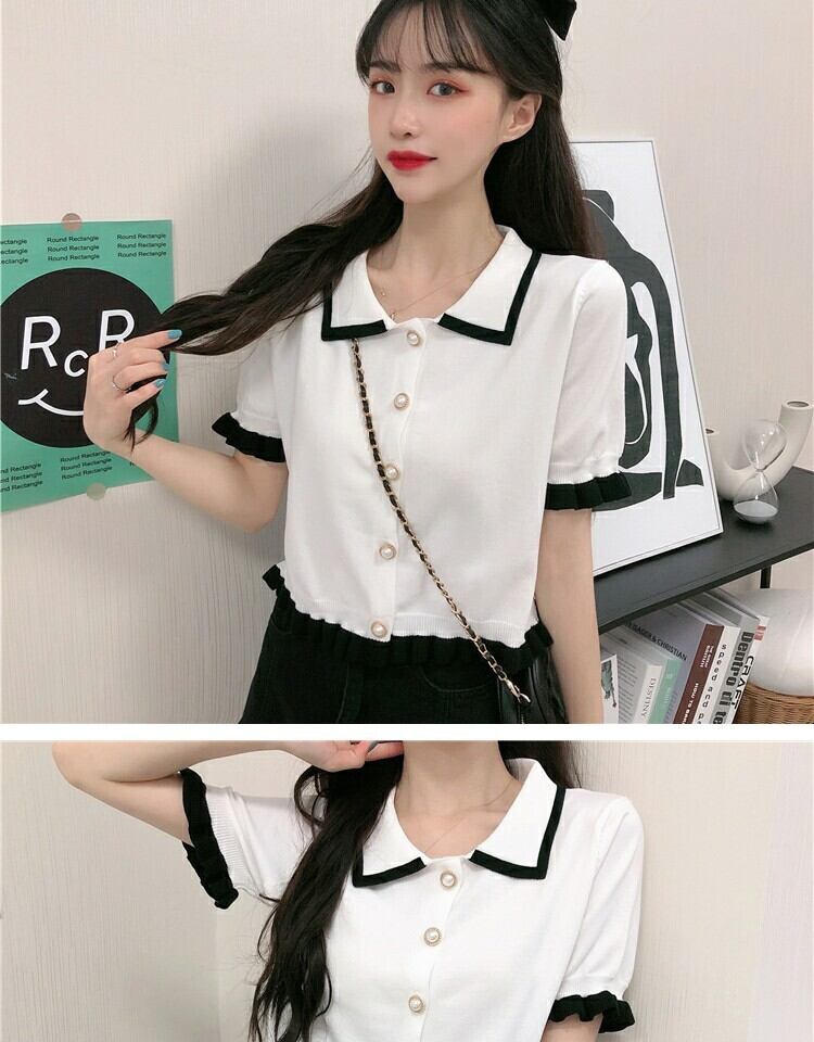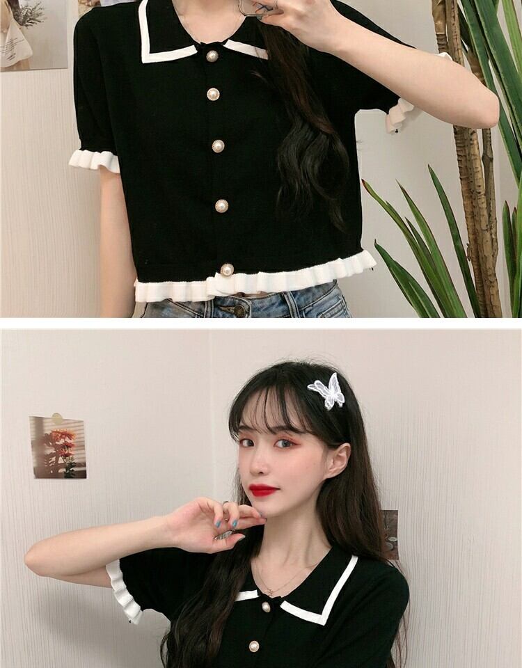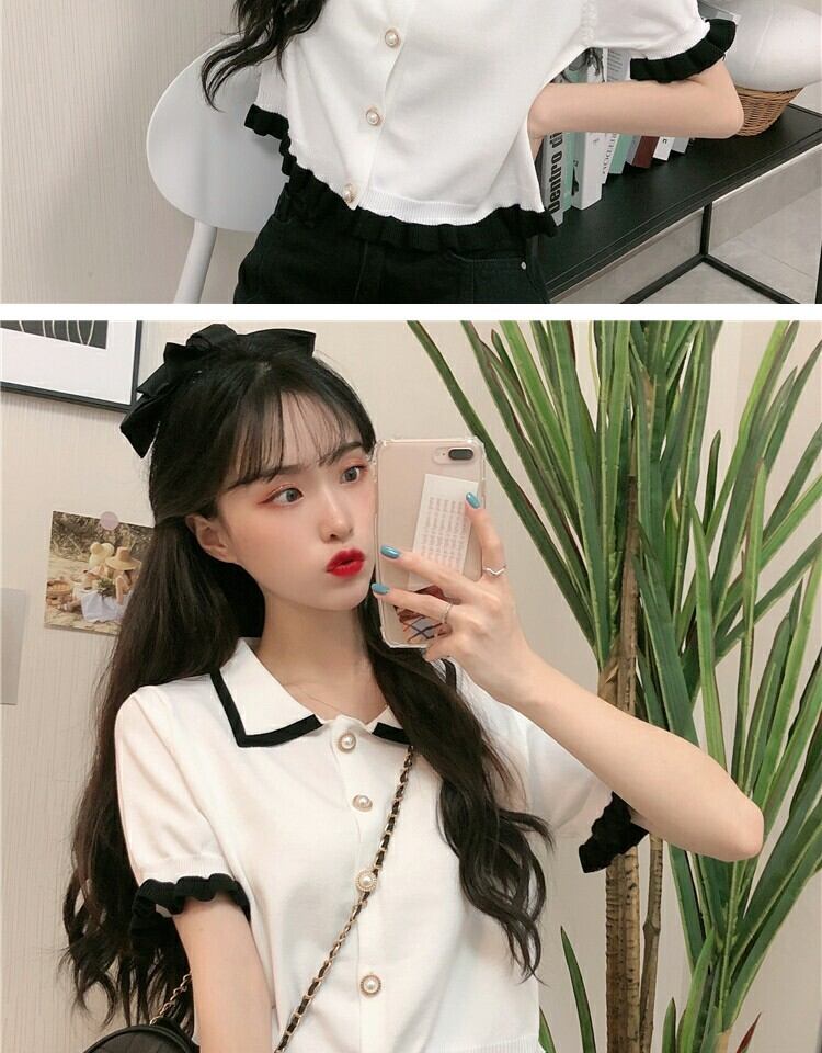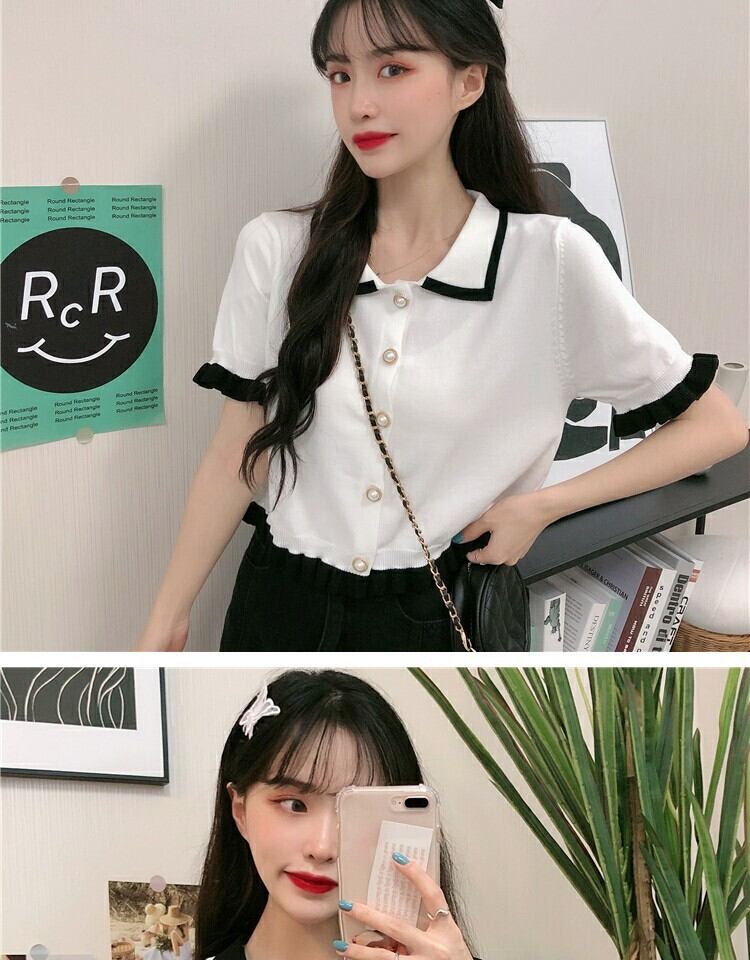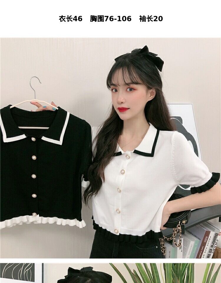 カラーパールバックルニットショートTシャツ サマー薄手トップス 夏物 真珠 萌量不足63233002086