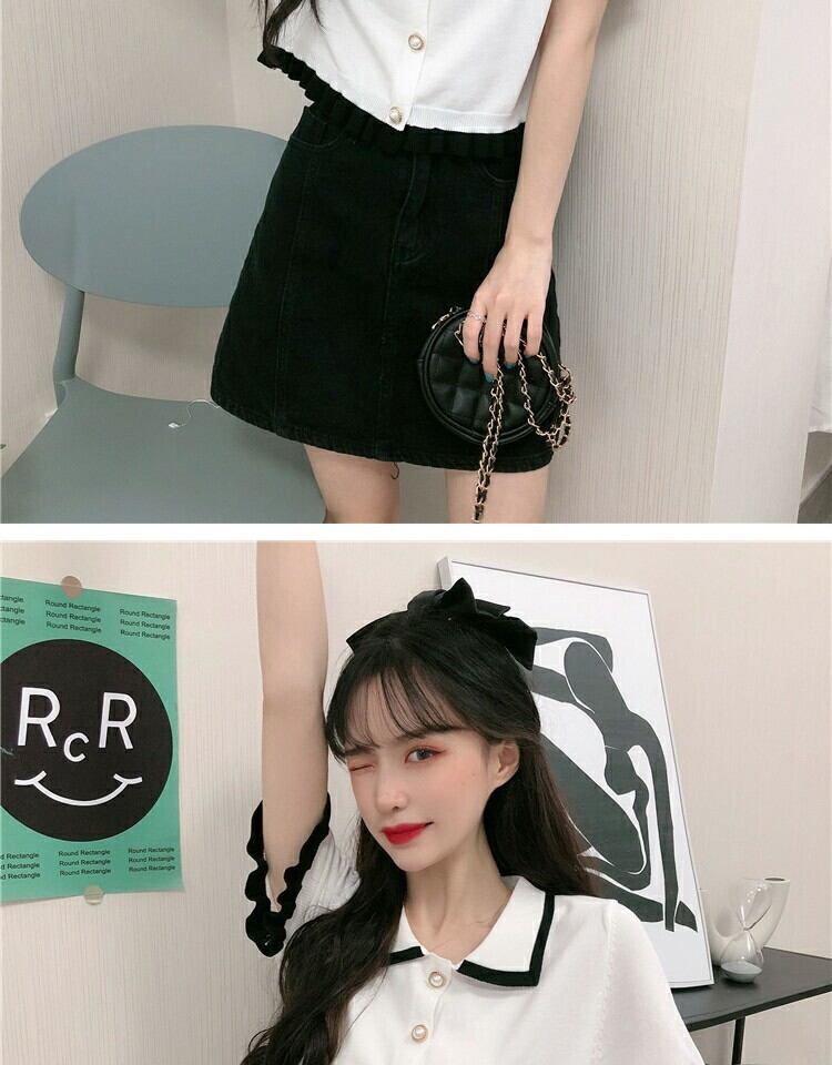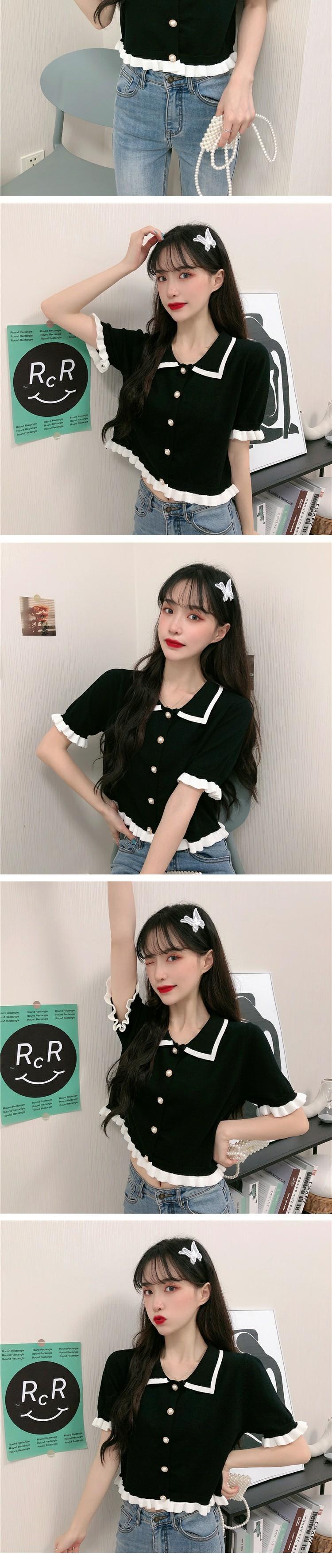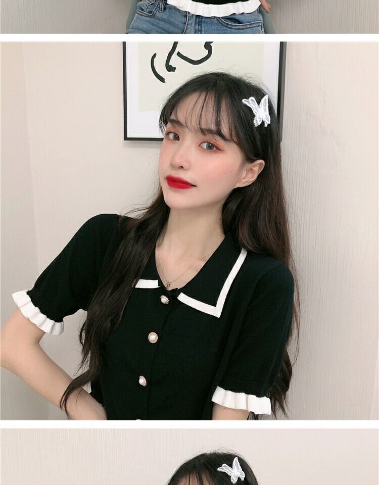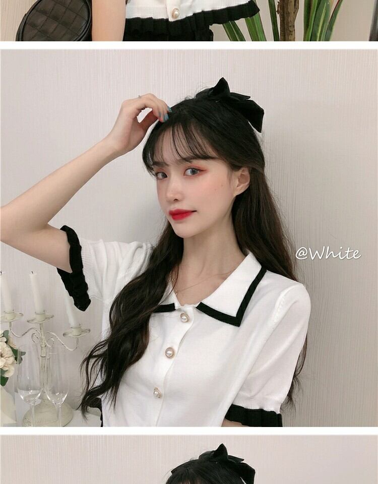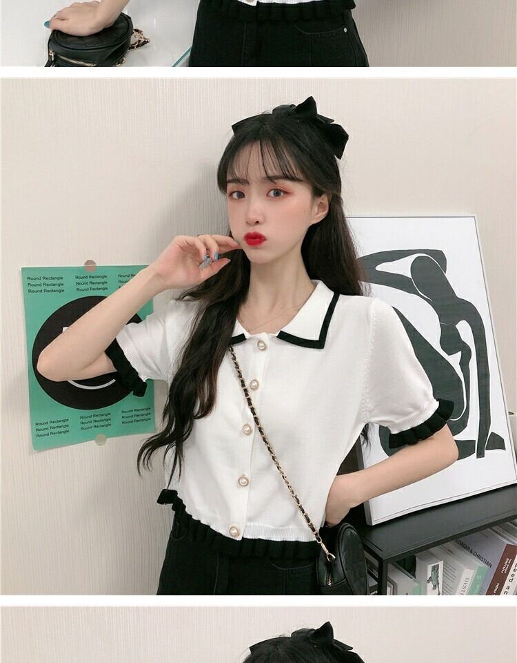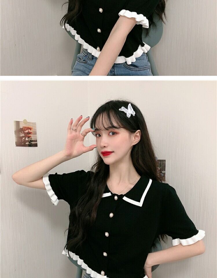 カラーパールバックルニットショートTシャツ サマー薄手トップス 夏物 真珠 萌量不足63233002086