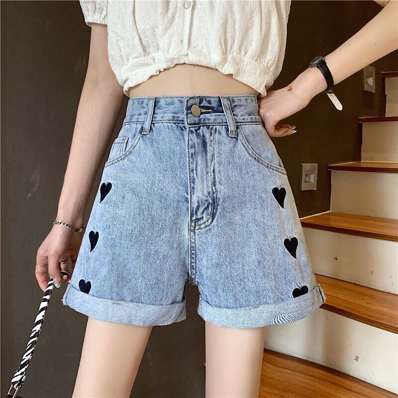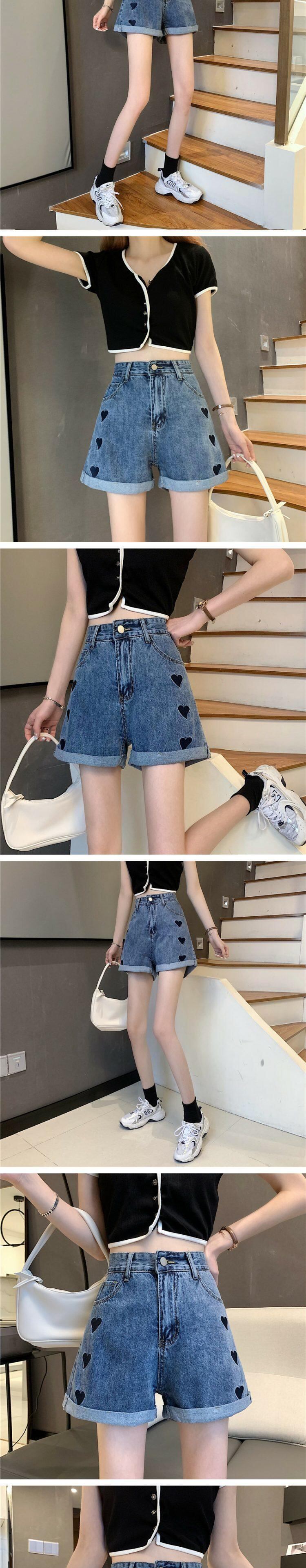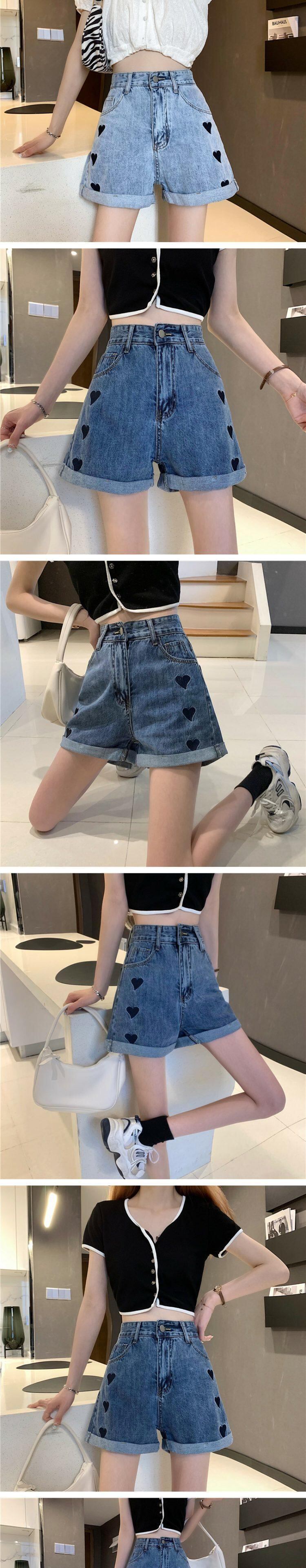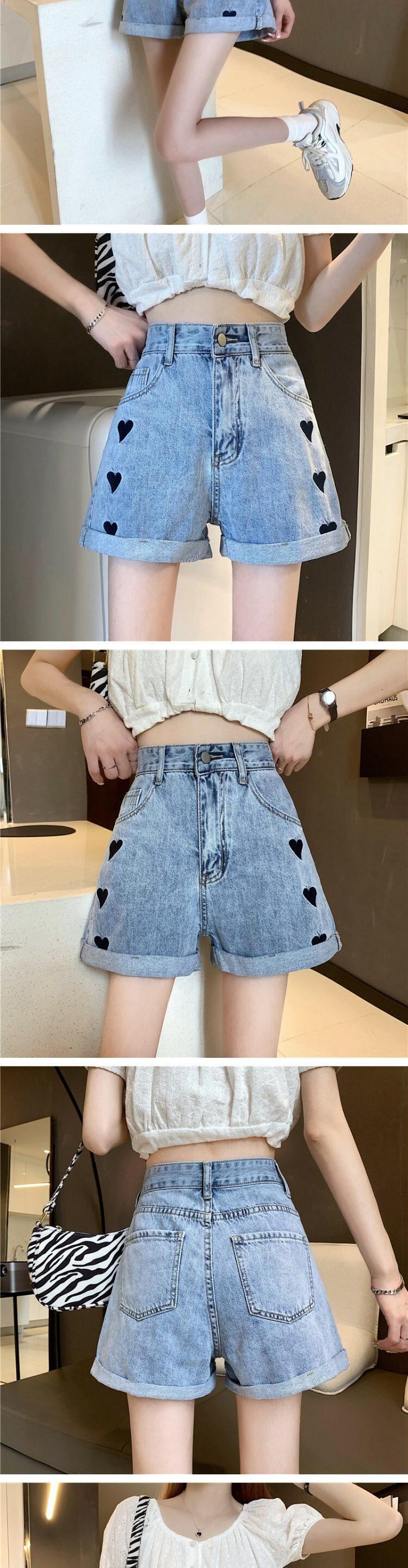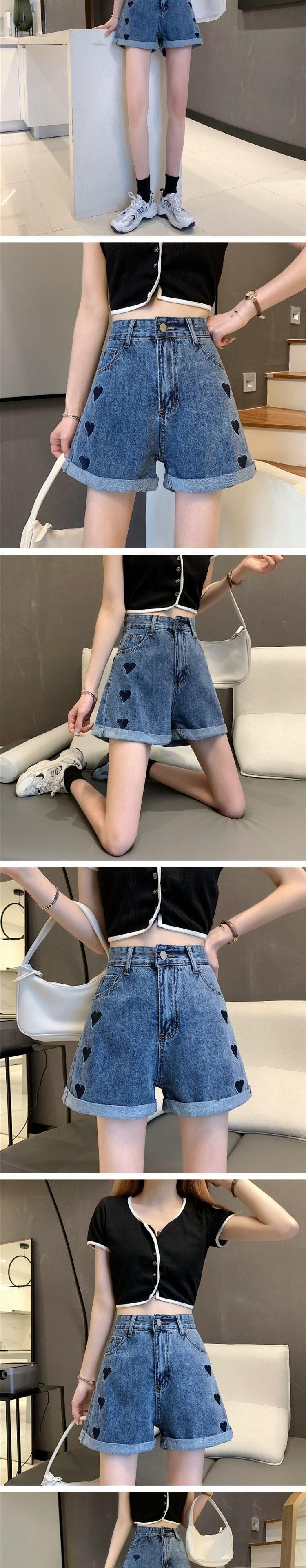 サマーハート刺繍ジーンズ ハイウェストウェスト薄手ルーズショーツ スタンダードパンツ レトロ 夏物 ブルマー 萌量不足55272283758