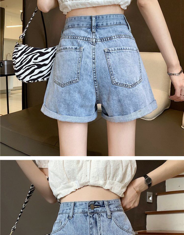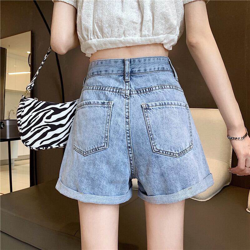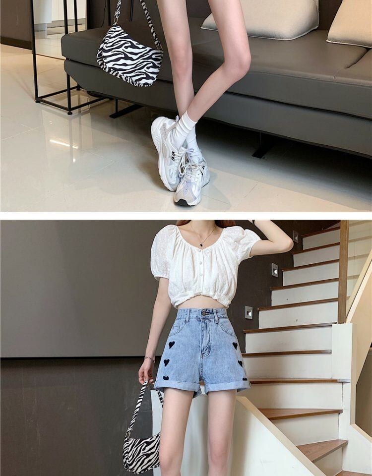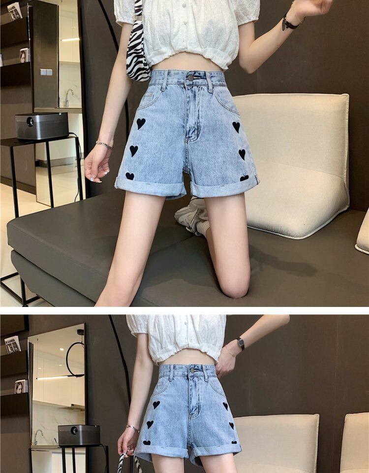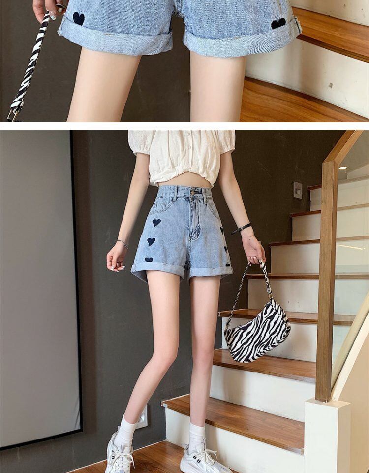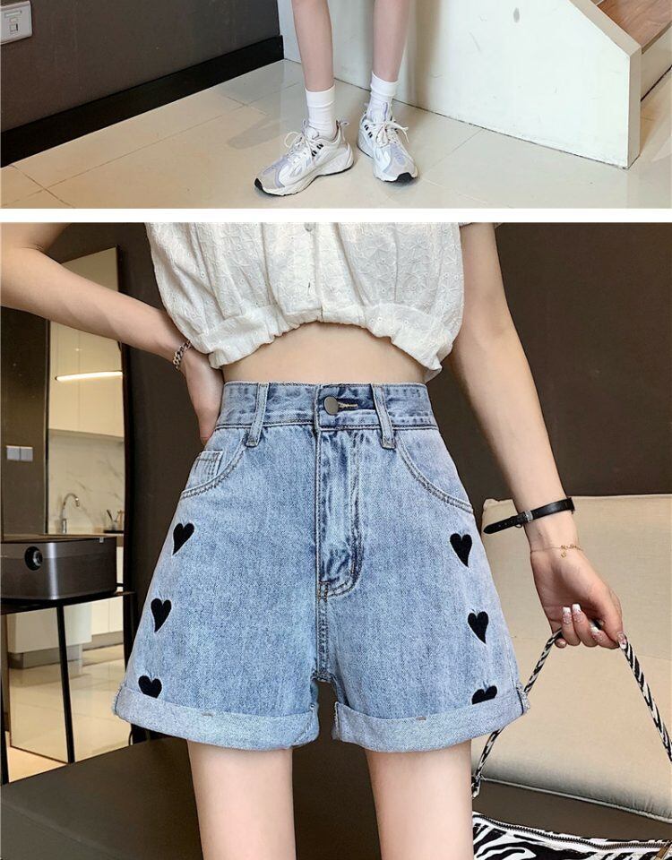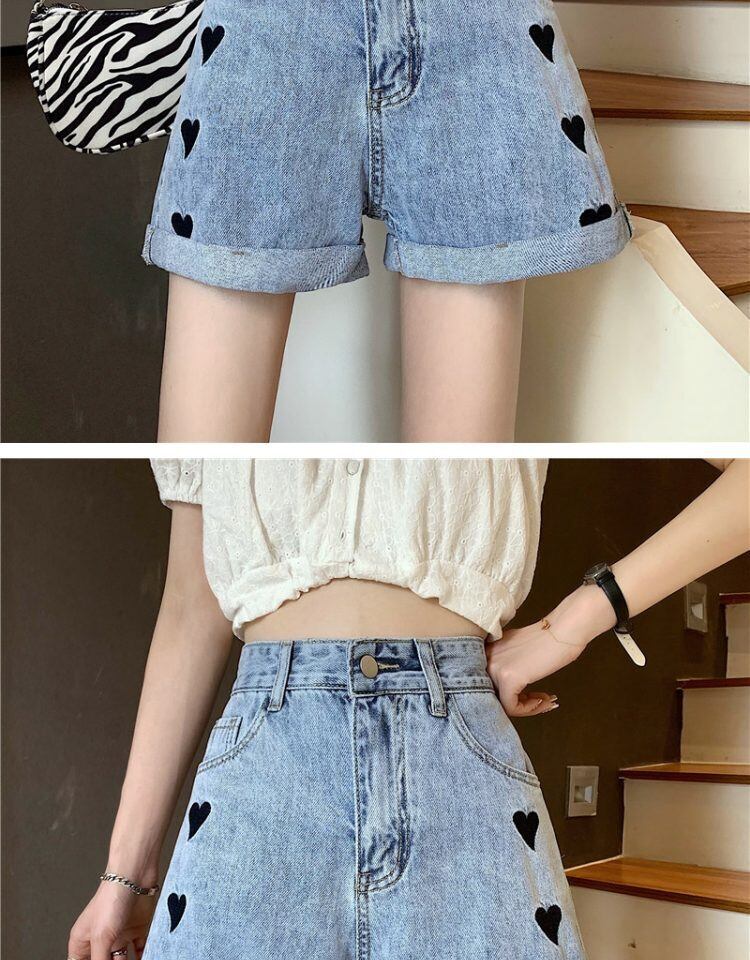 サマーハート刺繍ジーンズ ハイウェストウェスト薄手ルーズショーツ スタンダードパンツ レトロ 夏物 ブルマー 萌量不足55272283758