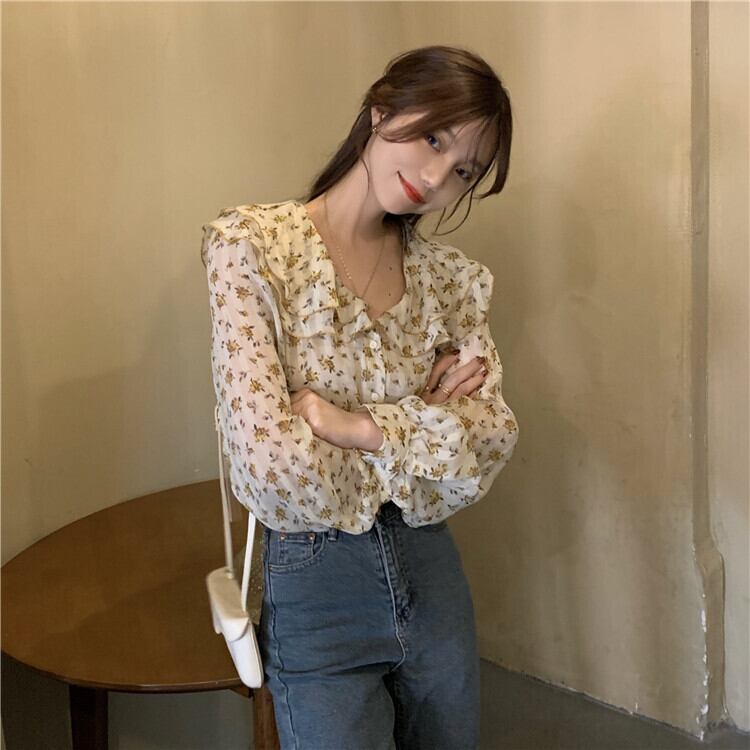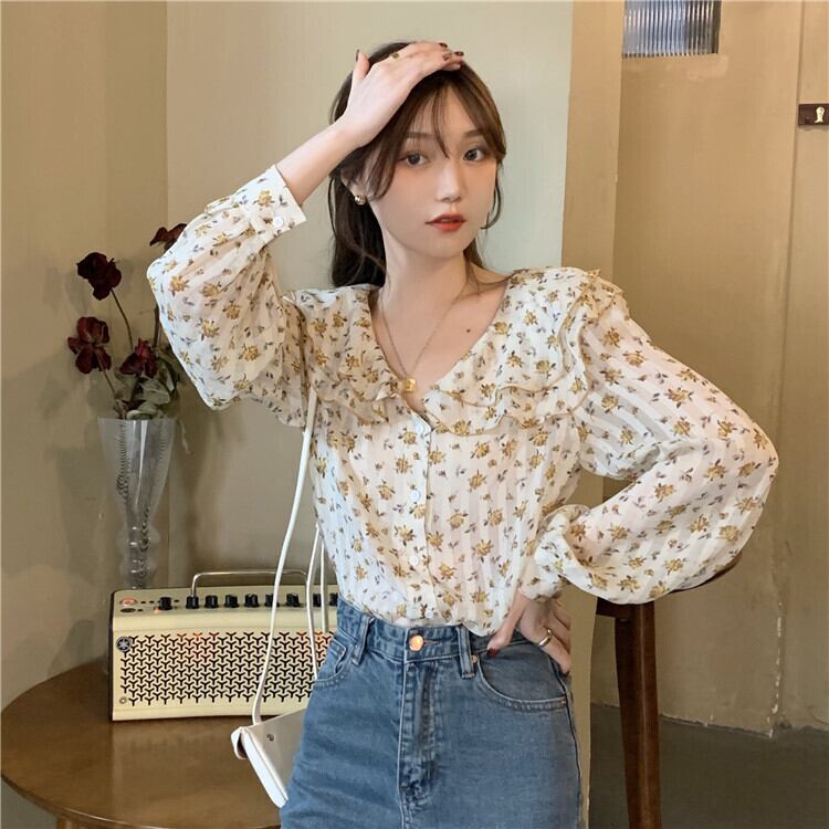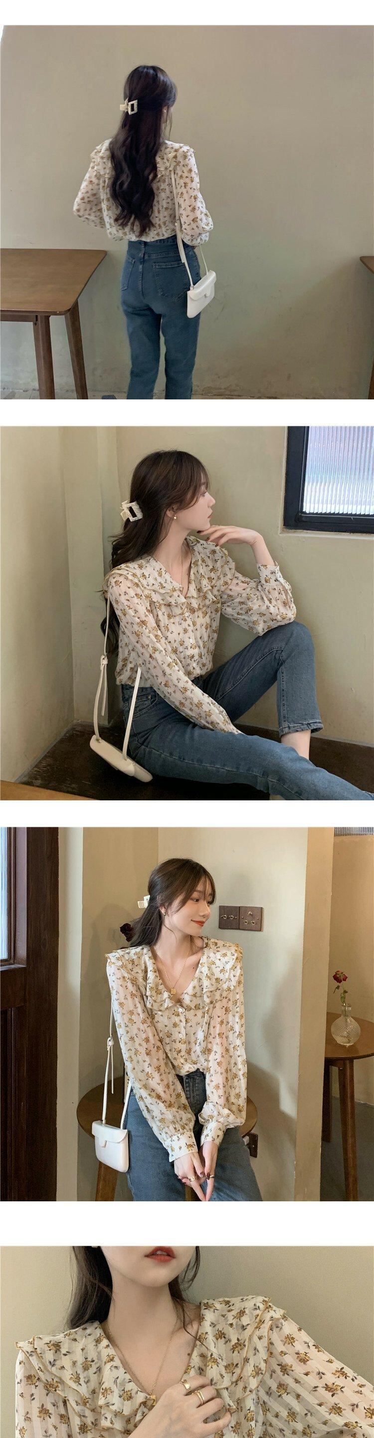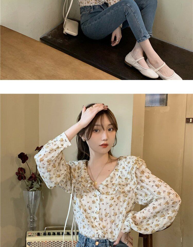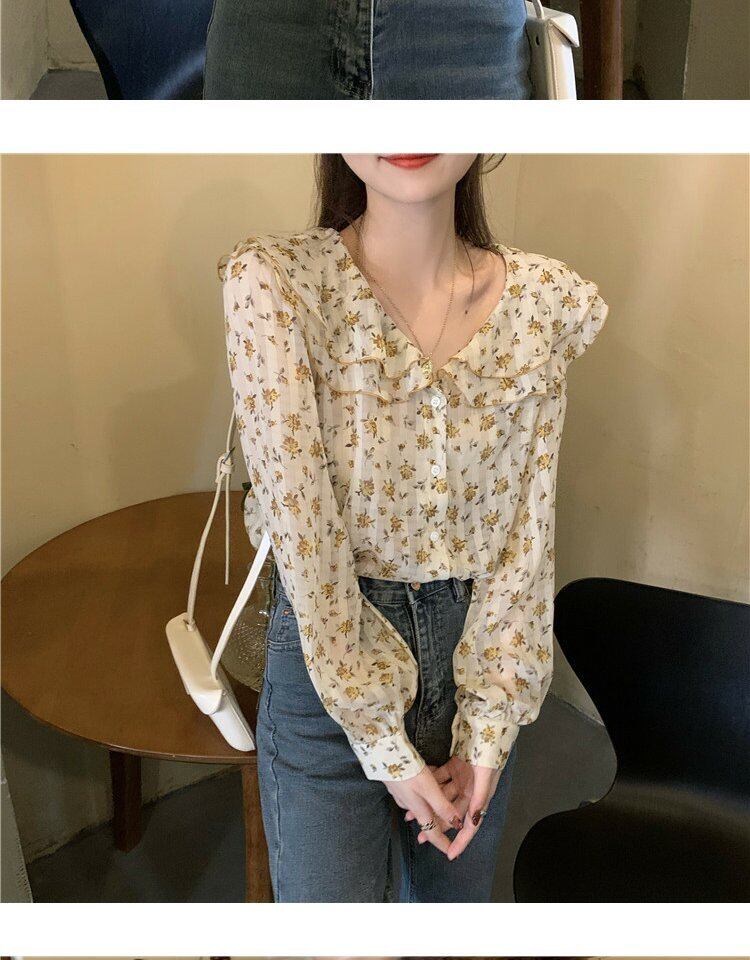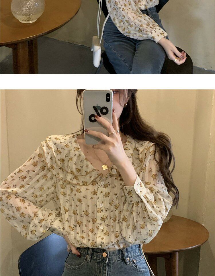 スタンダードフローラルシャツ カラースリーブルーズスタイルトップス ロング レトロ 花柄 萌量不足18205968227