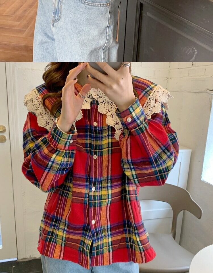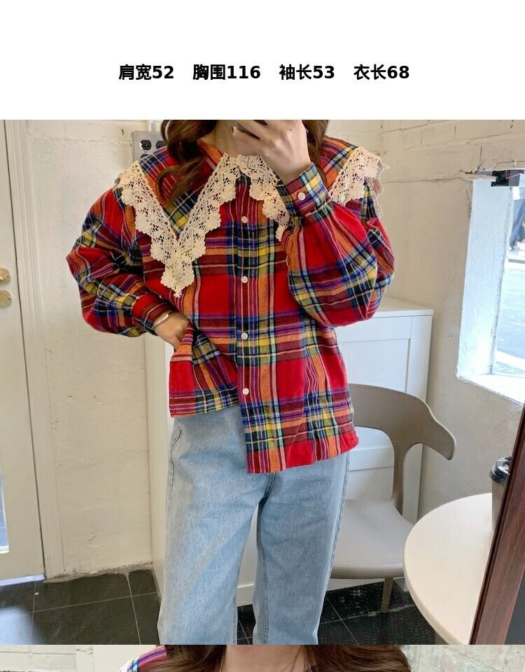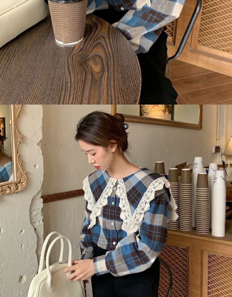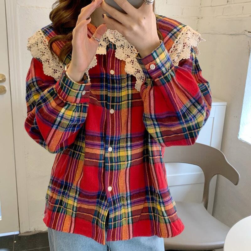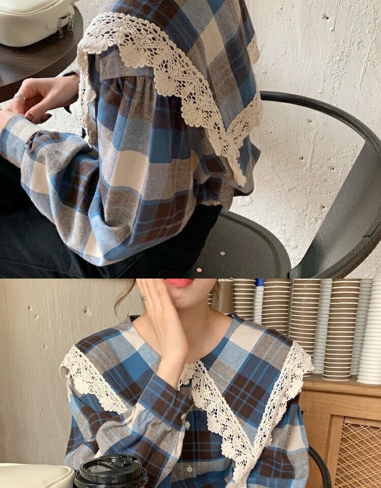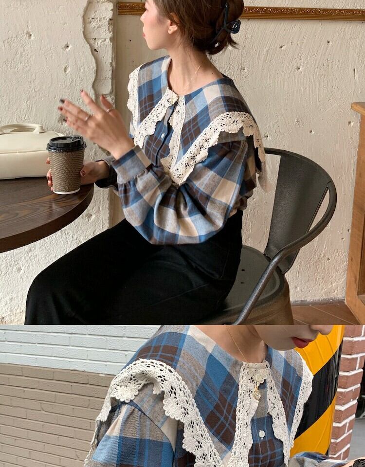 格子柄シャツ スプリングカラーレースブラウス 大人ガーリー スウィート キュート カジュアル 春物 ステッチ 萌量不足17046771390