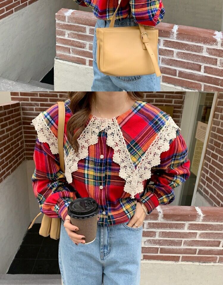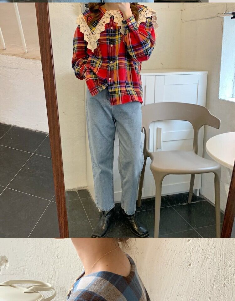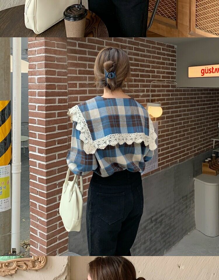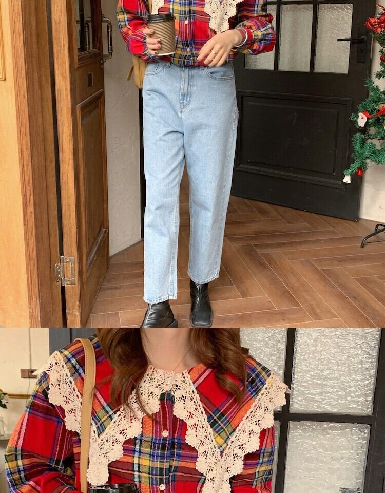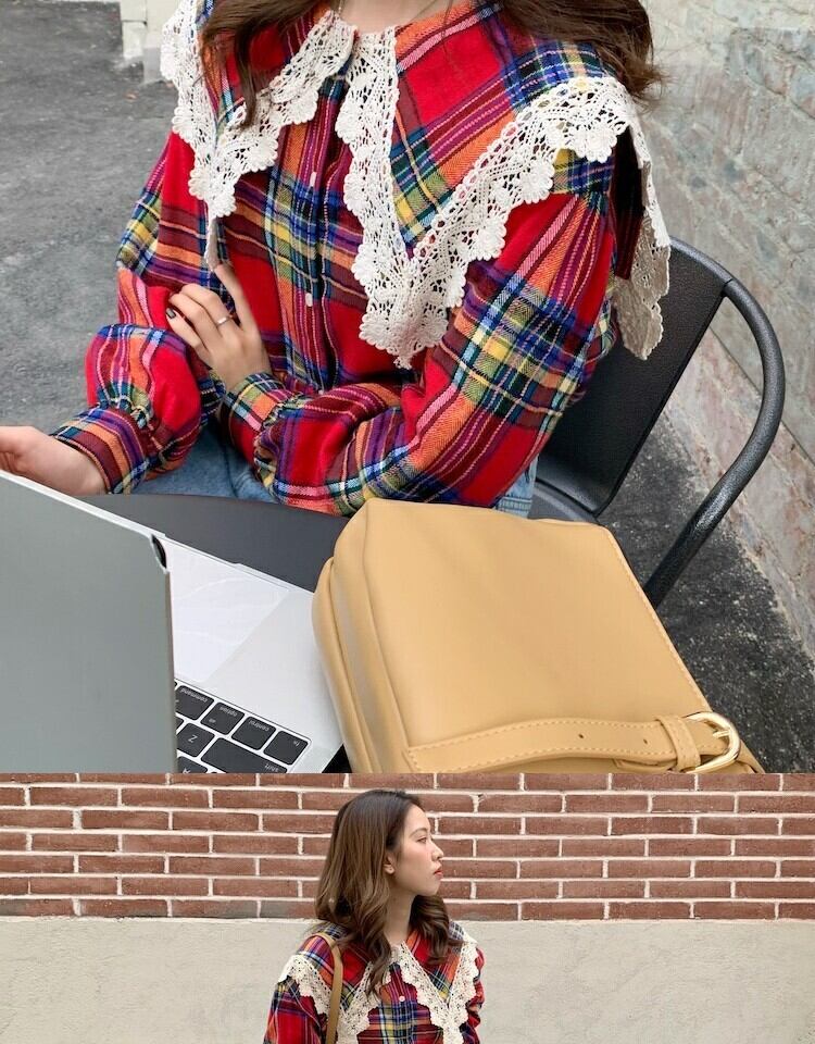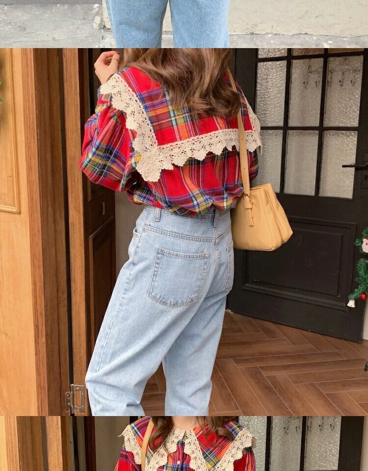格子柄シャツ スプリングカラーレースブラウス 大人ガーリー スウィート キュート カジュアル 春物 ステッチ 萌量不足17046771390