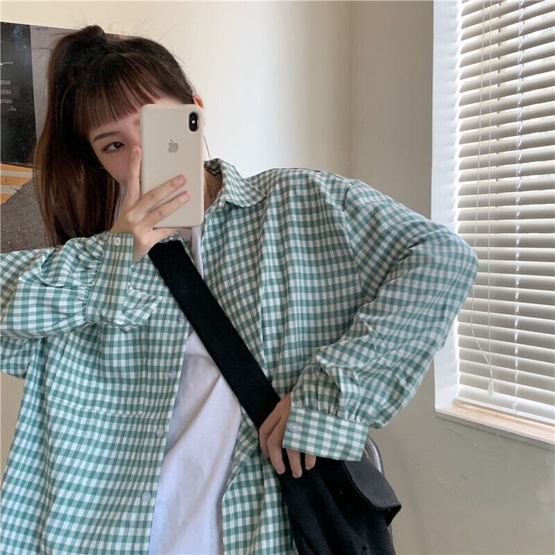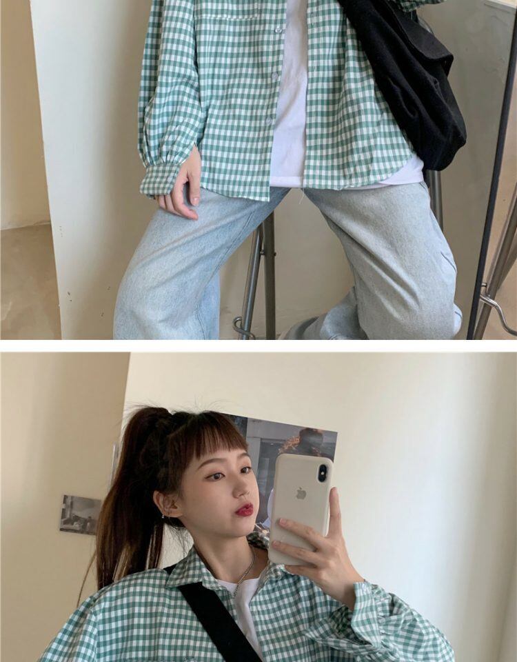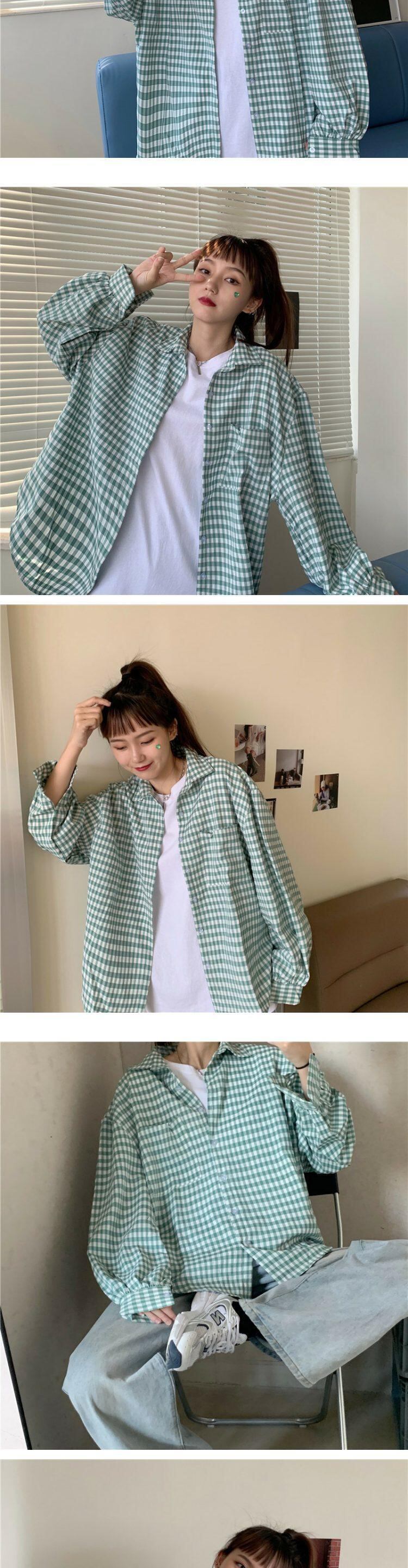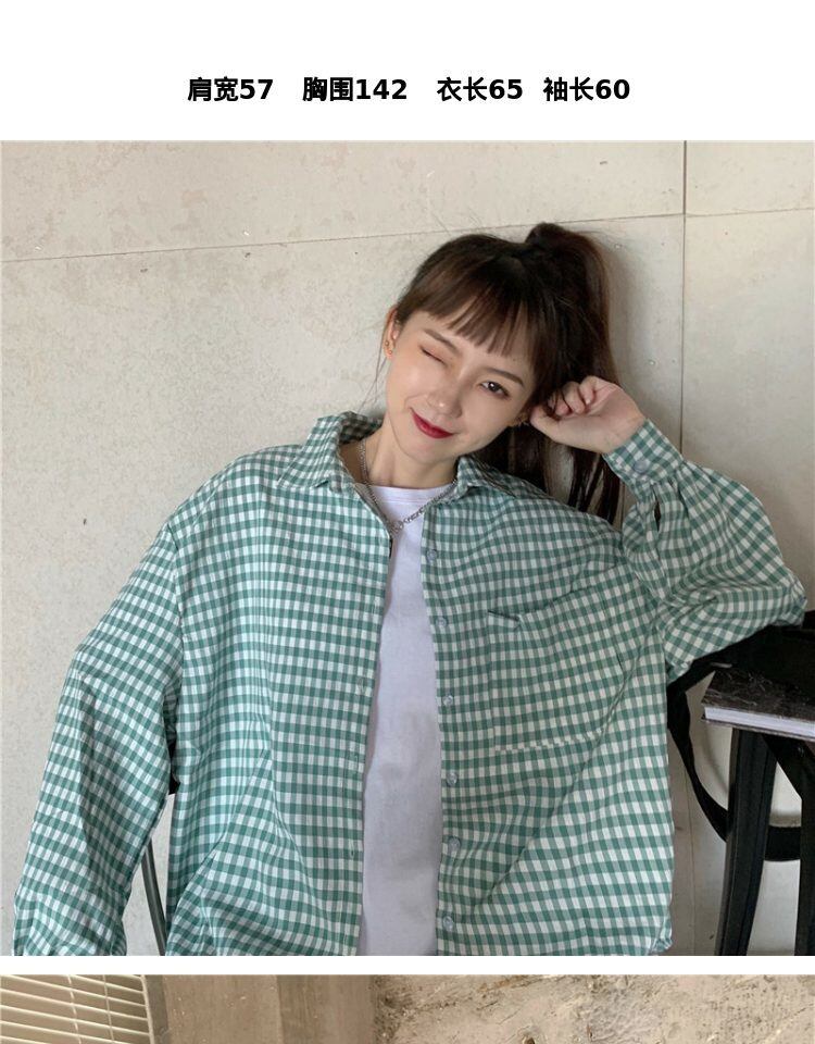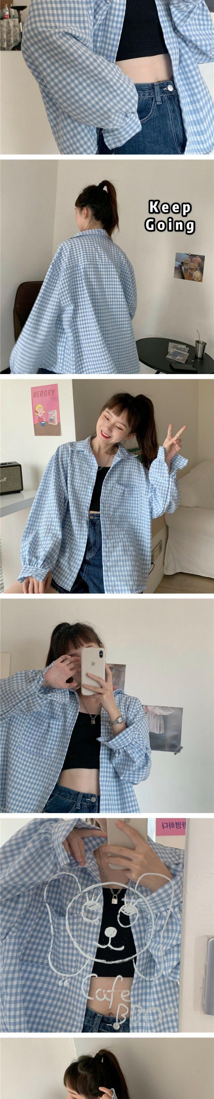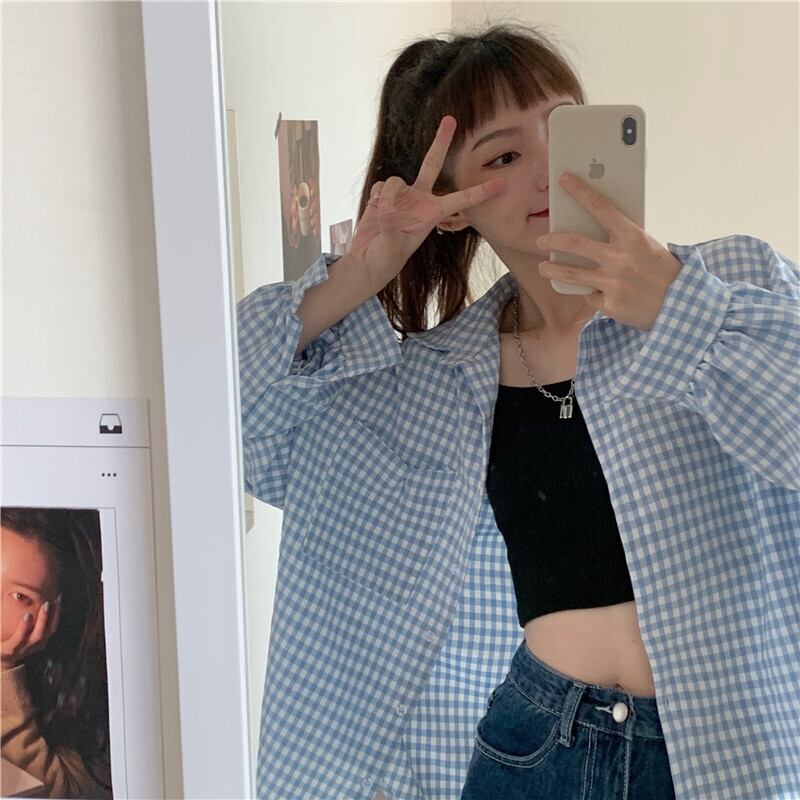 ブルー格子柄シャツ スプリングルーズ薄手ブラウス ロング 春物 萌量不足34316579037