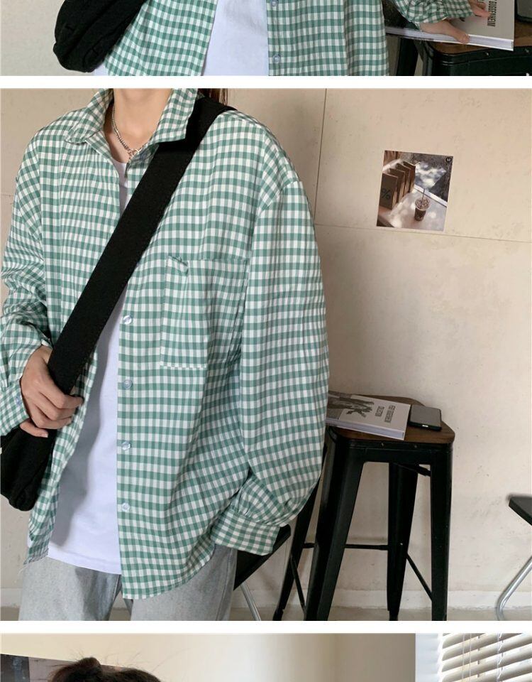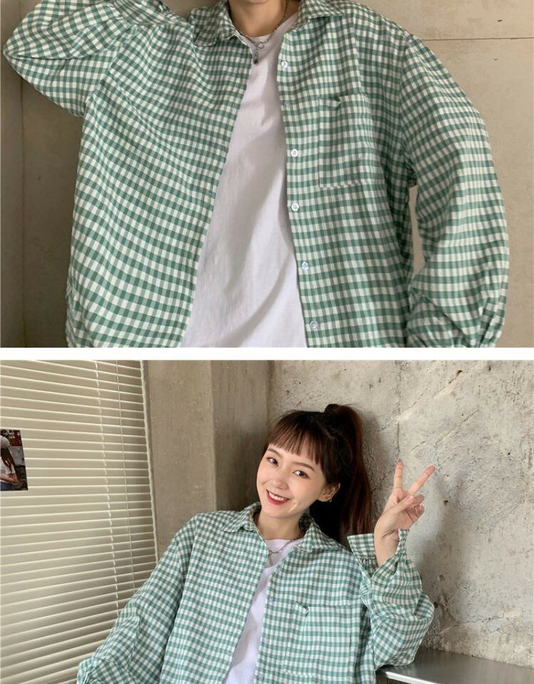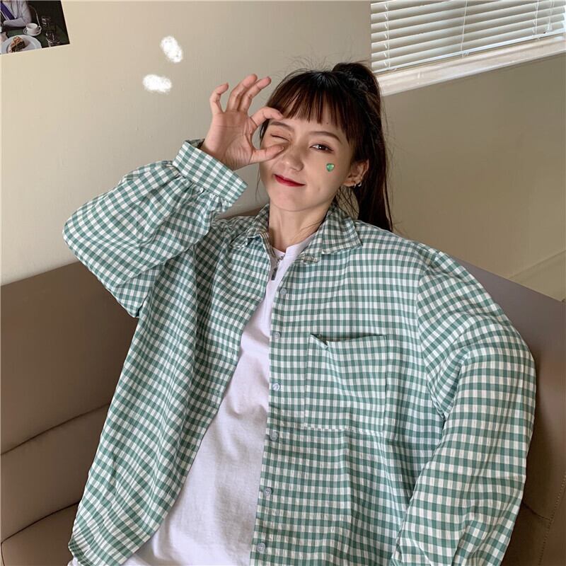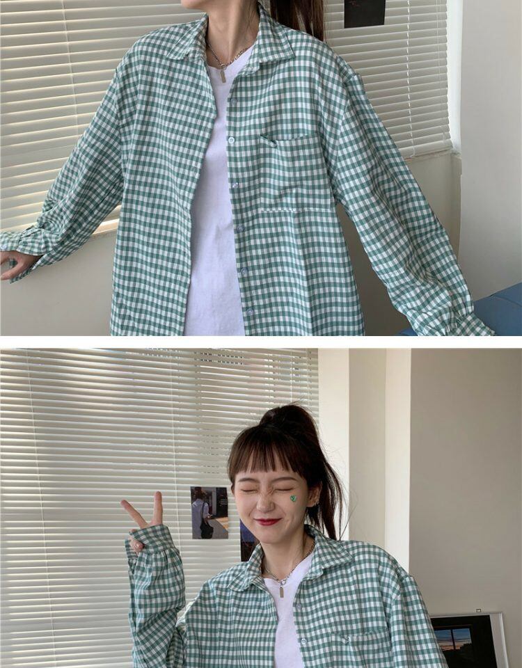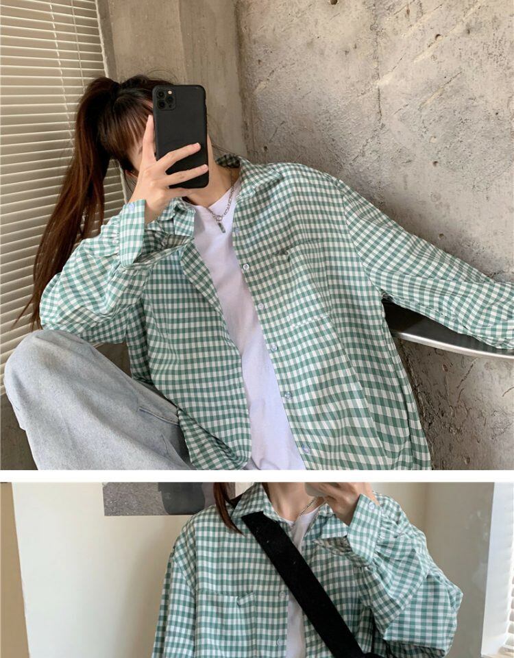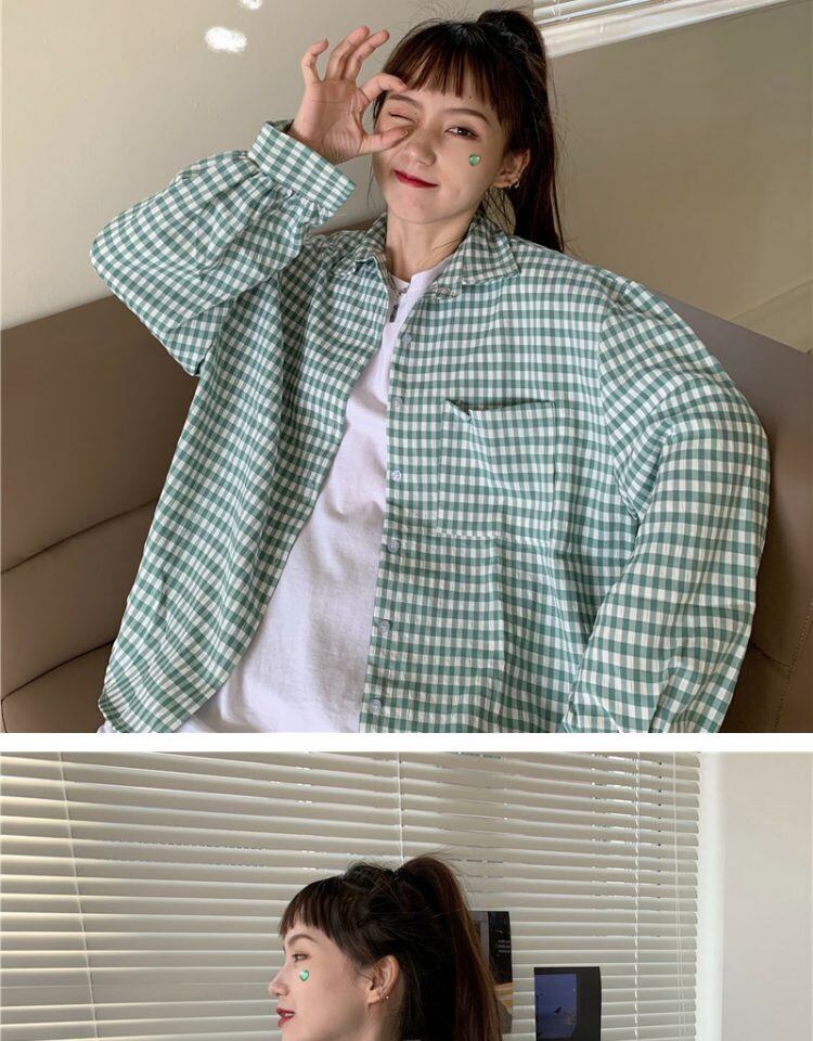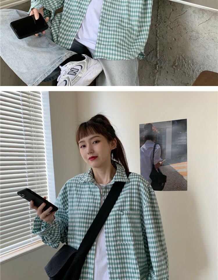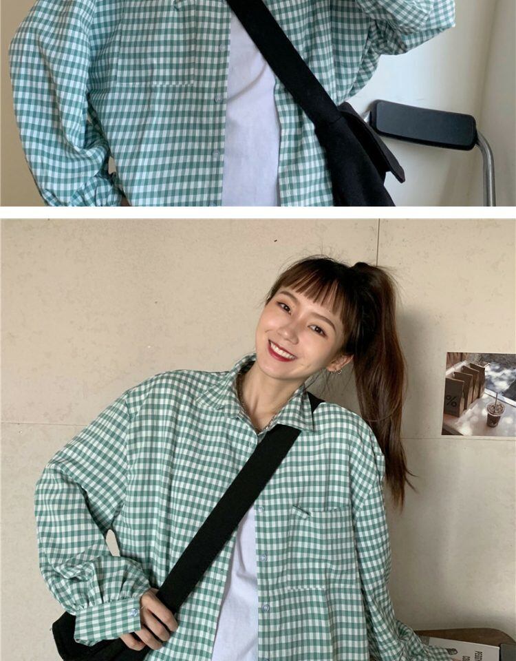 ブルー格子柄シャツ スプリングルーズ薄手ブラウス ロング 春物 萌量不足34316579037