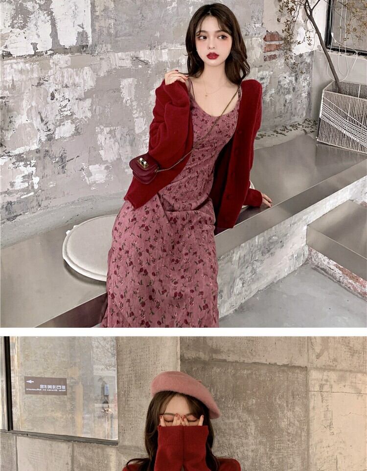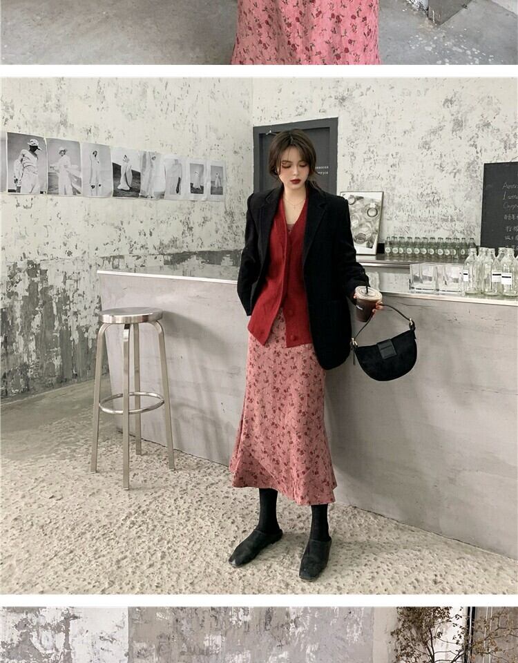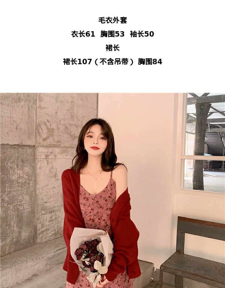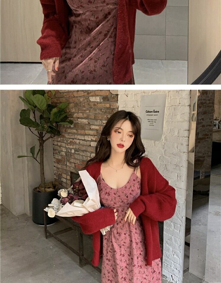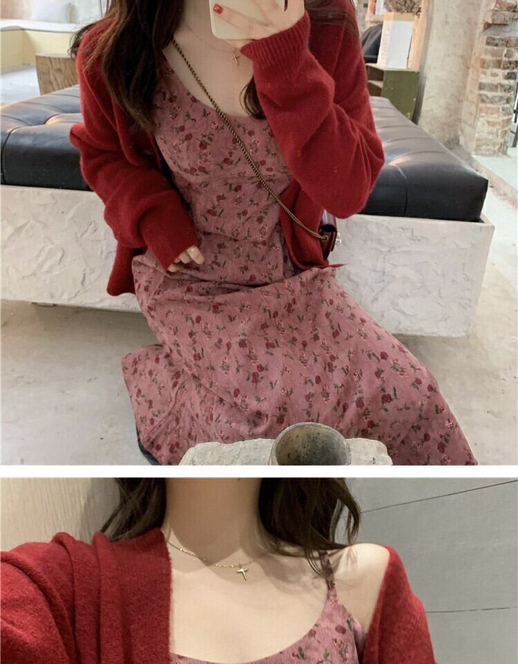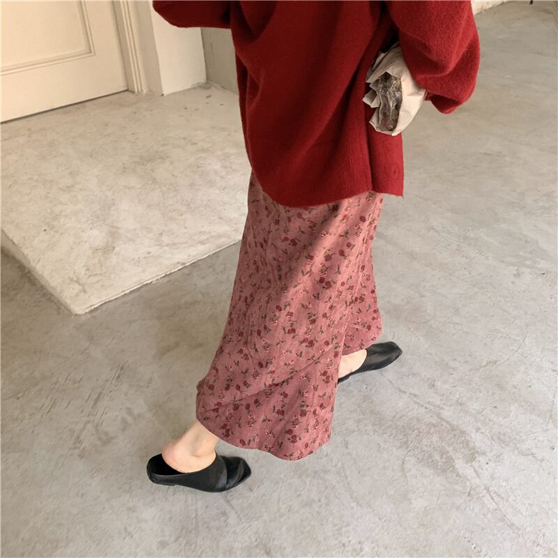 スタンダードレッドフローラルドレス スプリングウェストスカート レトロ 春物 花柄 萌量不足30899812656