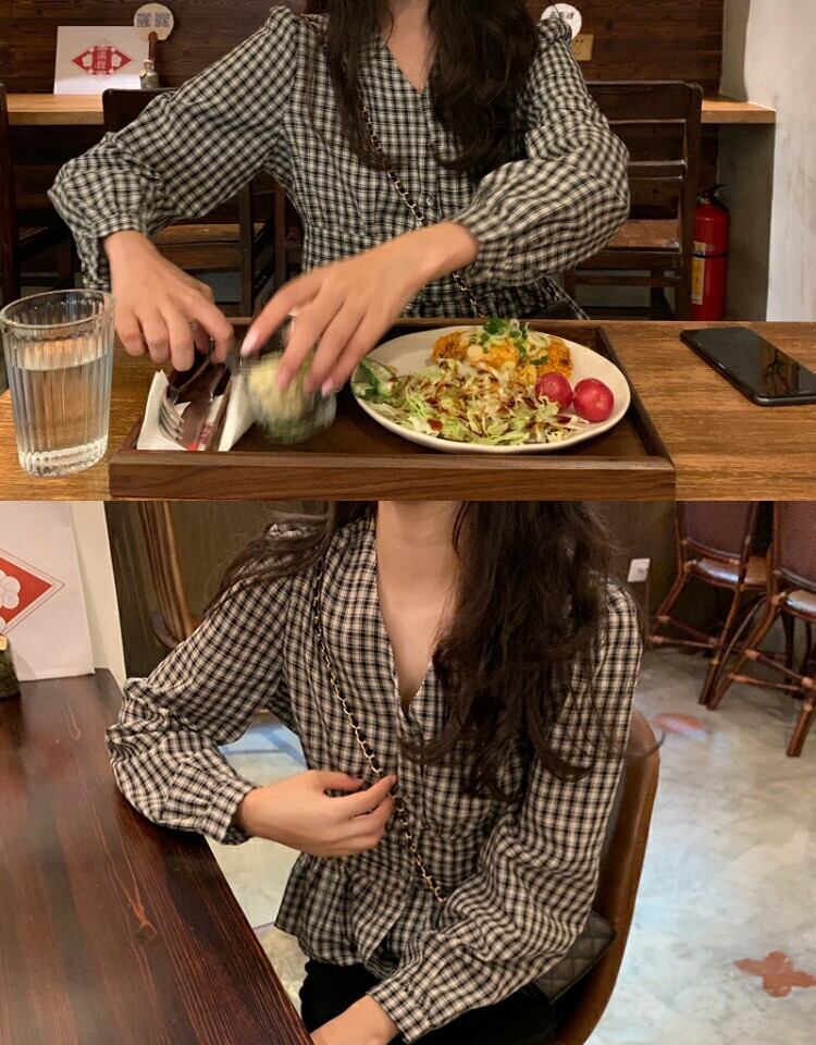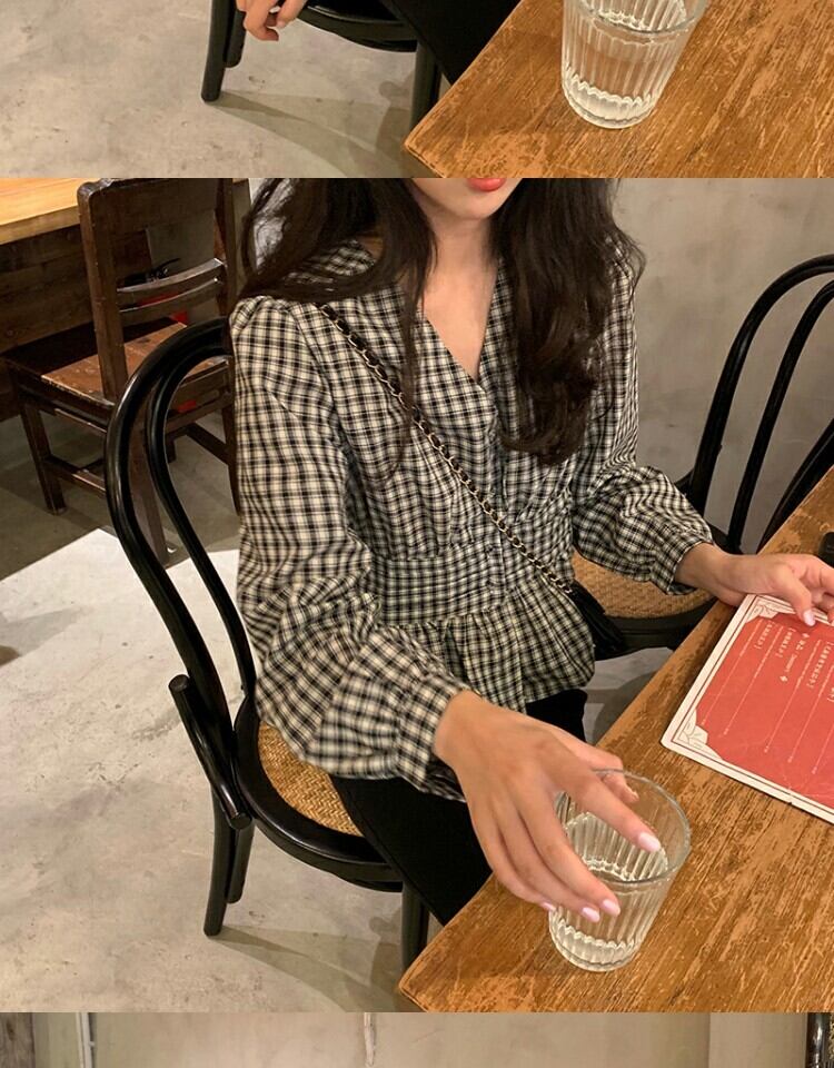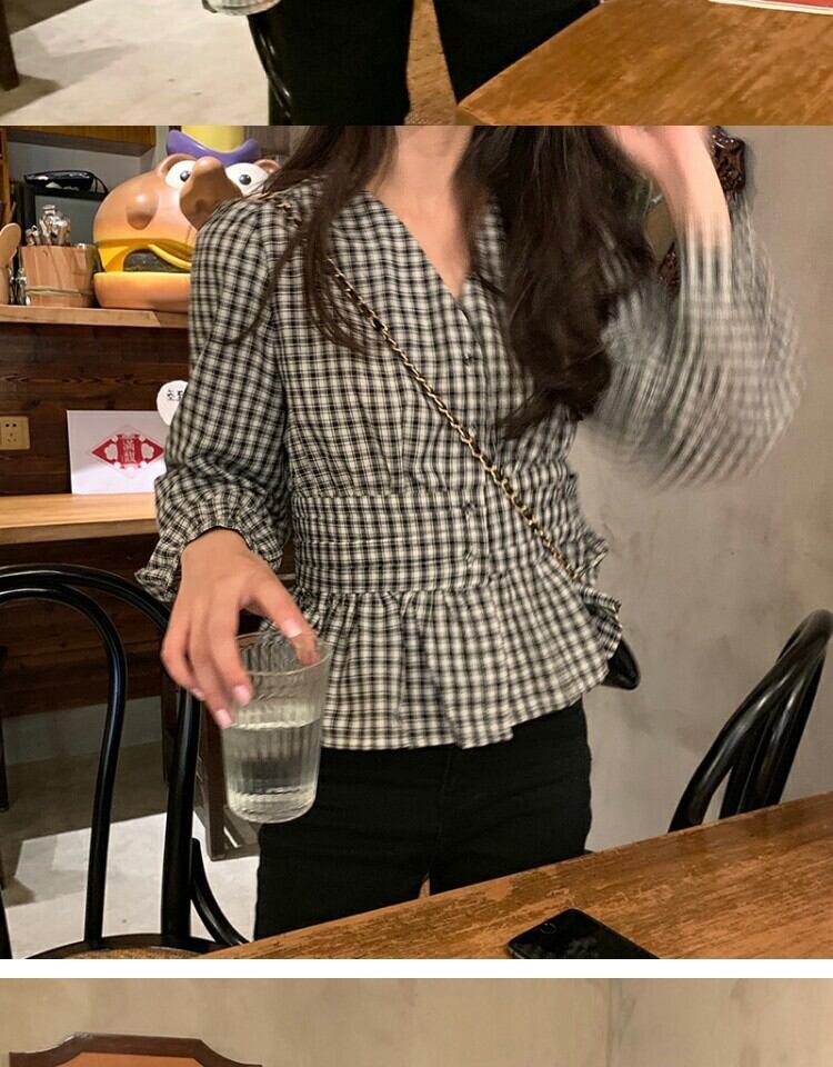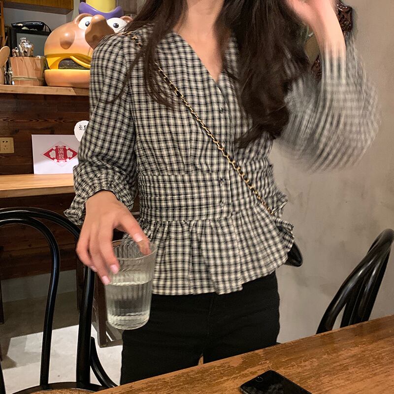 Vネック格子柄シャツ ウェスト薄手スプリングブラウス 春物 萌量不足85410144929