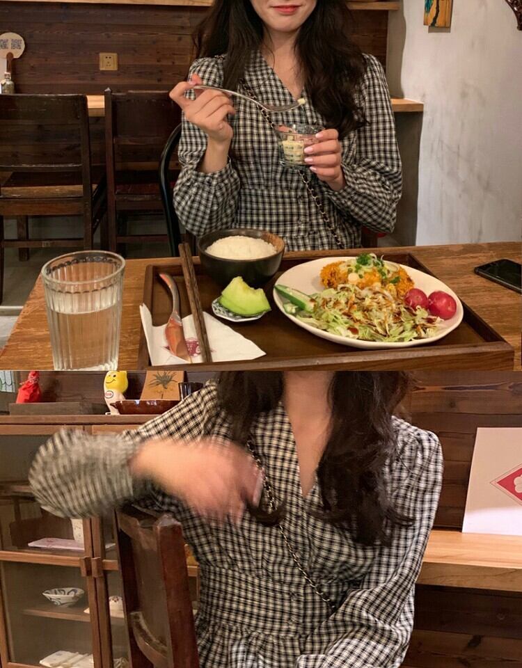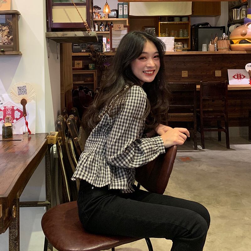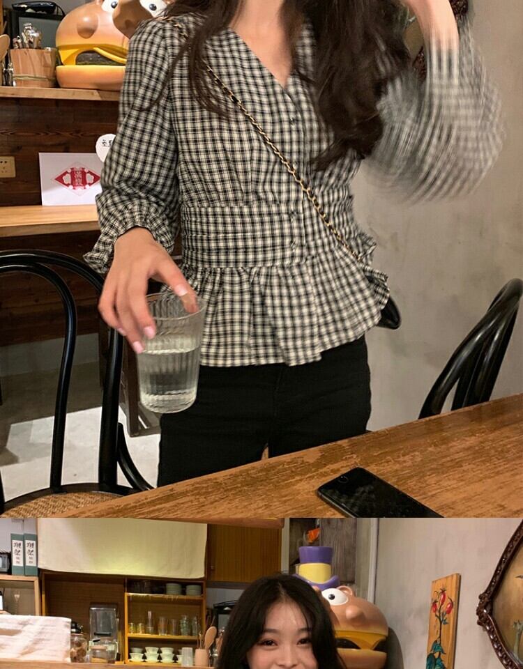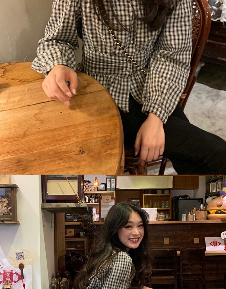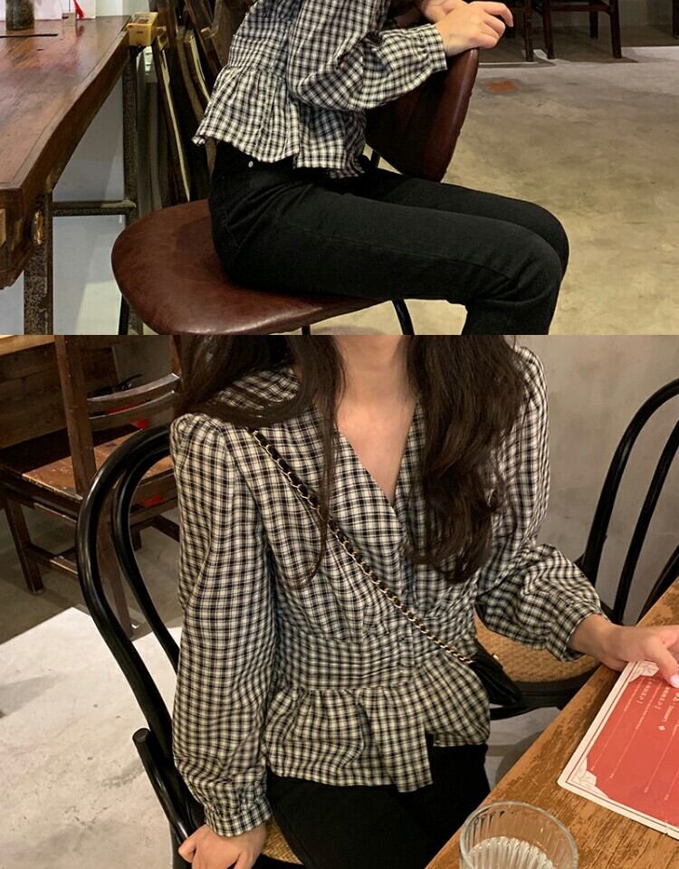 Vネック格子柄シャツ ウェスト薄手スプリングブラウス 春物 萌量不足85410144929
