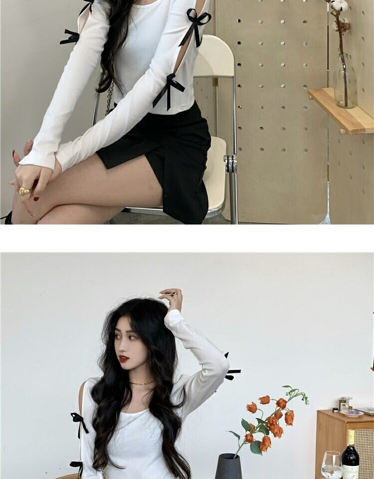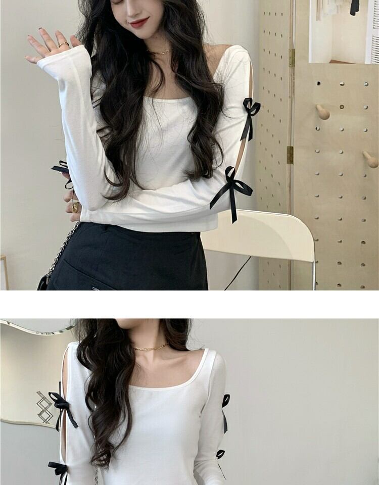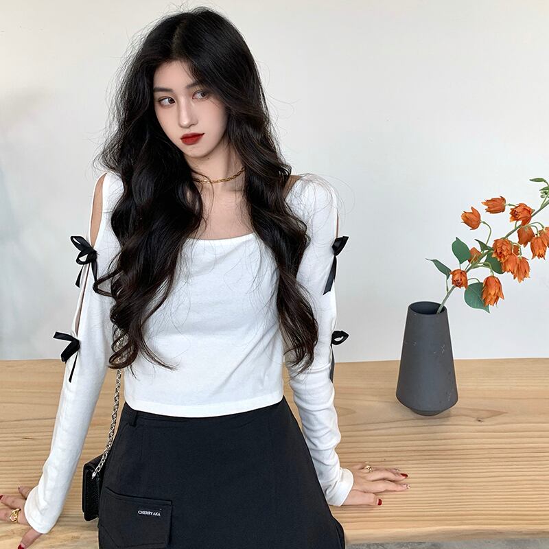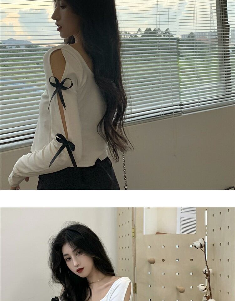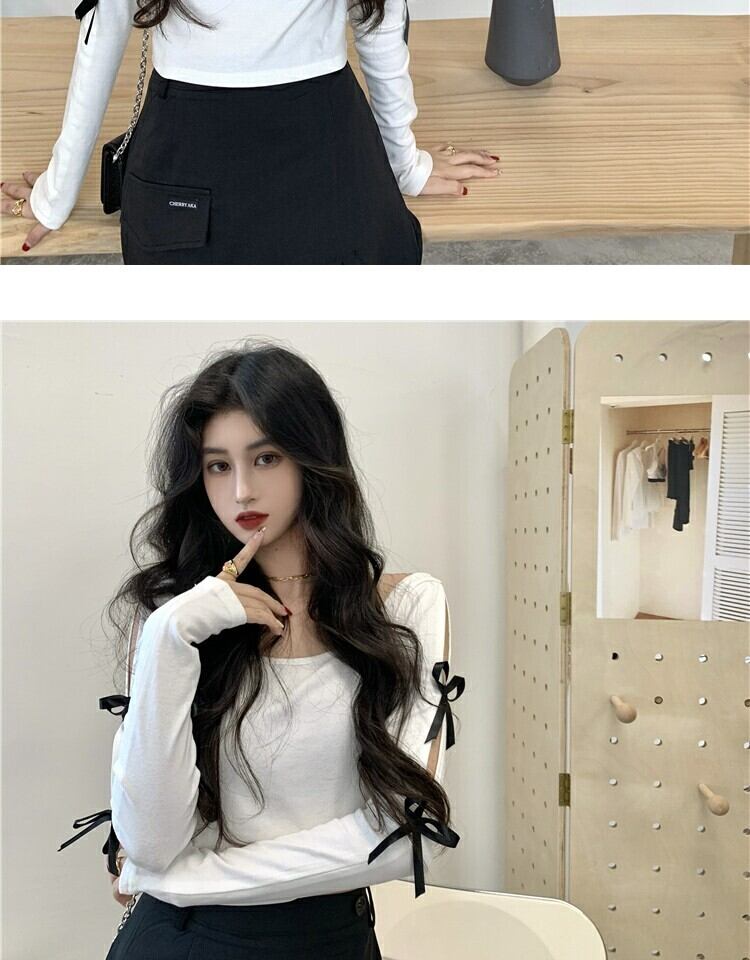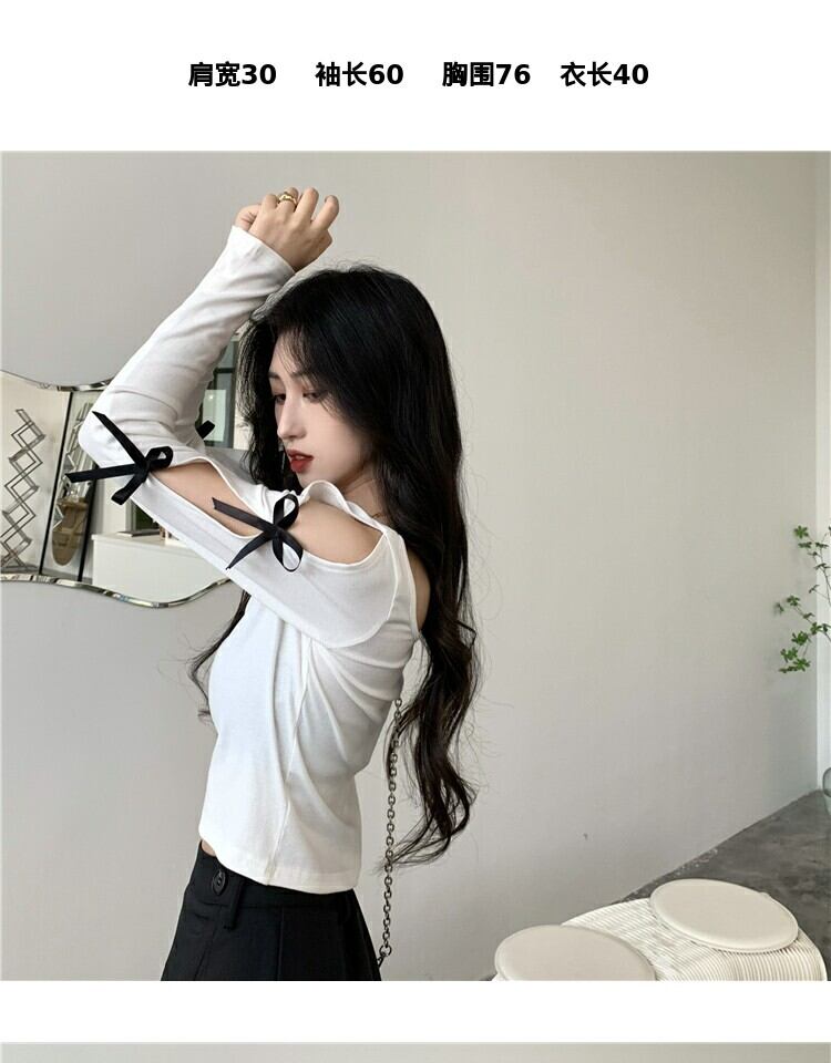 リボンホワイトTシャツ シャツ レディーススプリングトップス ロング 春物 オフショルダー 萌量不足30140785125
