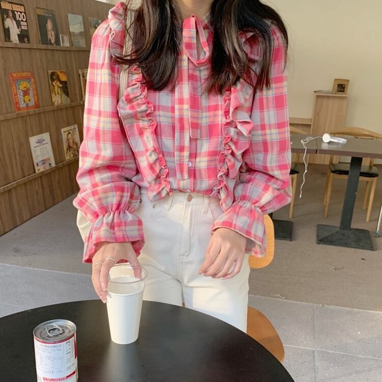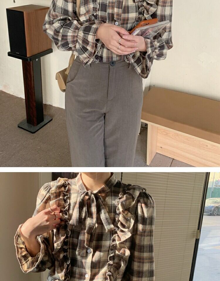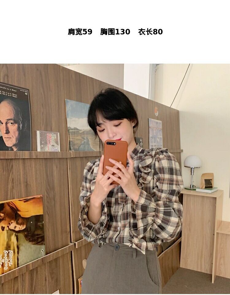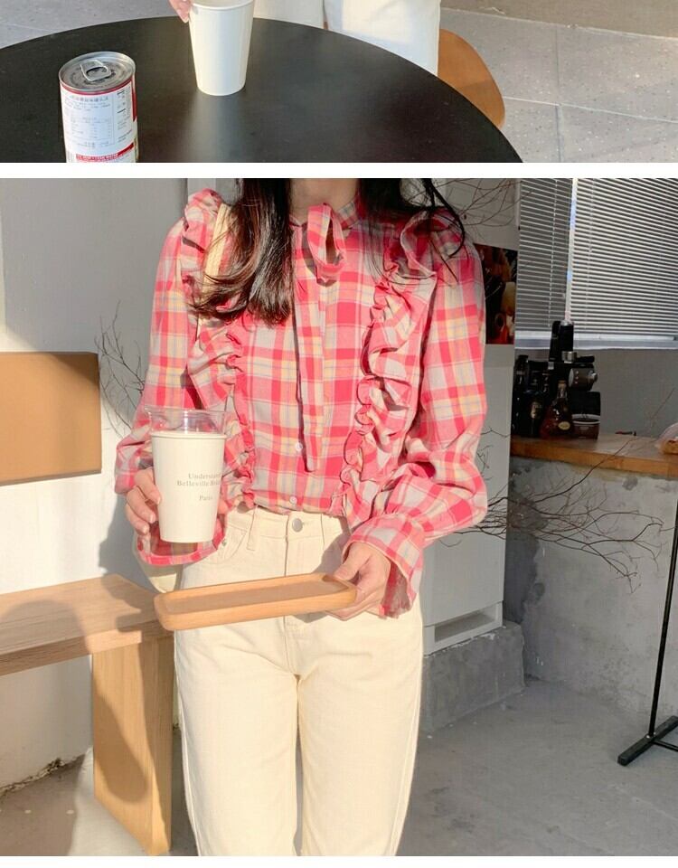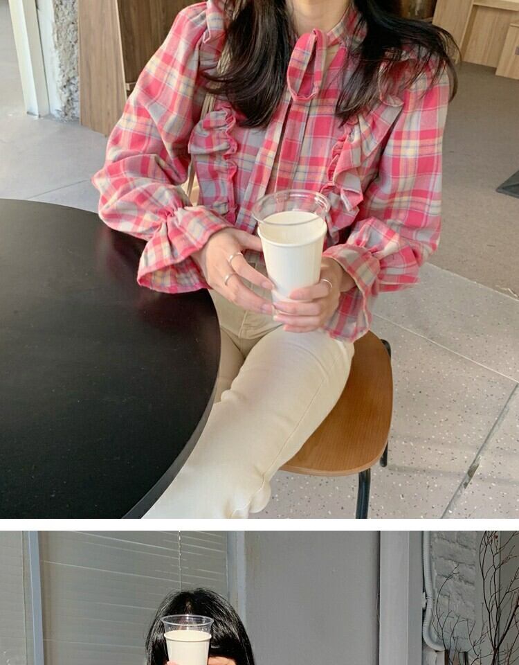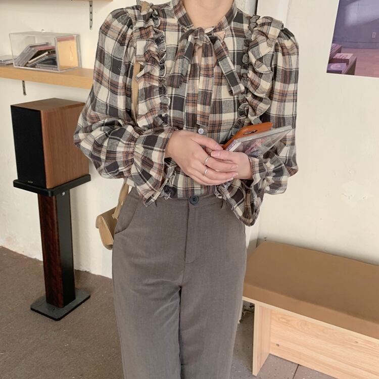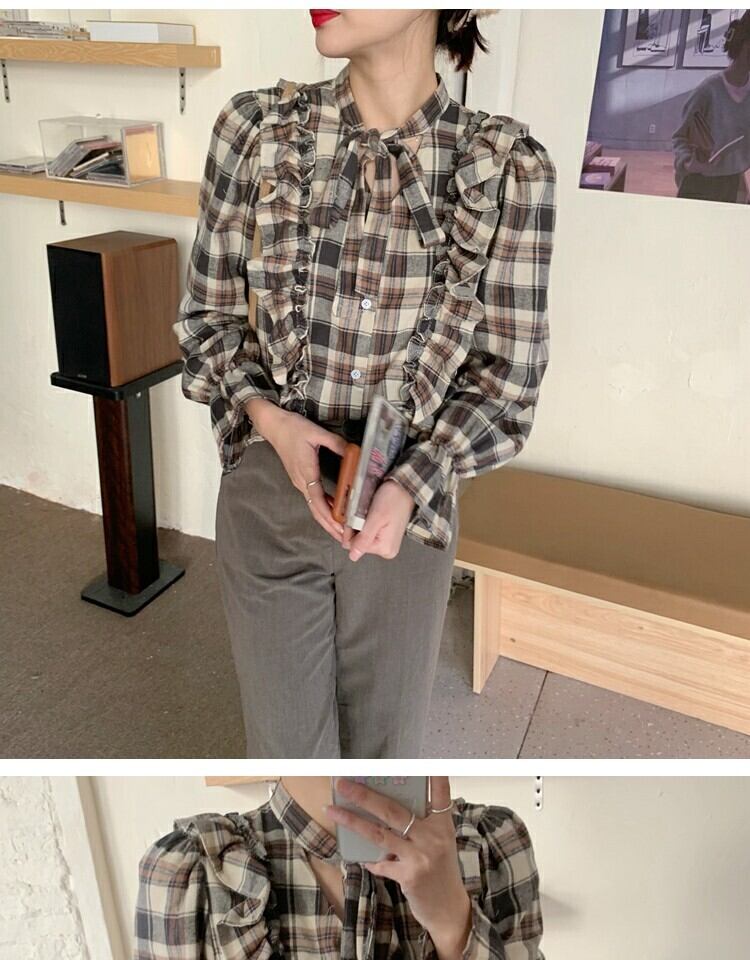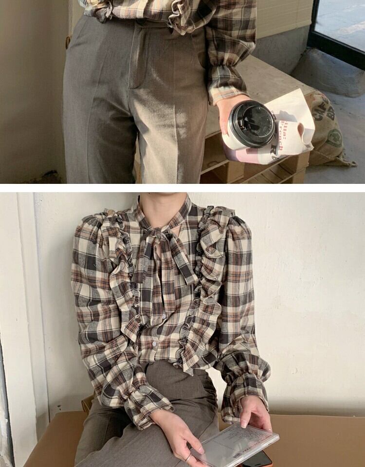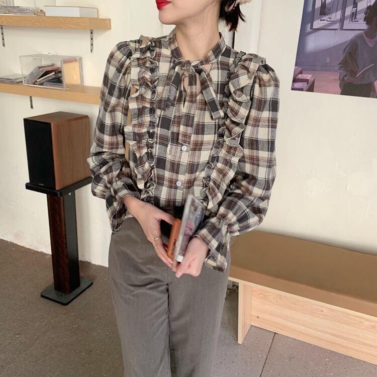 シャツ スプリング格子柄スタンダードスリムトップス レトロ 大人ガーリー スウィート キュート カジュアル 春物 萌量不足18262512552