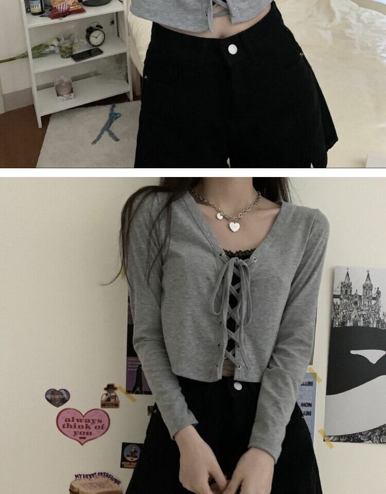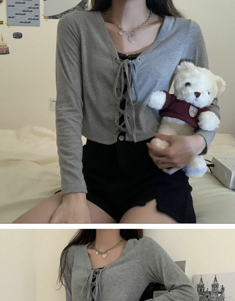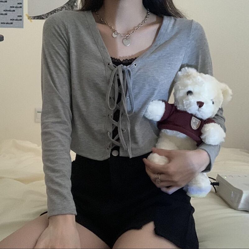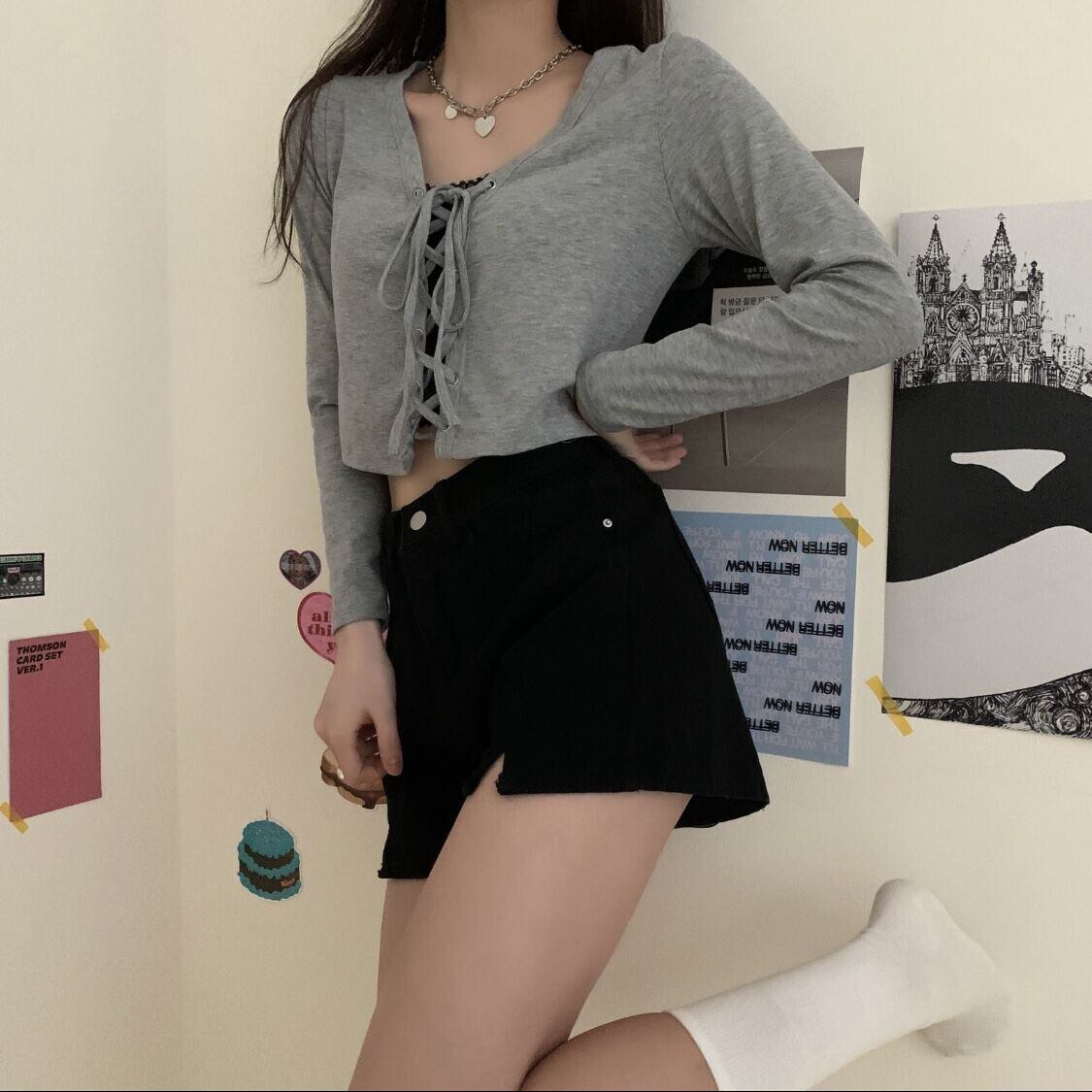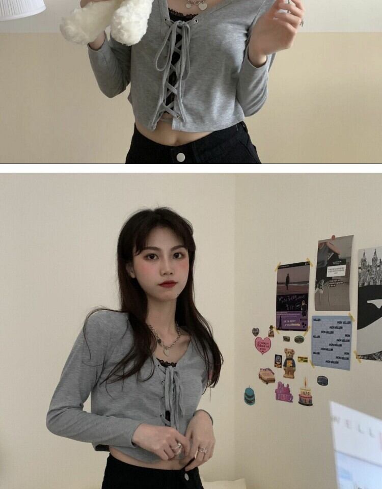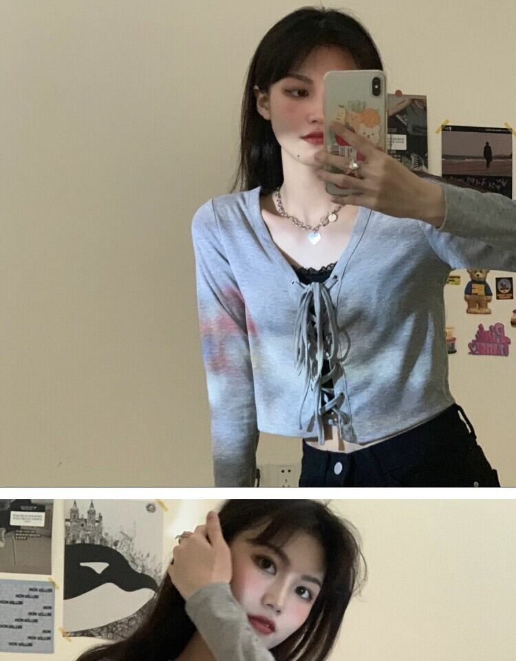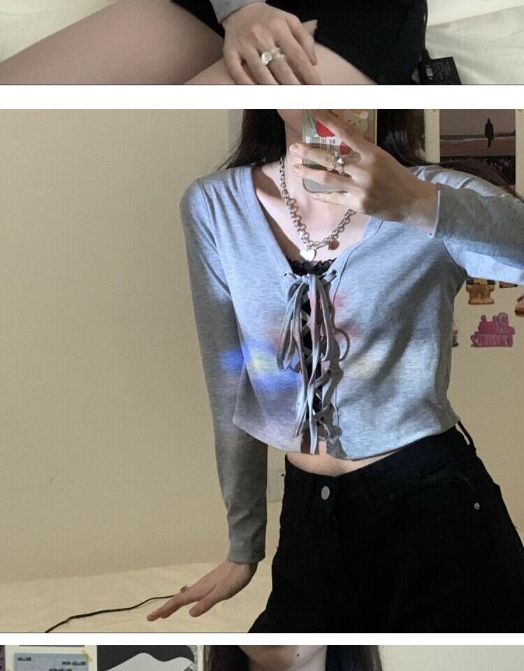 ソリッド カラーシャツ スプリングスリムフィットTシャツ スタイルトップス ロング レース 春物 レースアップ ソリッドカラー 萌量不足66041790066