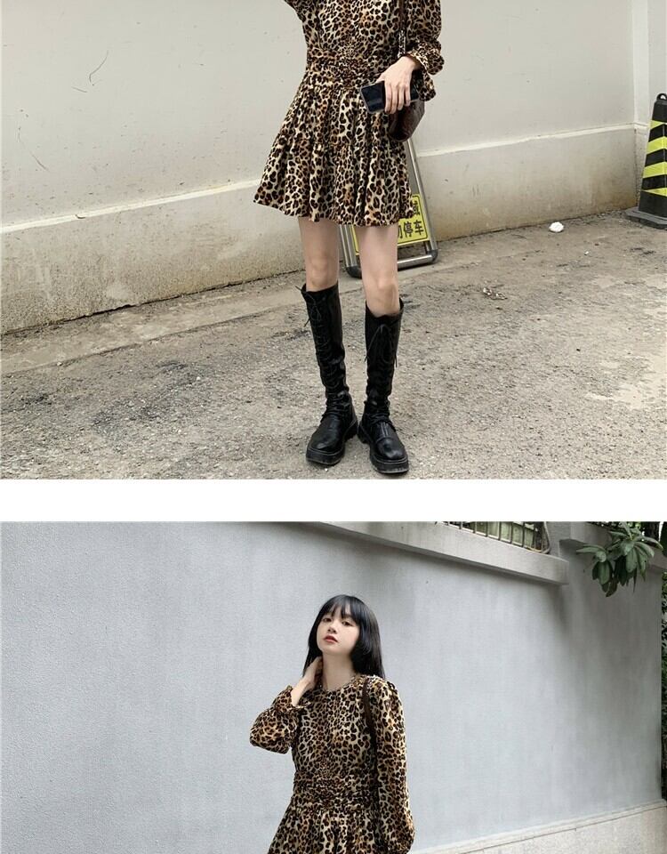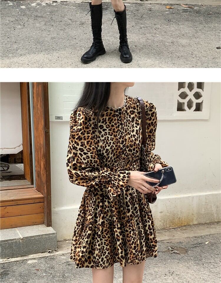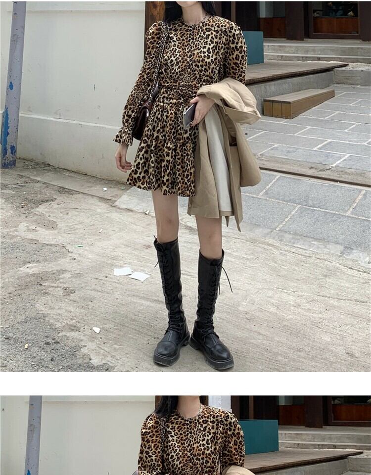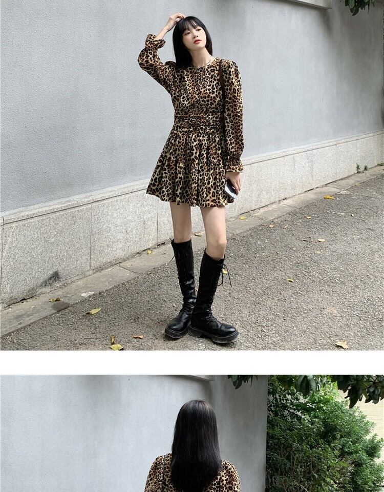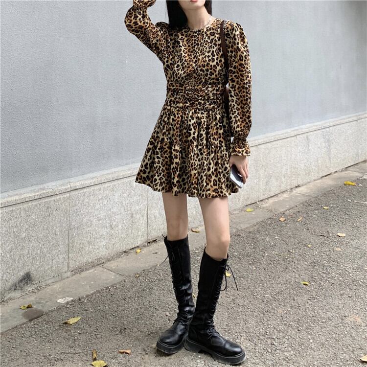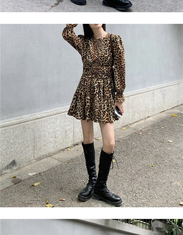 スタンダードスタイルレオパードプリント柄ドレス スプリングスリーブウェストスリムスカート レトロ 春物 萌量不足89632118019