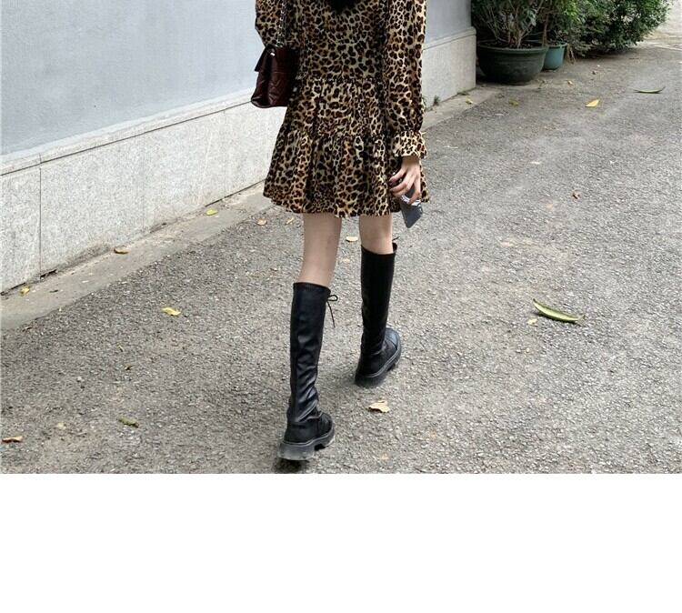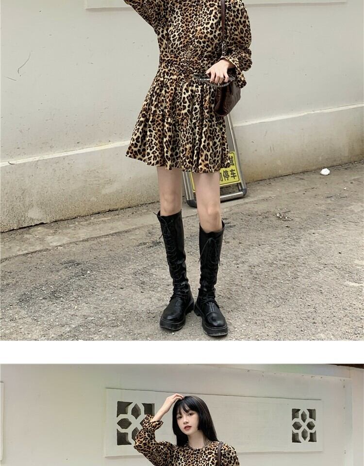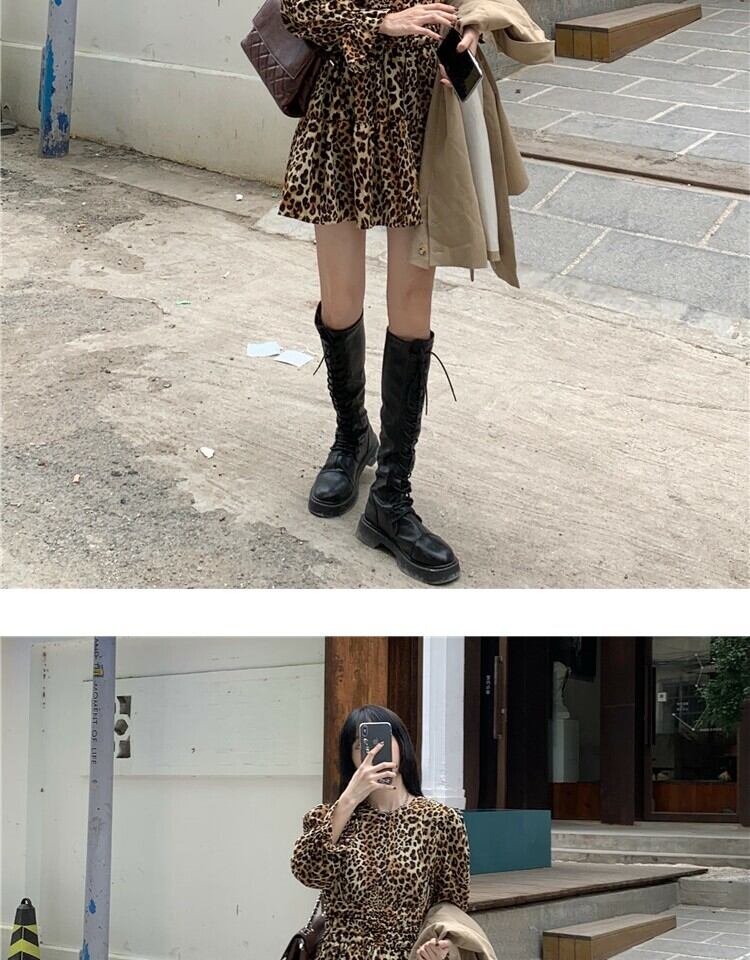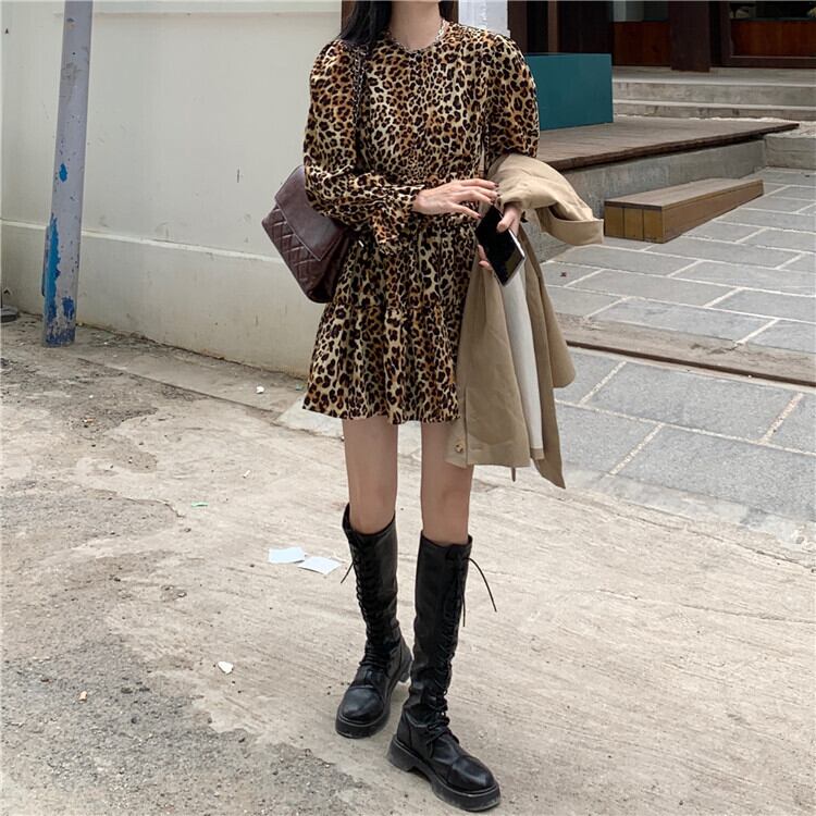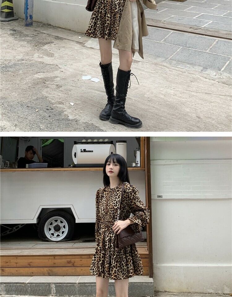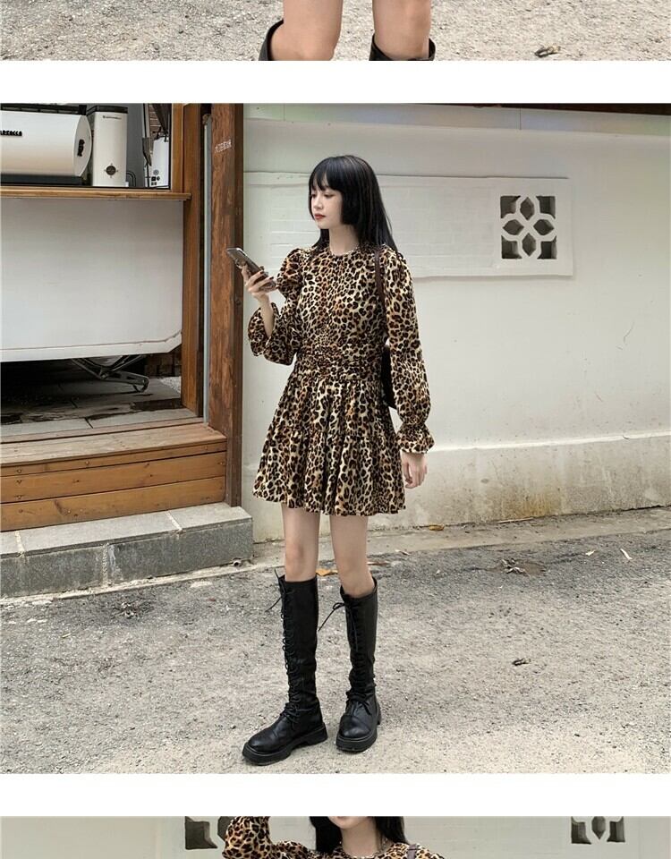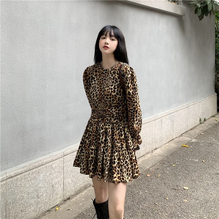 スタンダードスタイルレオパードプリント柄ドレス スプリングスリーブウェストスリムスカート レトロ 春物 萌量不足89632118019