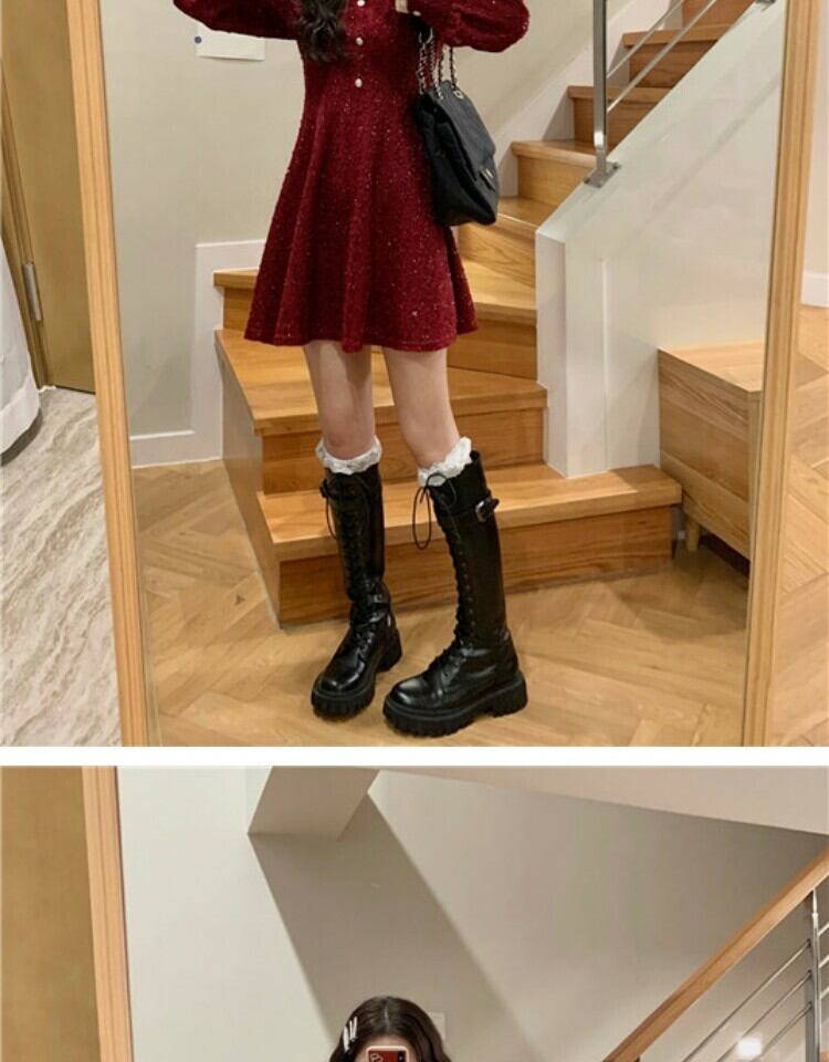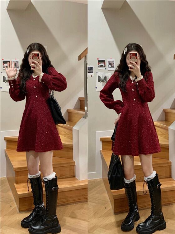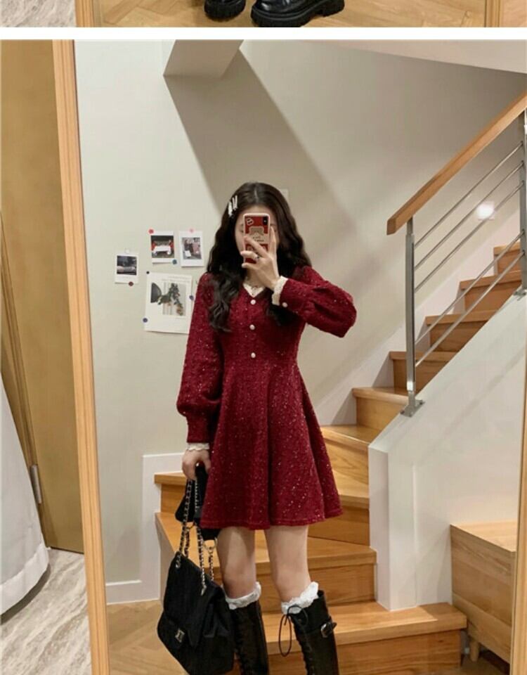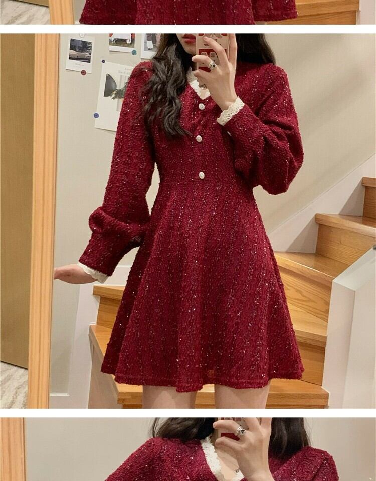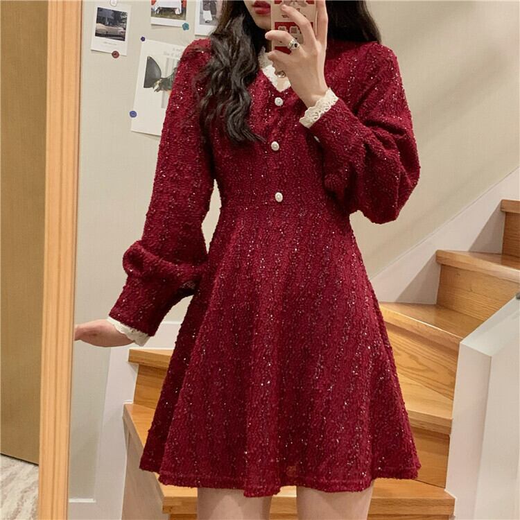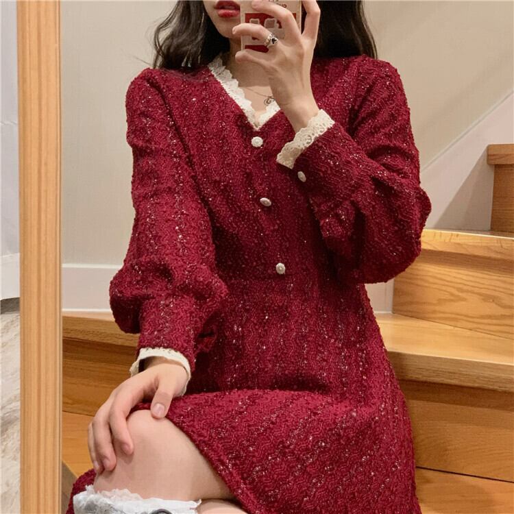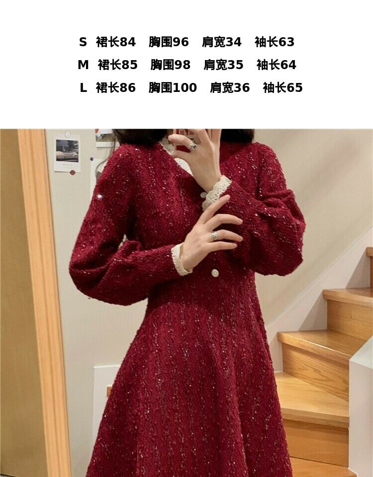 ドレス オータムウィンタースタイルレッドスタンダードレーススプリングスカート レトロ 春物 秋物 冬物 萌量不足34751474725