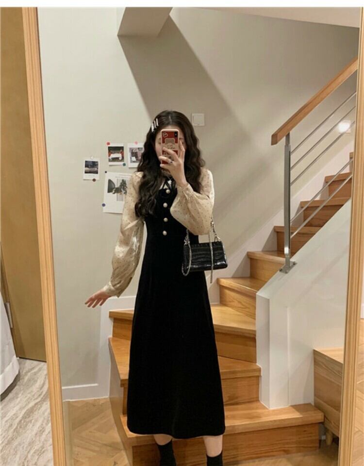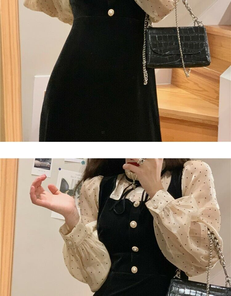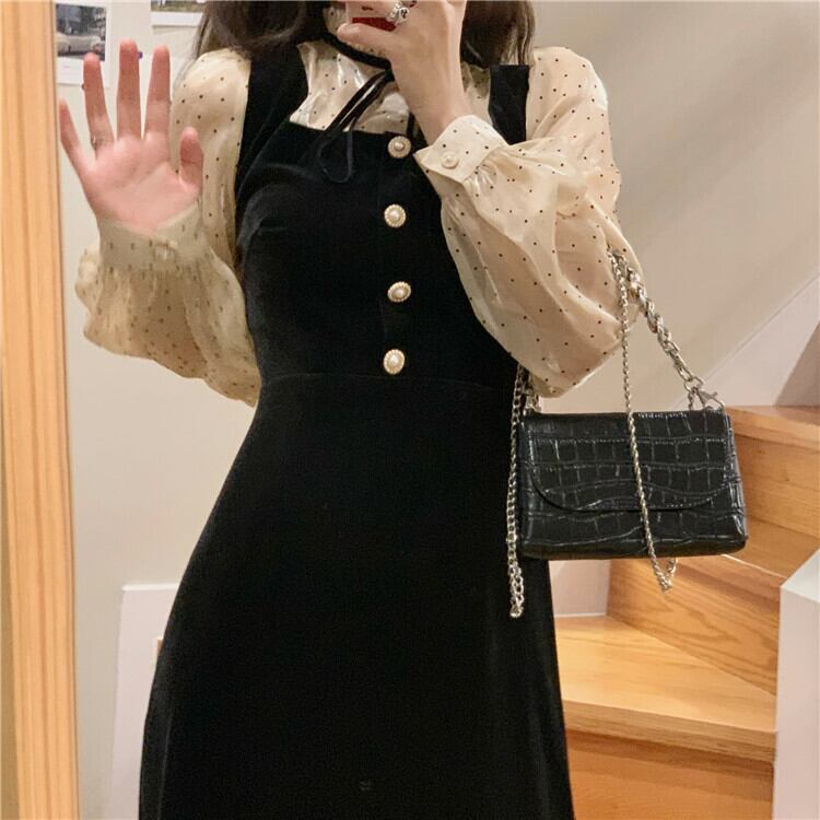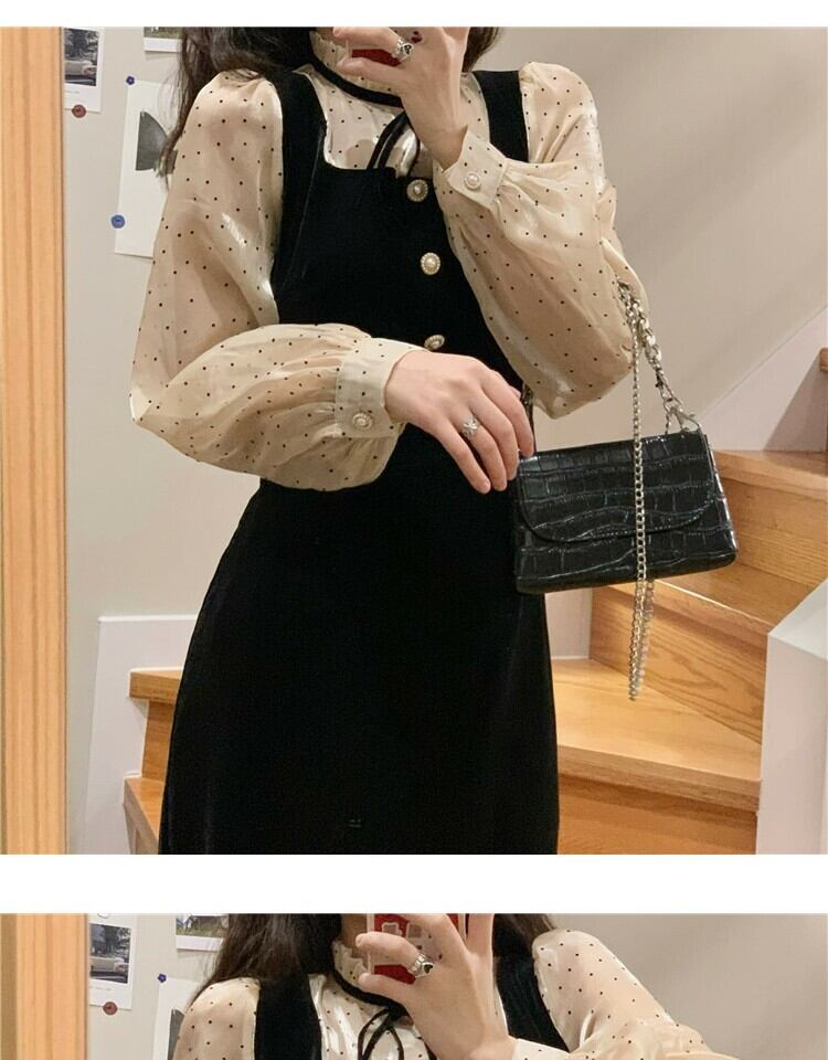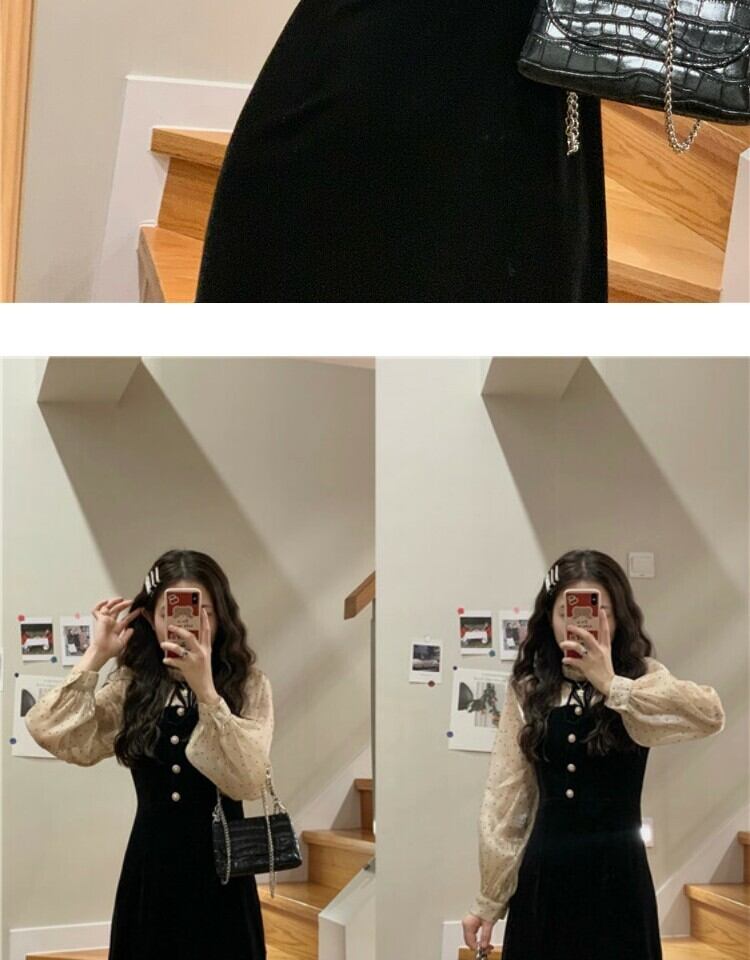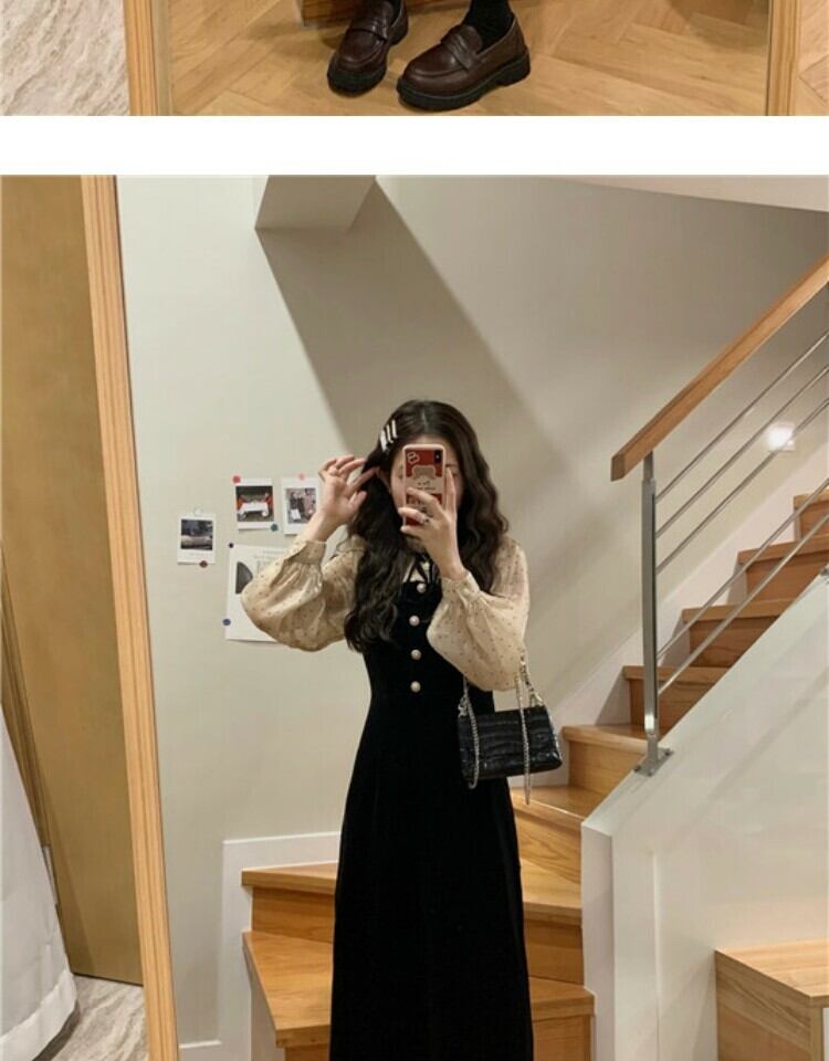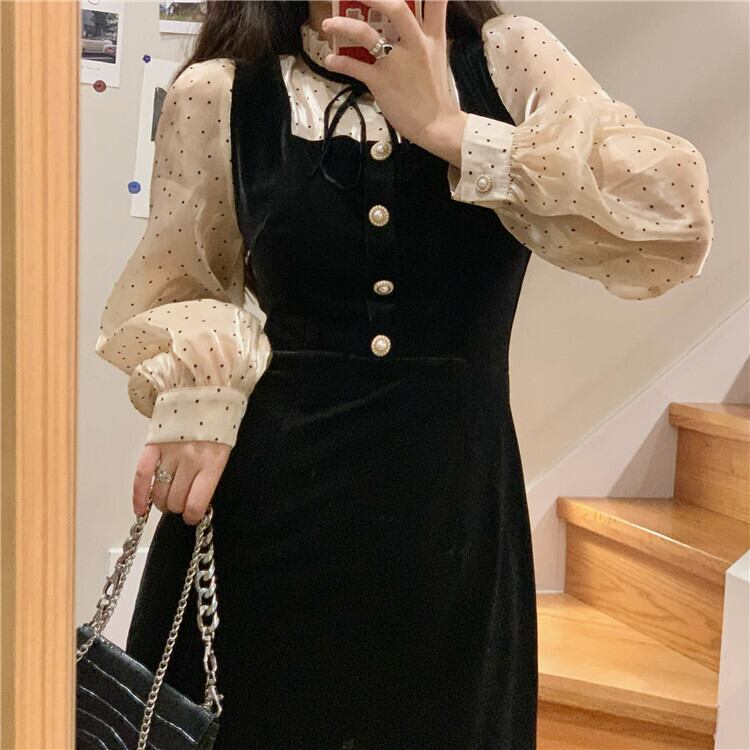 スタンダードスタイルメッシュ水玉スリーブドレス スプリングスカート レトロ 春物 ステッチ 萌量不足54252935213