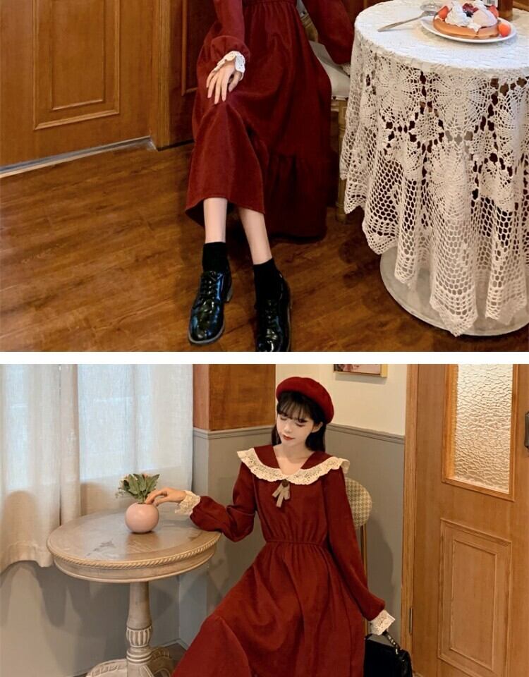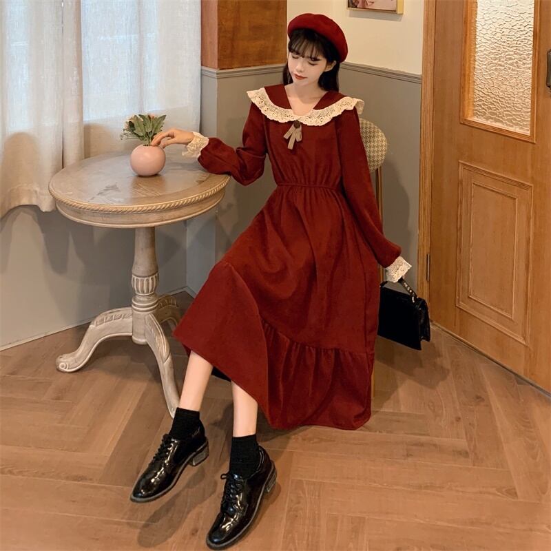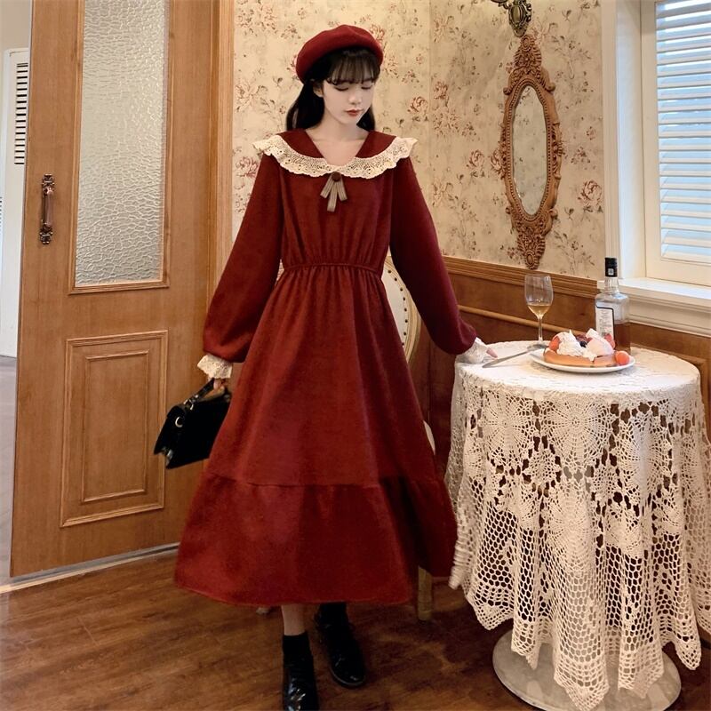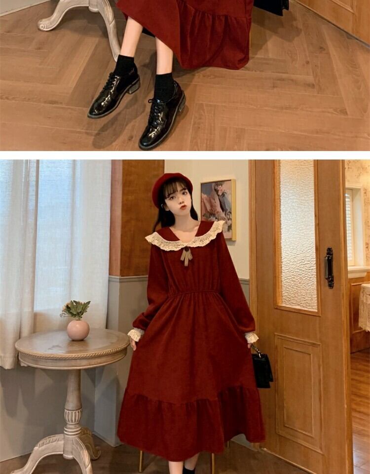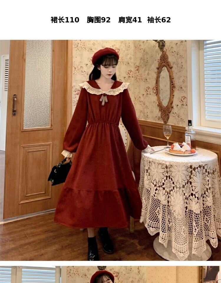 スプリングオータムレッドドレス レーススカート ウェスト薄手 大人ガーリー スウィート キュート カジュアル 春物 秋物 萌量不足47849044670