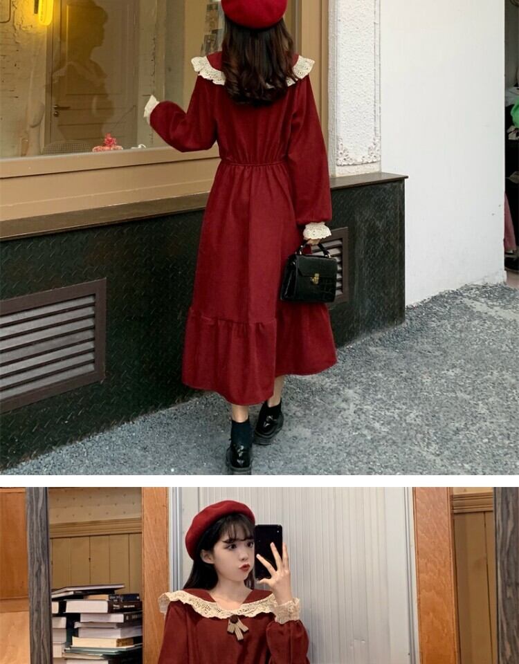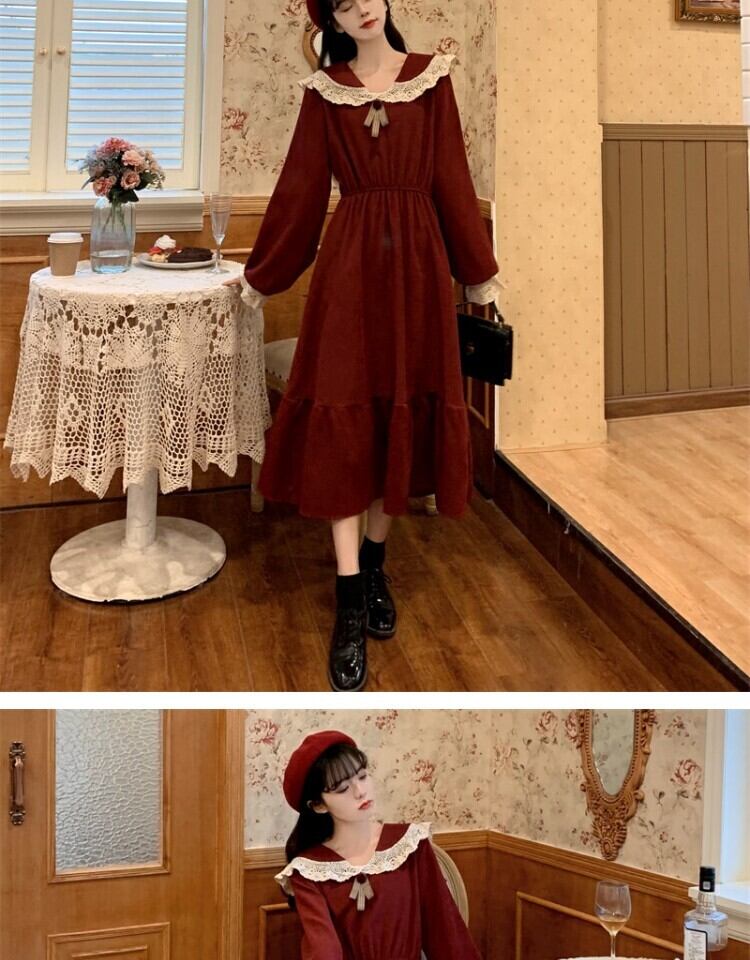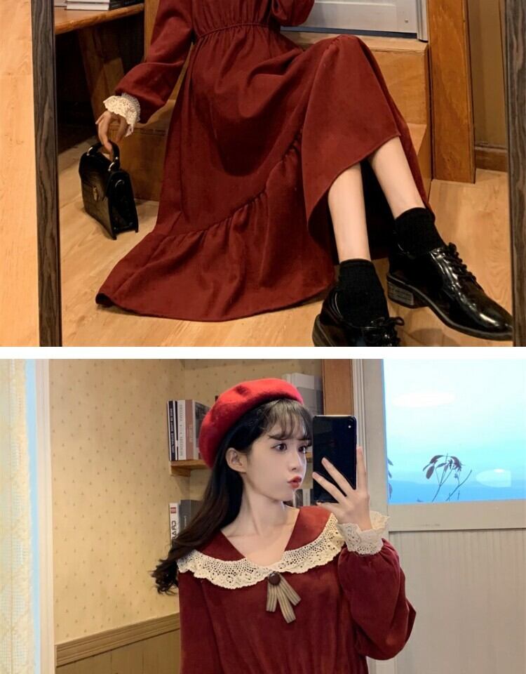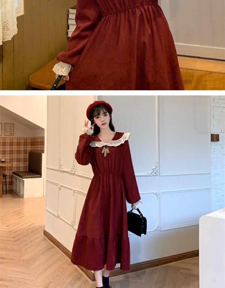 スプリングオータムレッドドレス レーススカート ウェスト薄手 大人ガーリー スウィート キュート カジュアル 春物 秋物 萌量不足47849044670