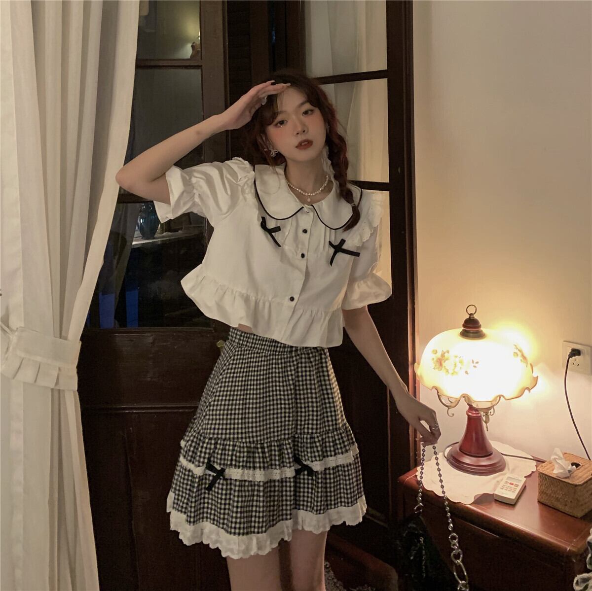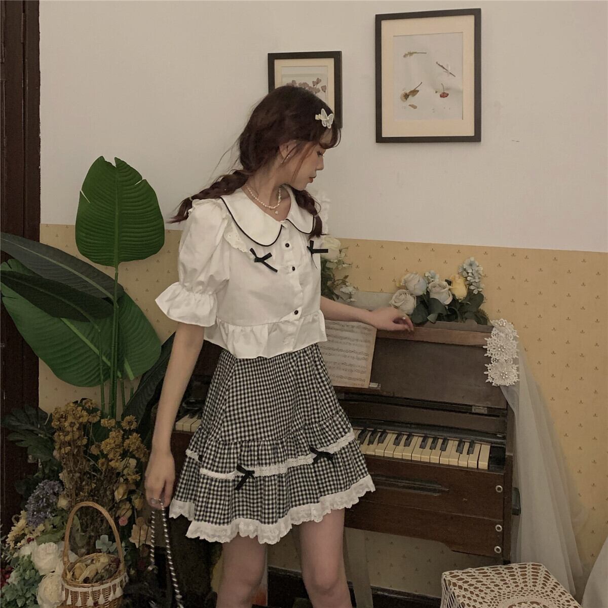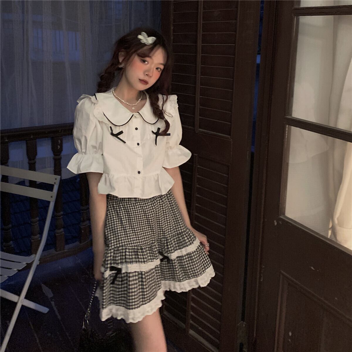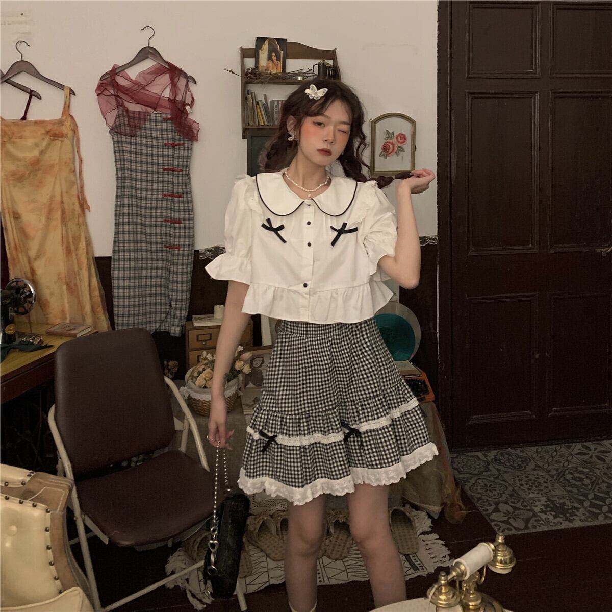 色:シャツ一枚,格子縞のスカートワンピース