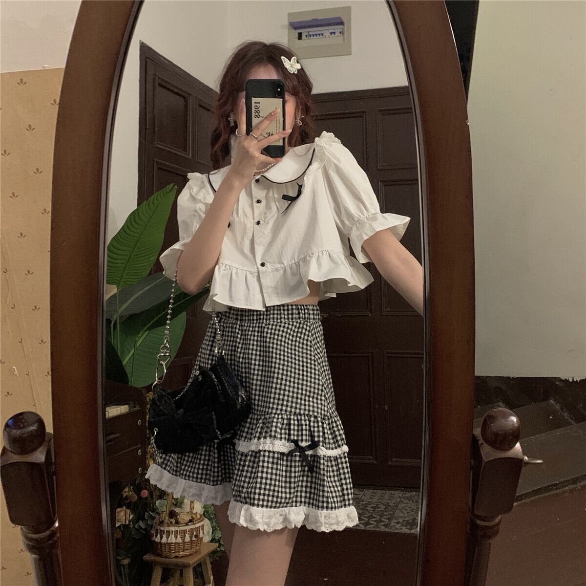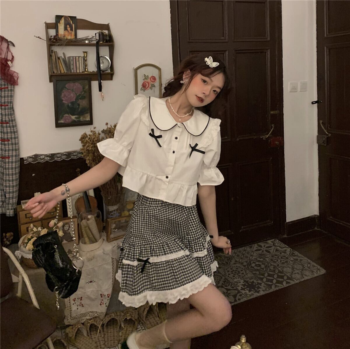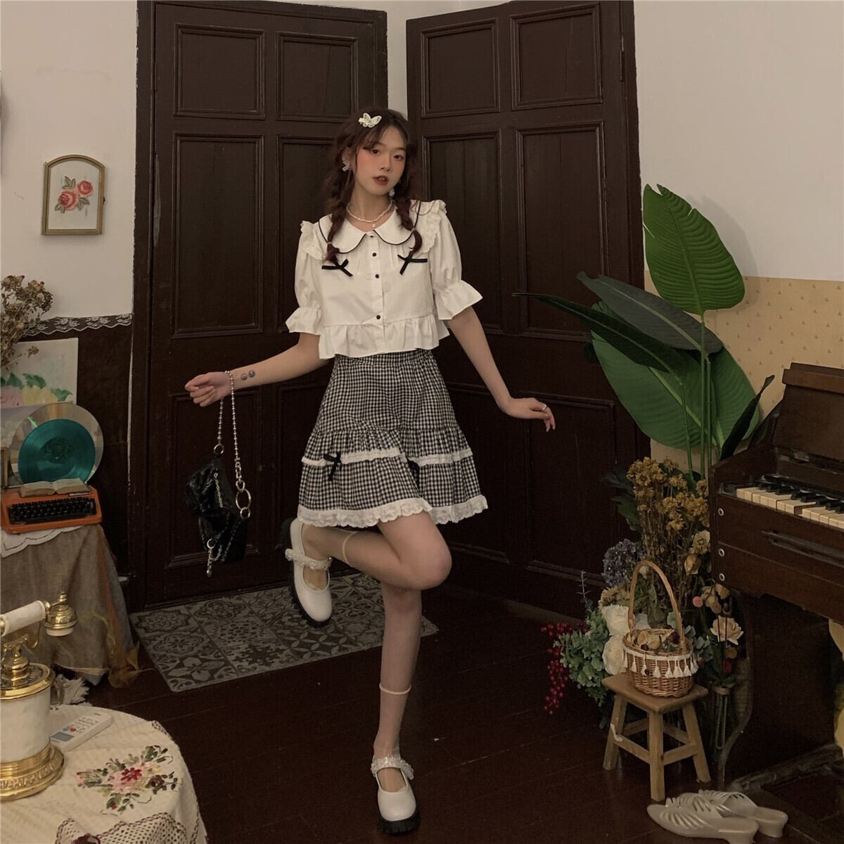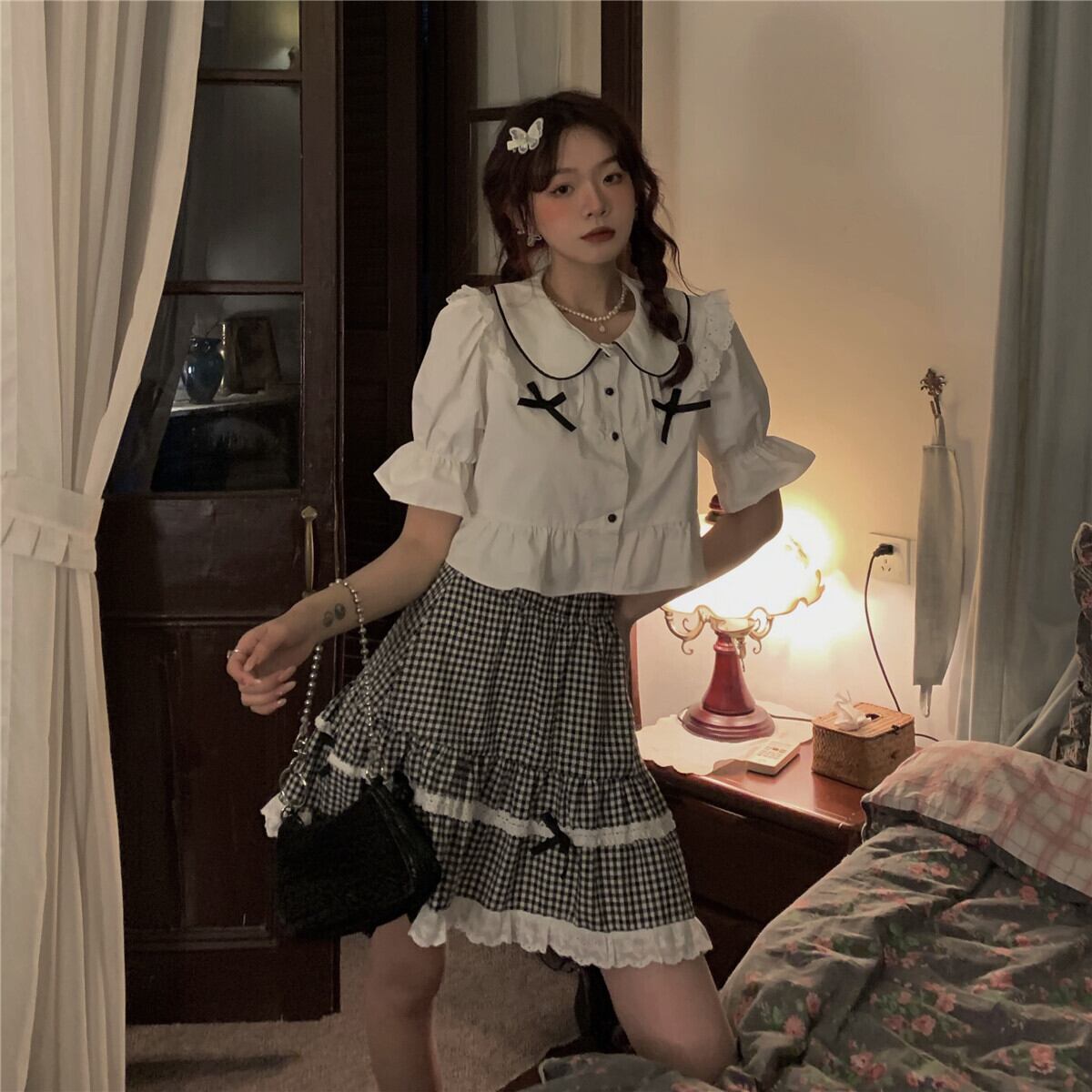 色:シャツ一枚,格子縞のスカートワンピース