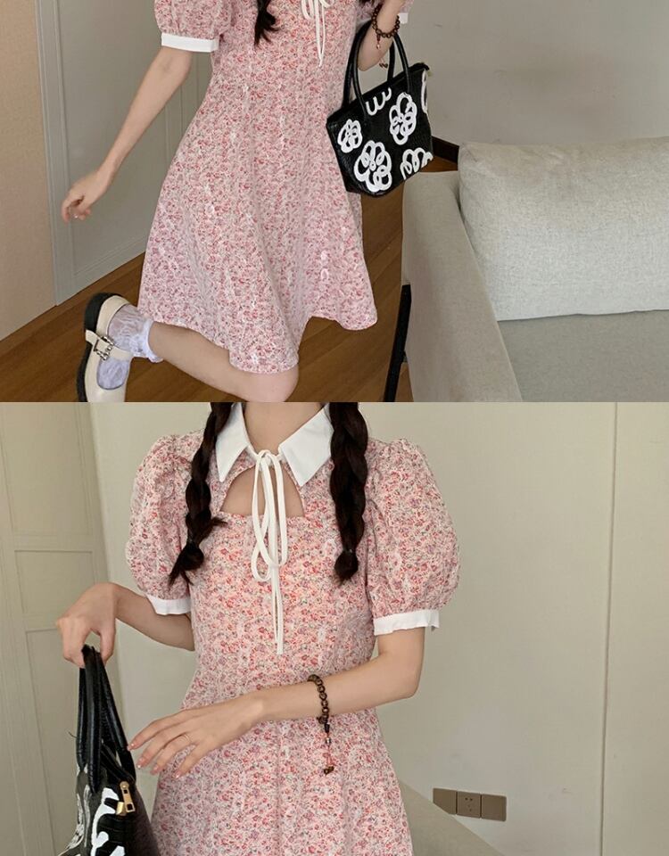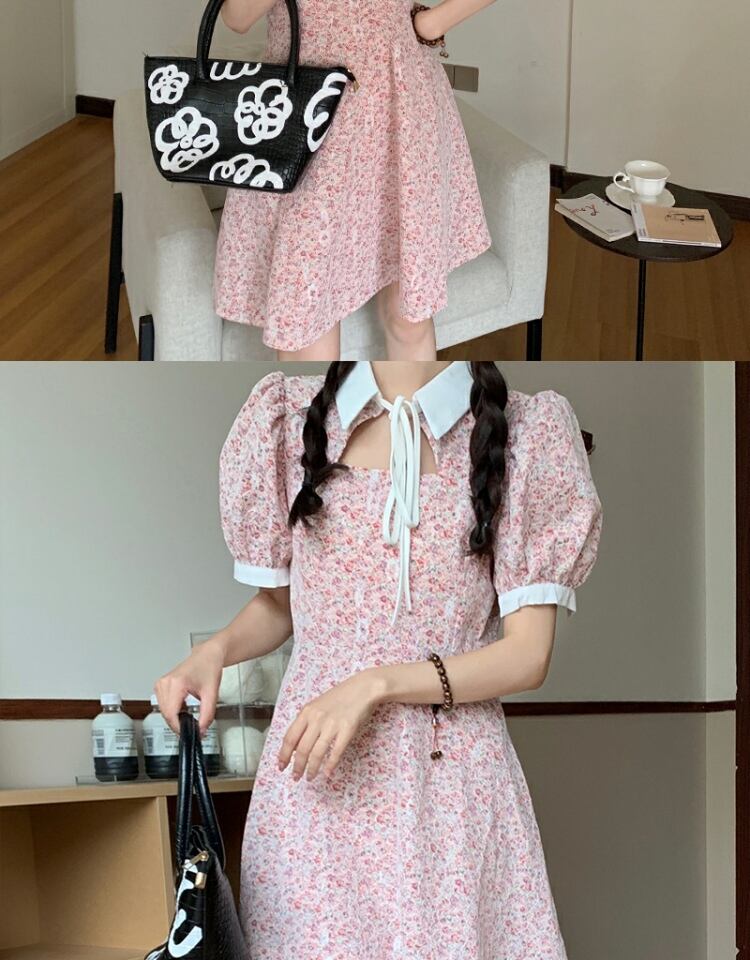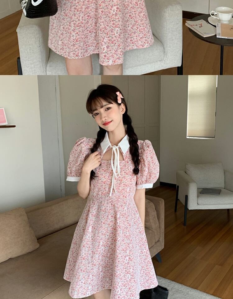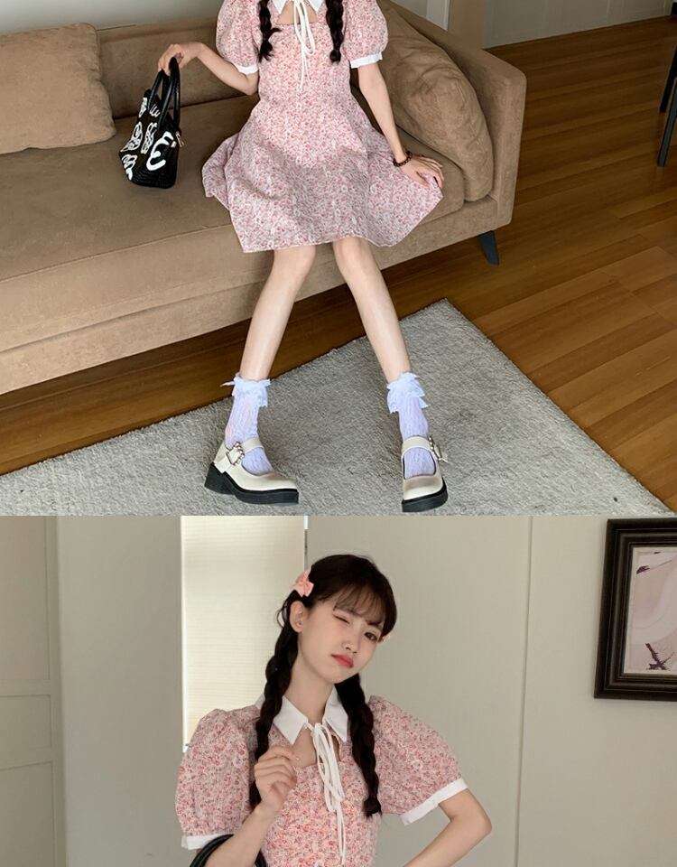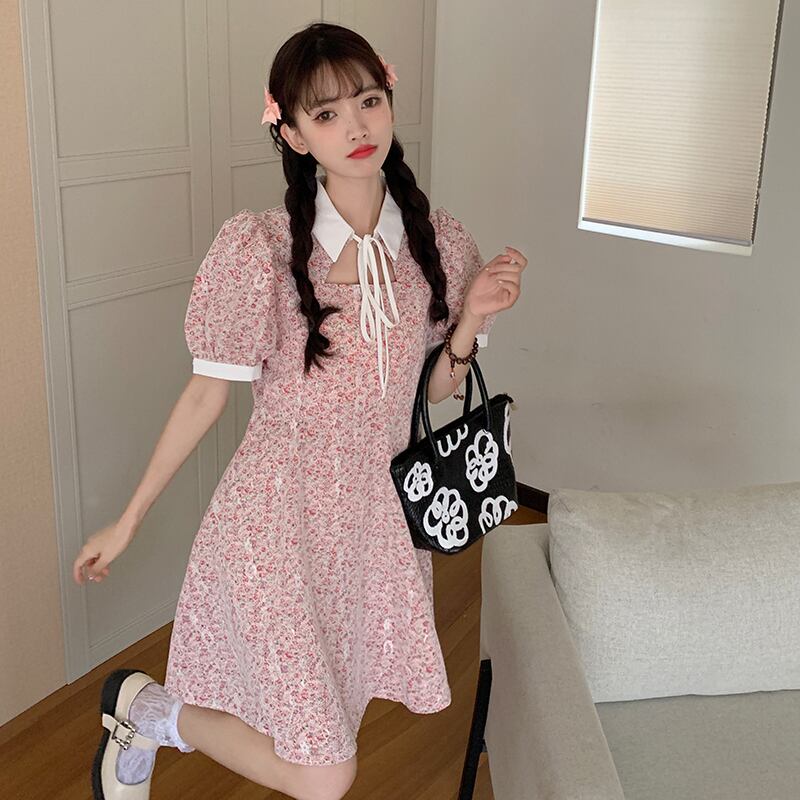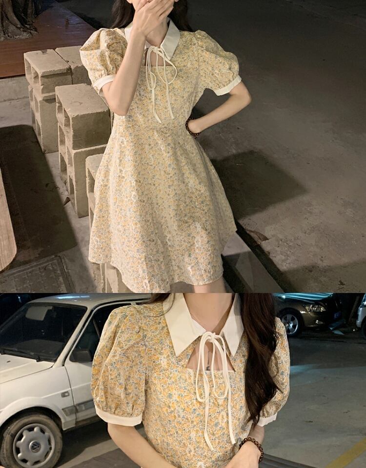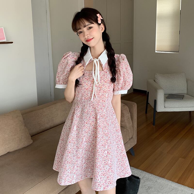 カラーレーススリーブドレス サマーフローラルスカート 夏物 花柄 萌量不足54685263911